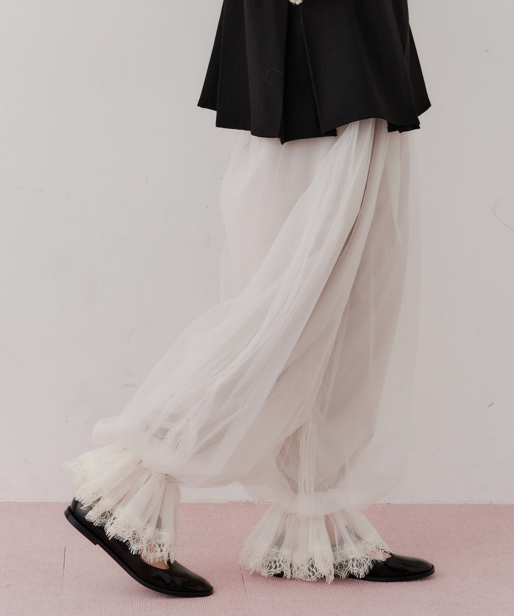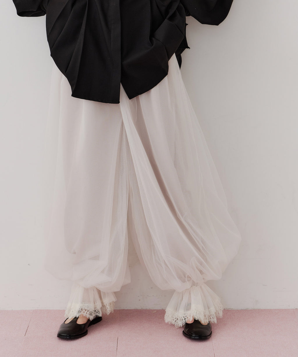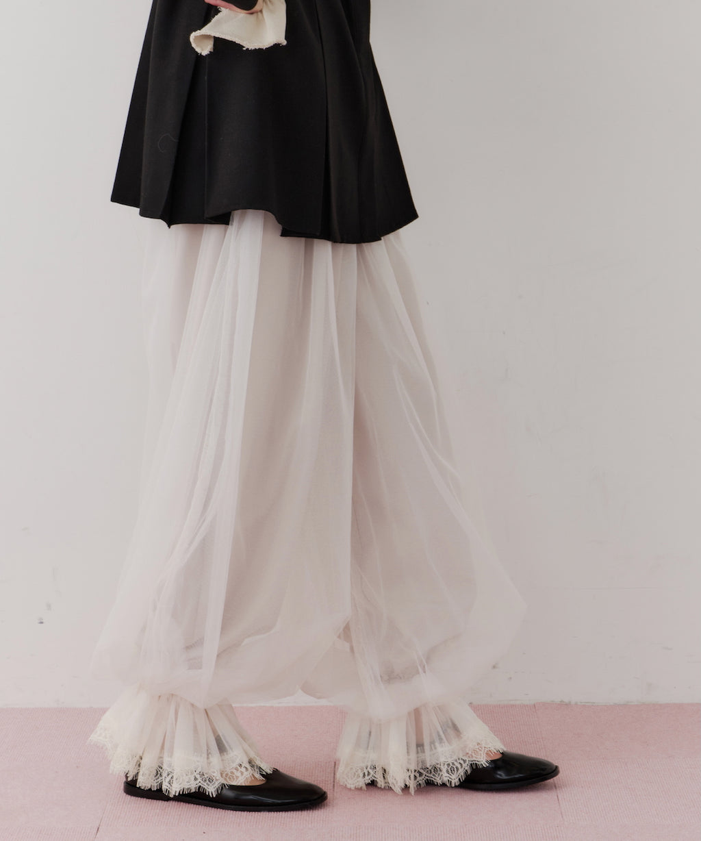 J1Uらしいチュール使いが目を惹くバルーンパンツ。