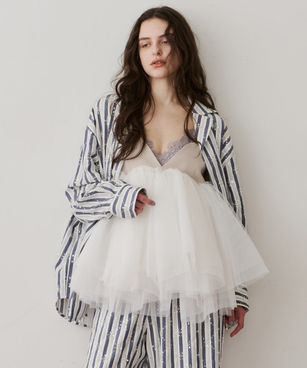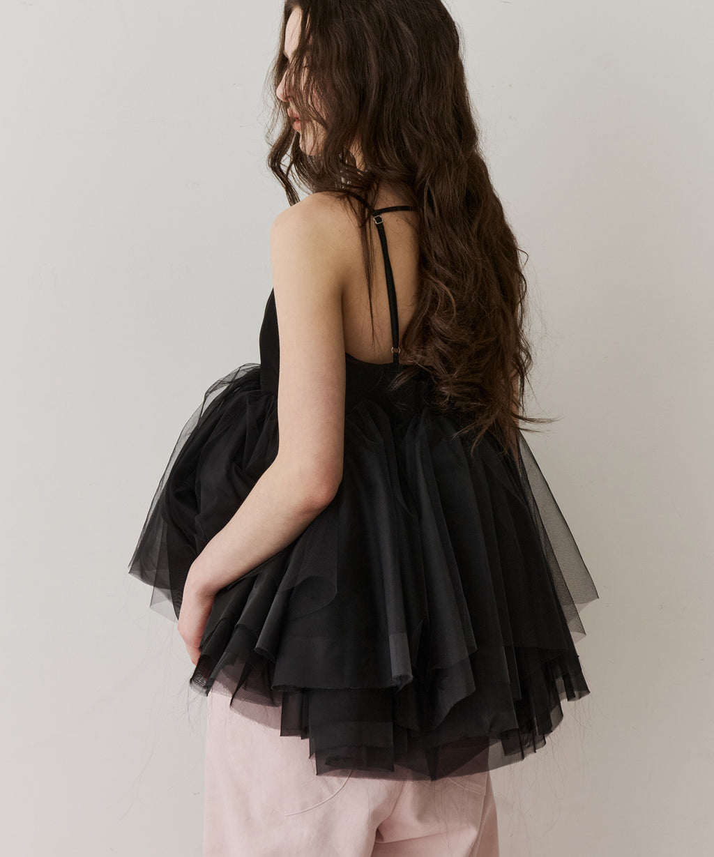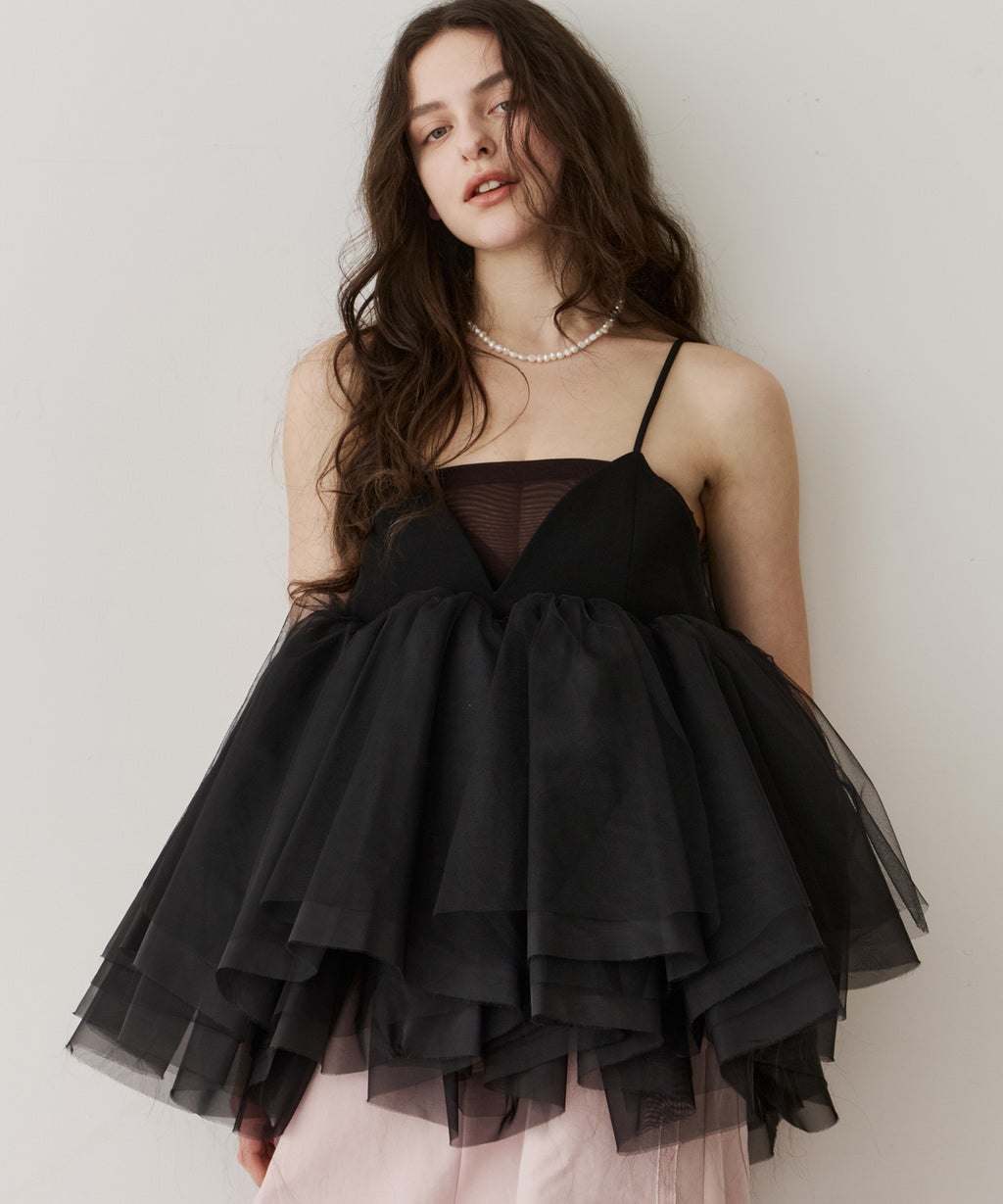 ハードチュール、オーガンジー、ソフトチュールを使ったエアリーな見え方と着心地がポイント。