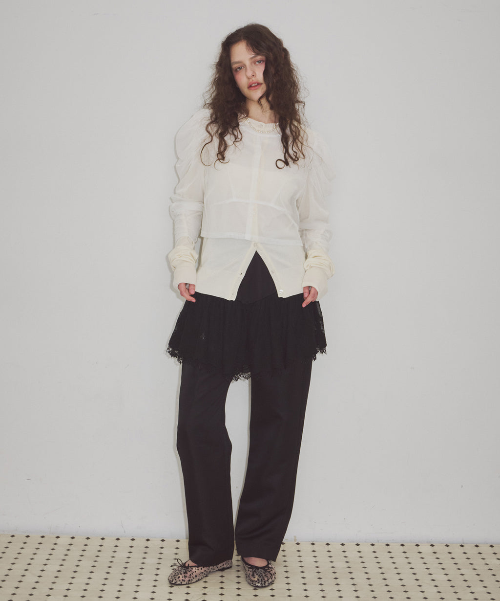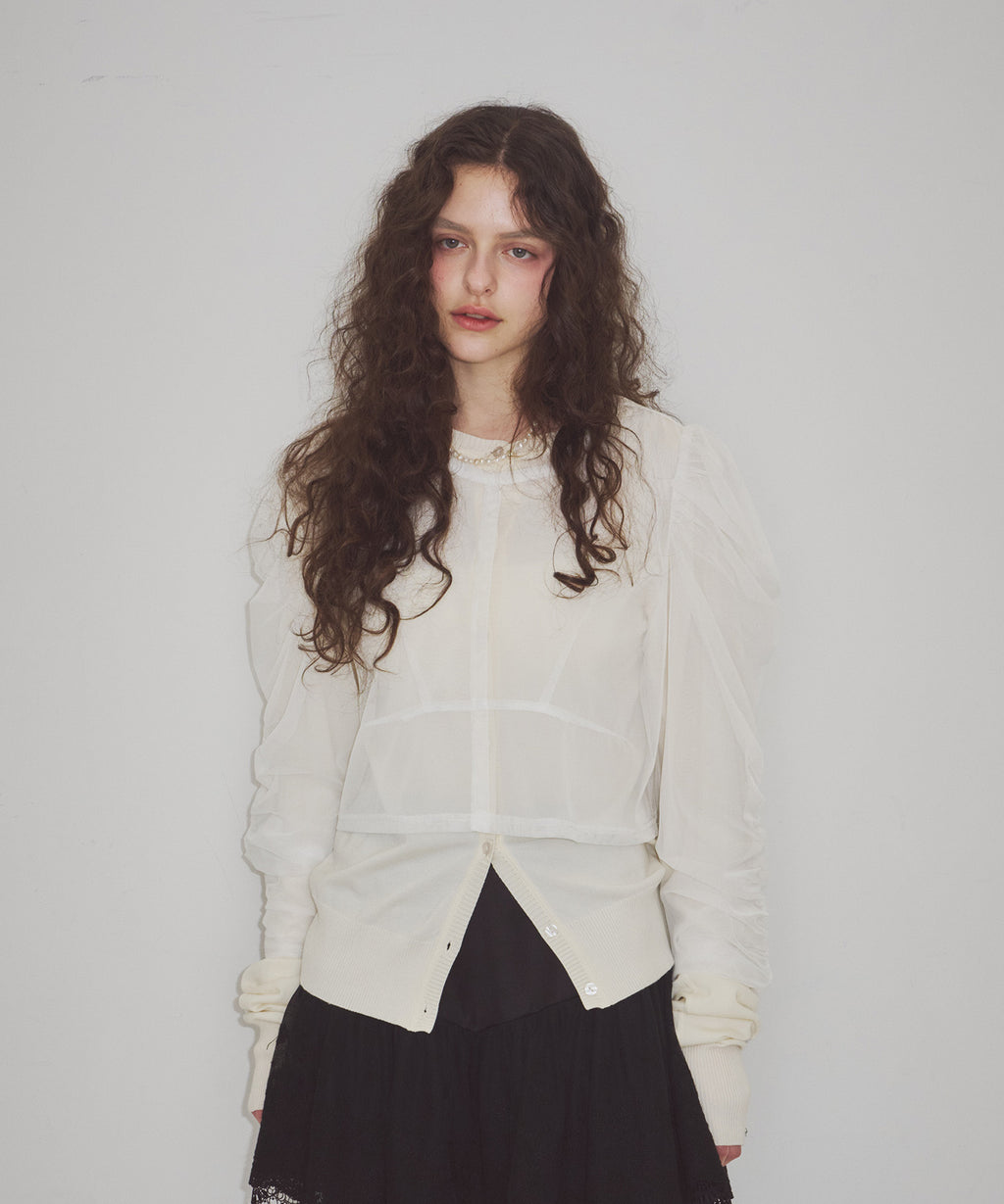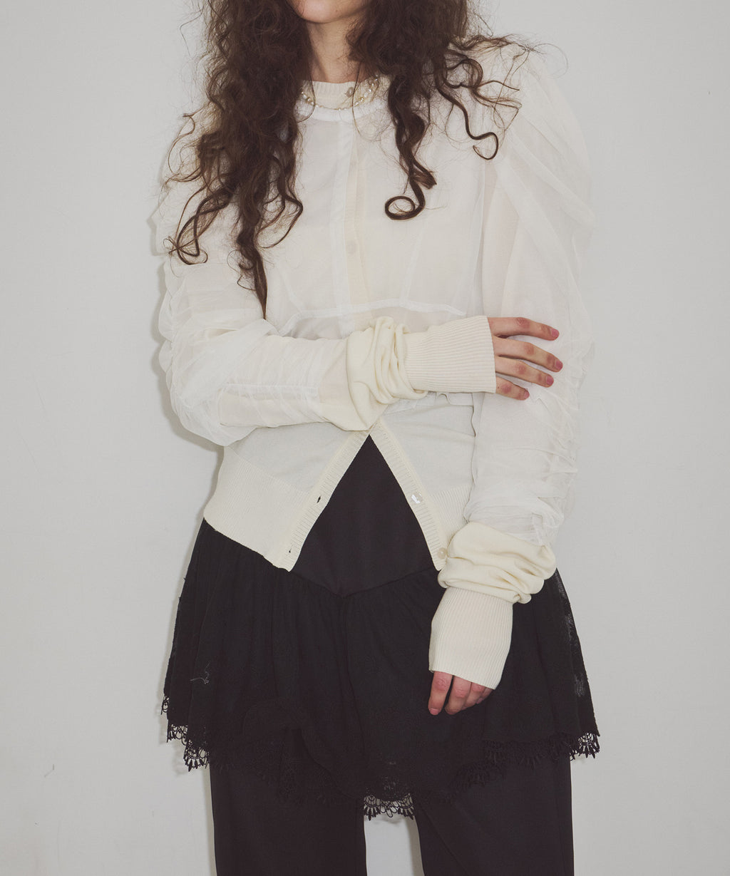 ライトなチュールトップスと、薄手ニットのカーディガン。