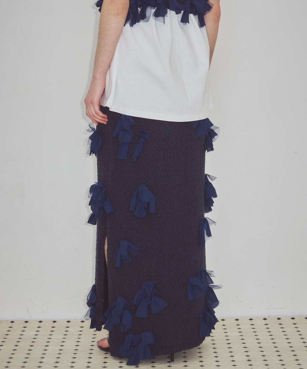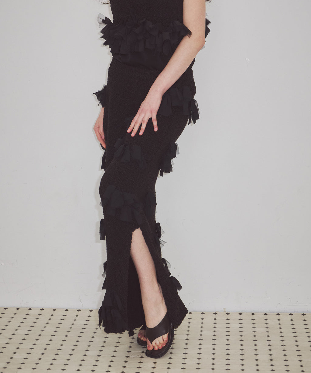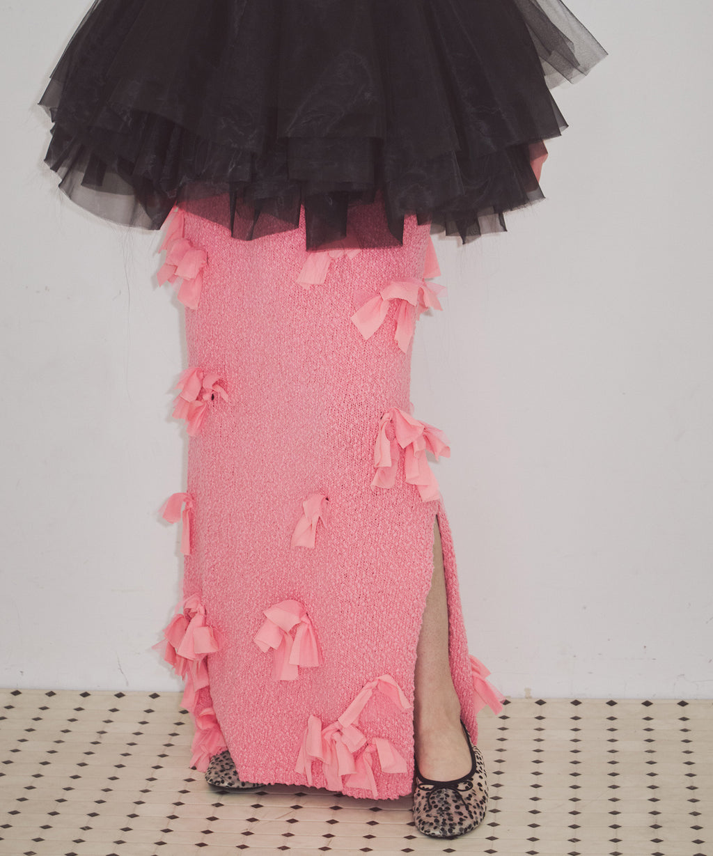 スカートも短冊状にカットしたチュールとシフォンを通して1つ1つ手で結んでリボンをつけています。