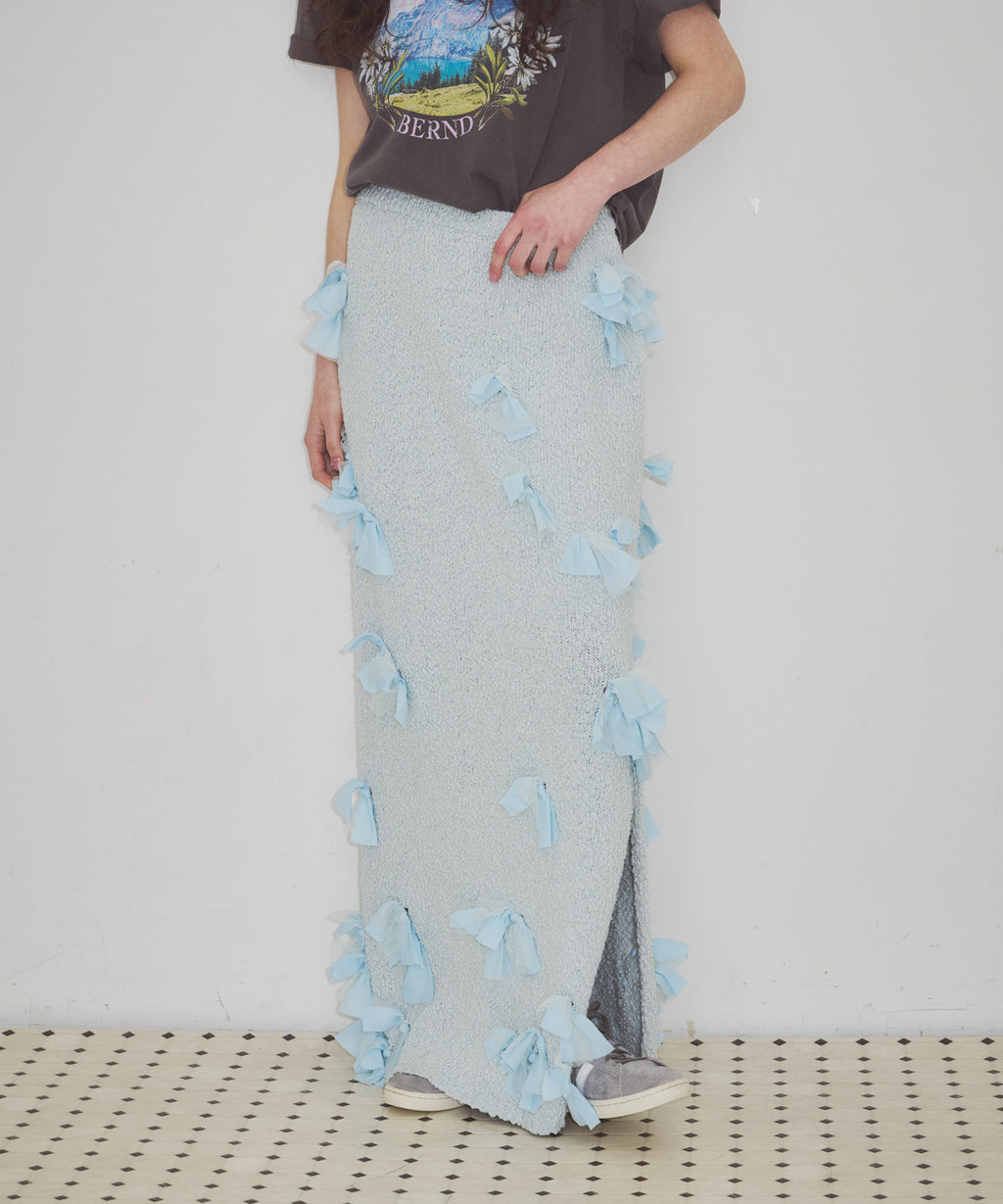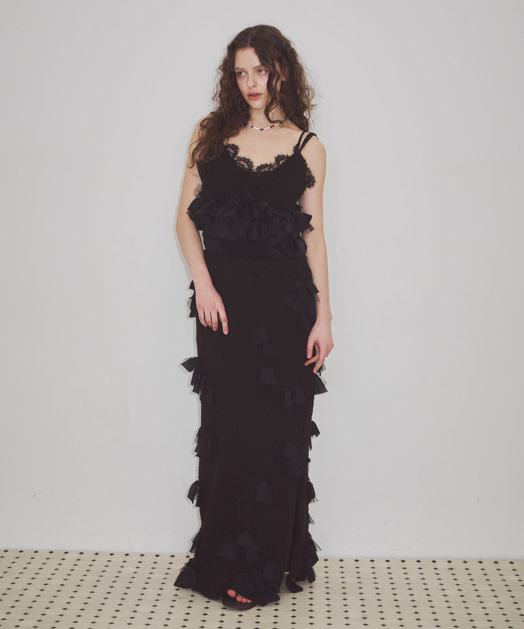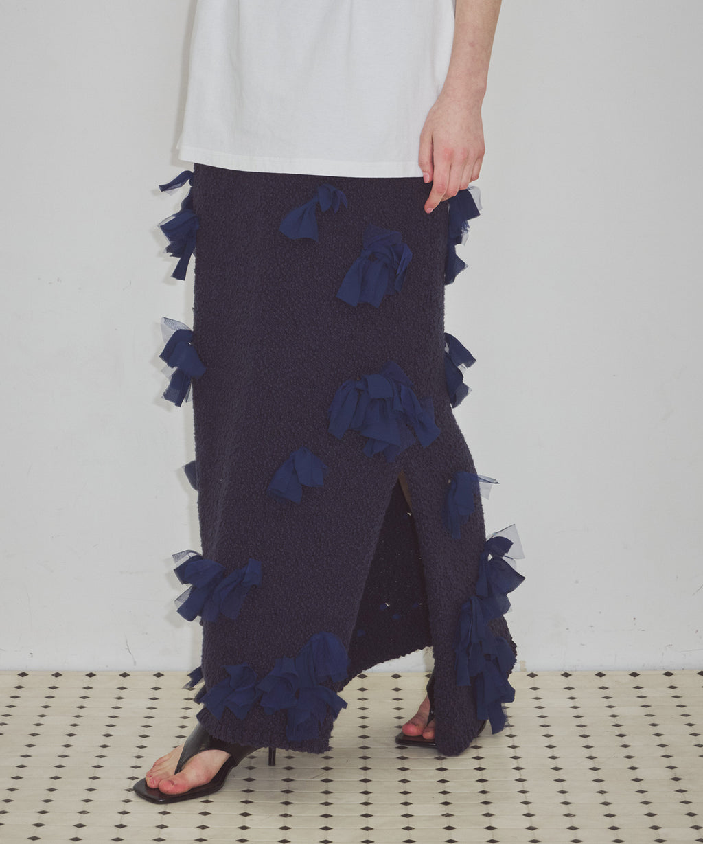 スカートも短冊状にカットしたチュールとシフォンを通して1つ1つ手で結んでリボンをつけています。