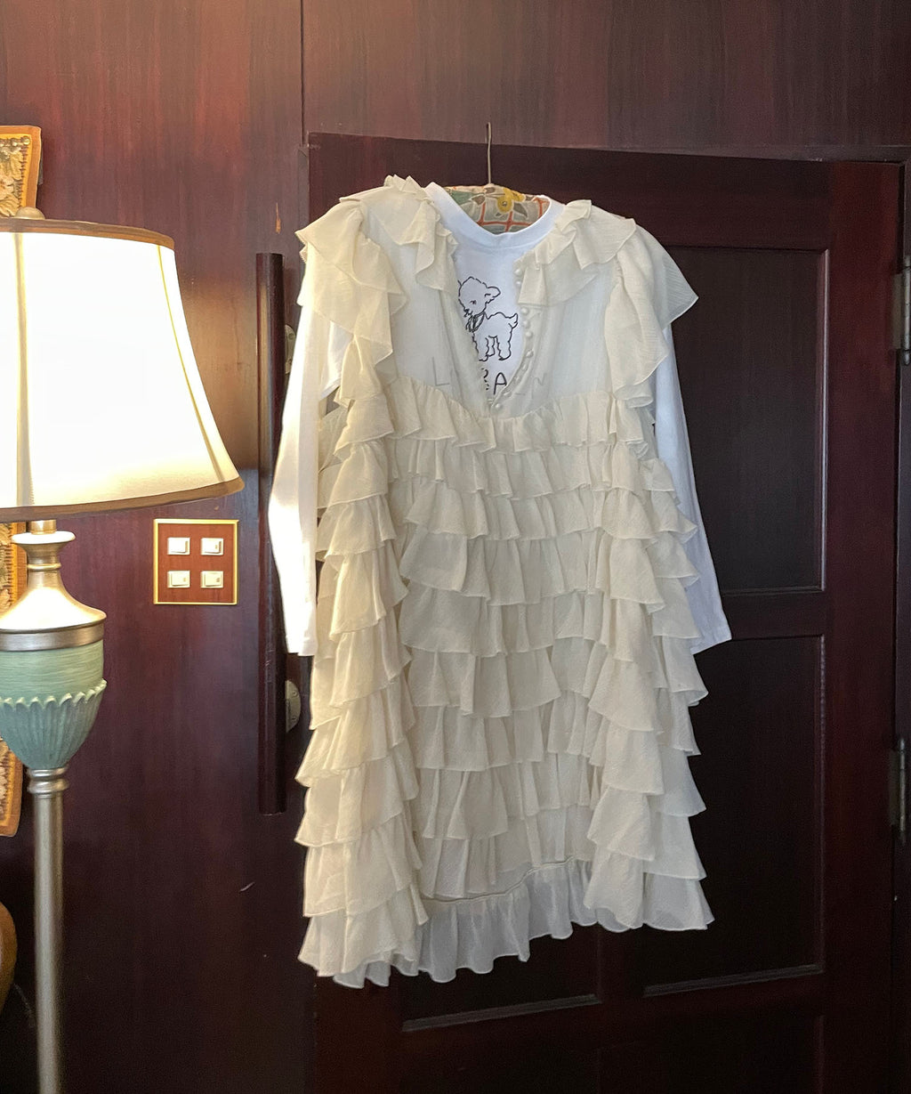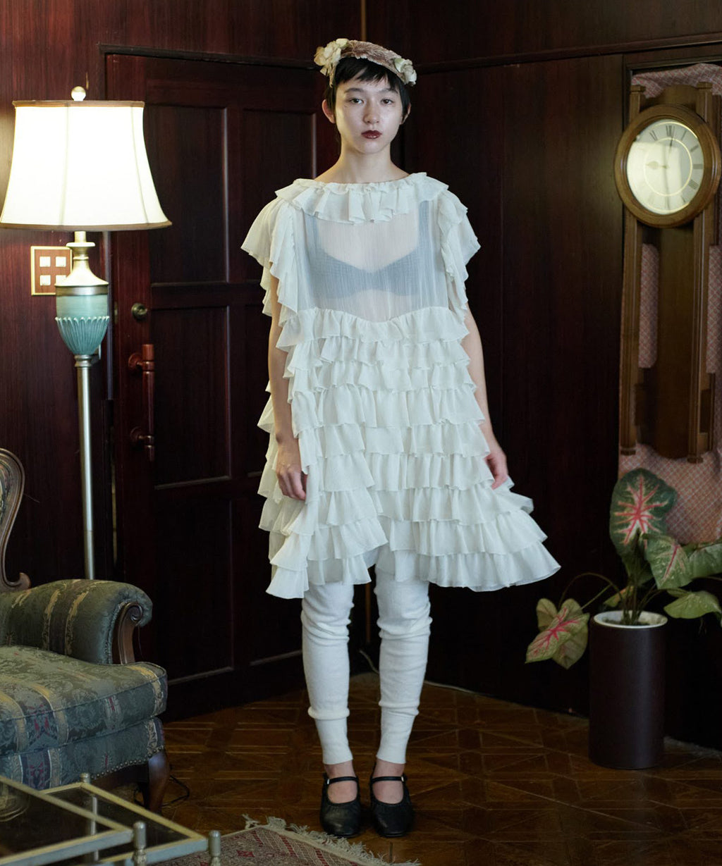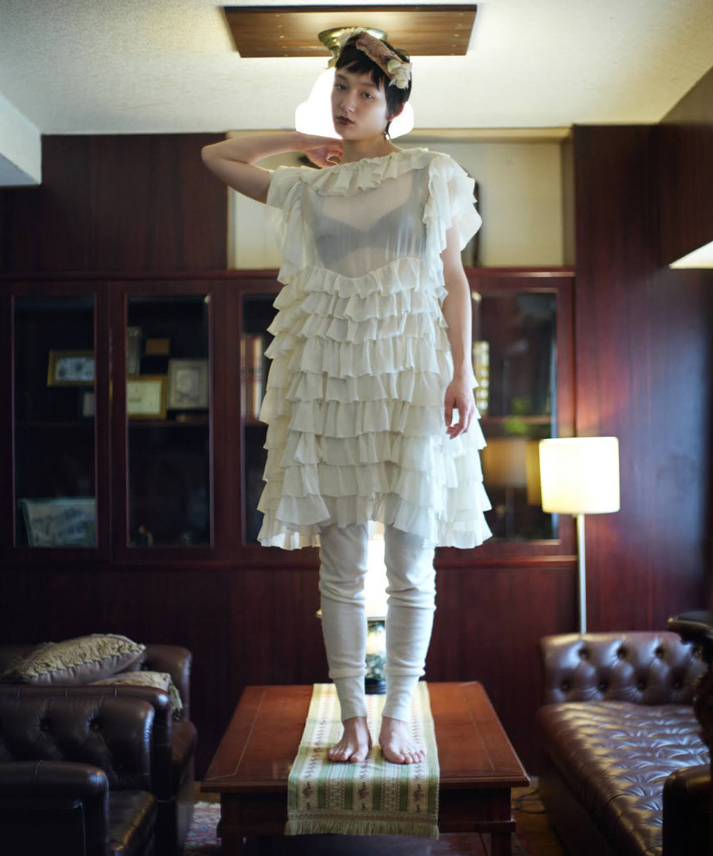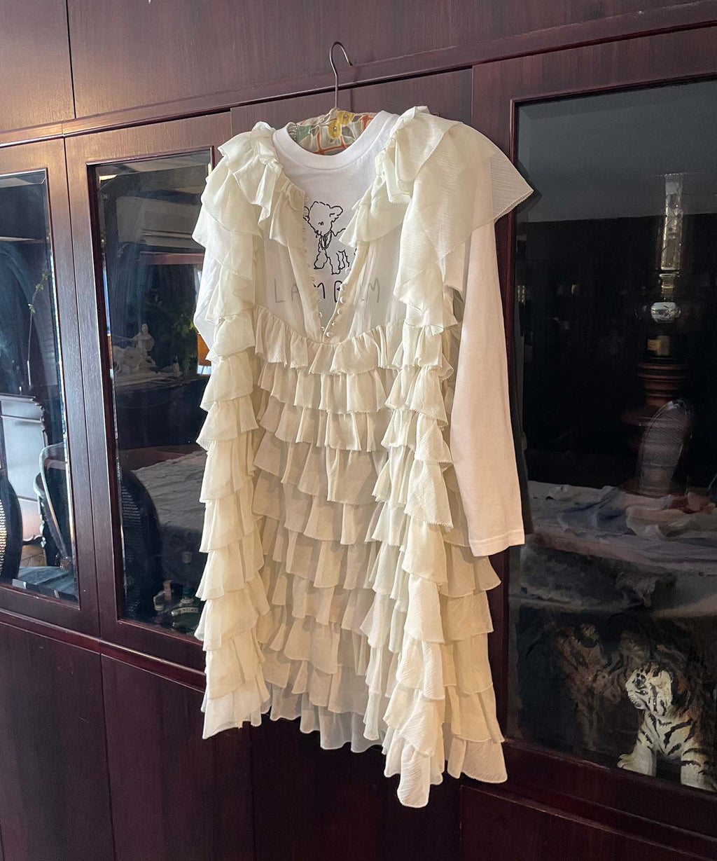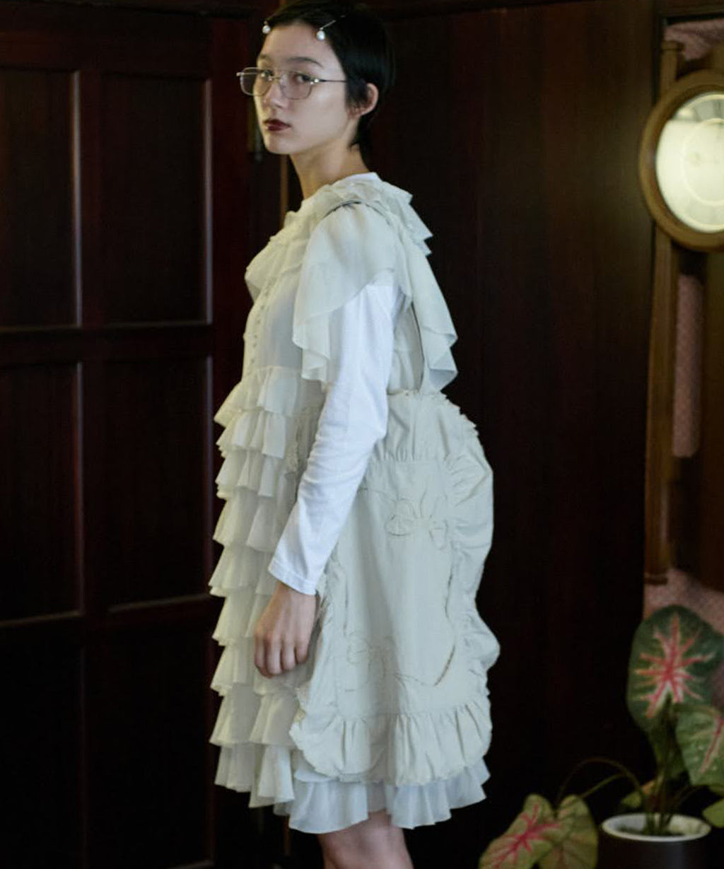 アンティークの子供しか着れないフリルが贅沢なワンピースを大人でも着れるサイズ感に再現。