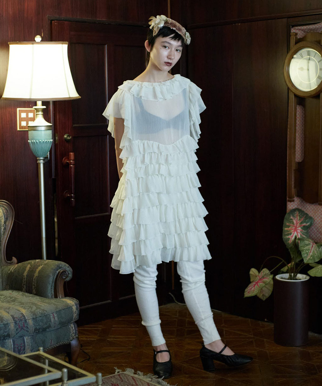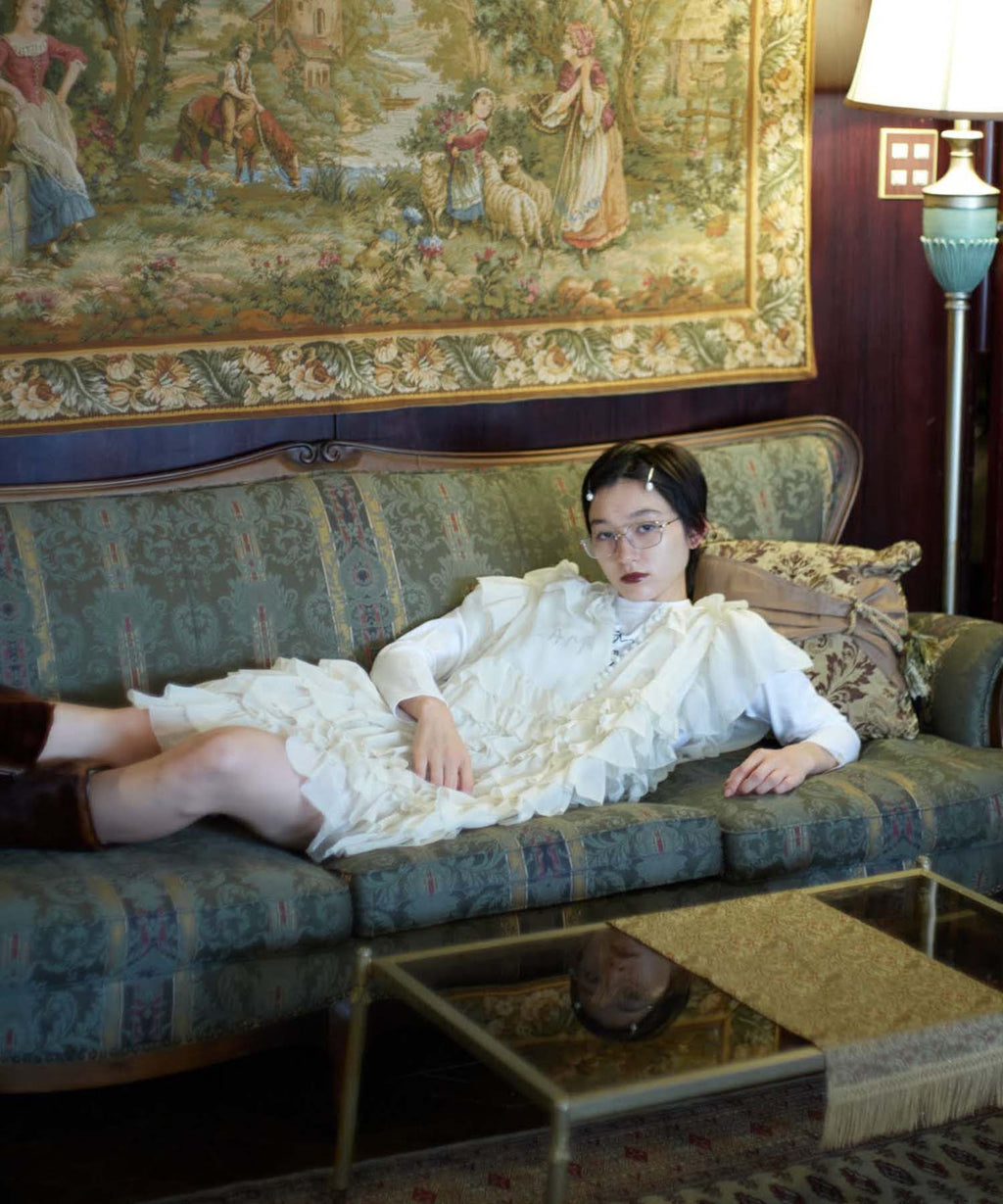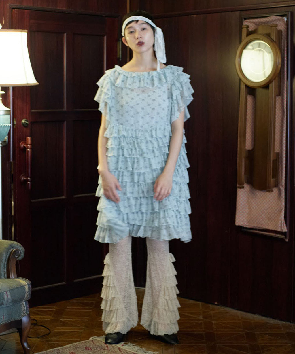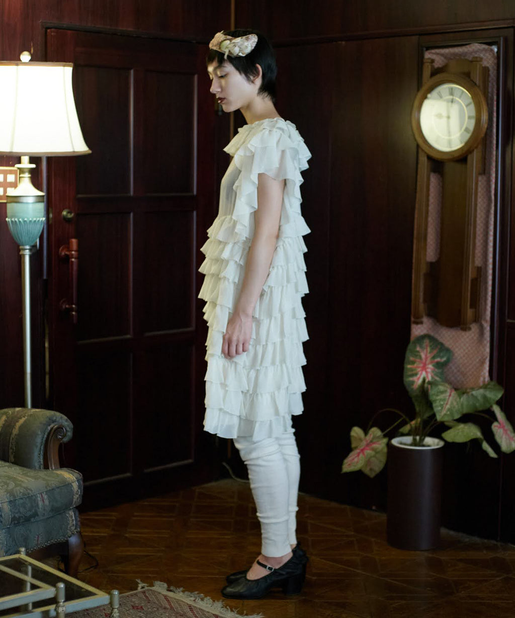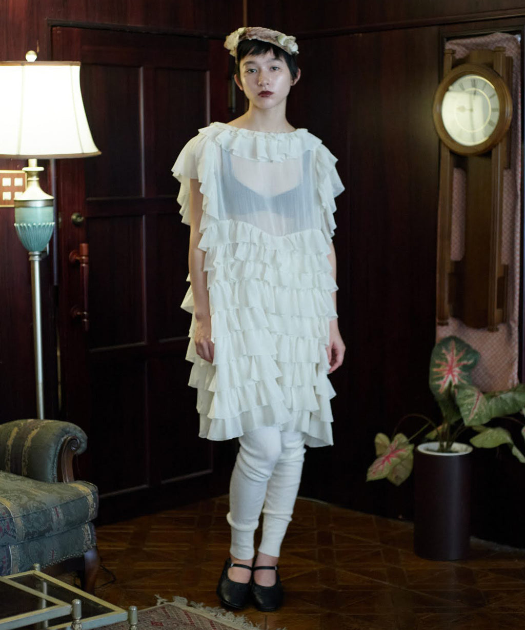 アンティークの子供しか着れないフリルが贅沢なワンピースを大人でも着れるサイズ感に再現。