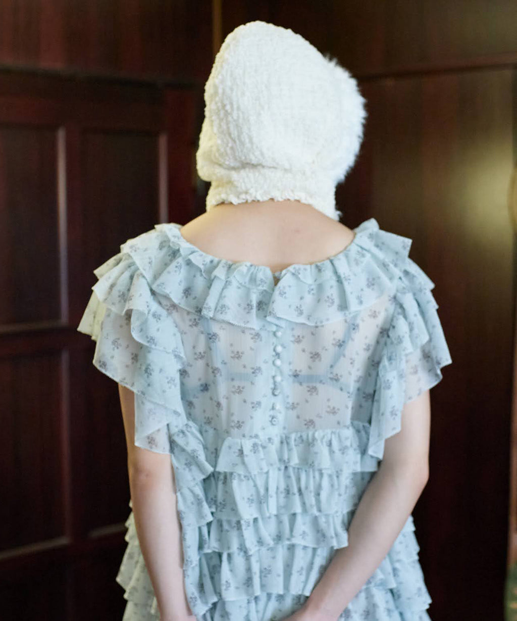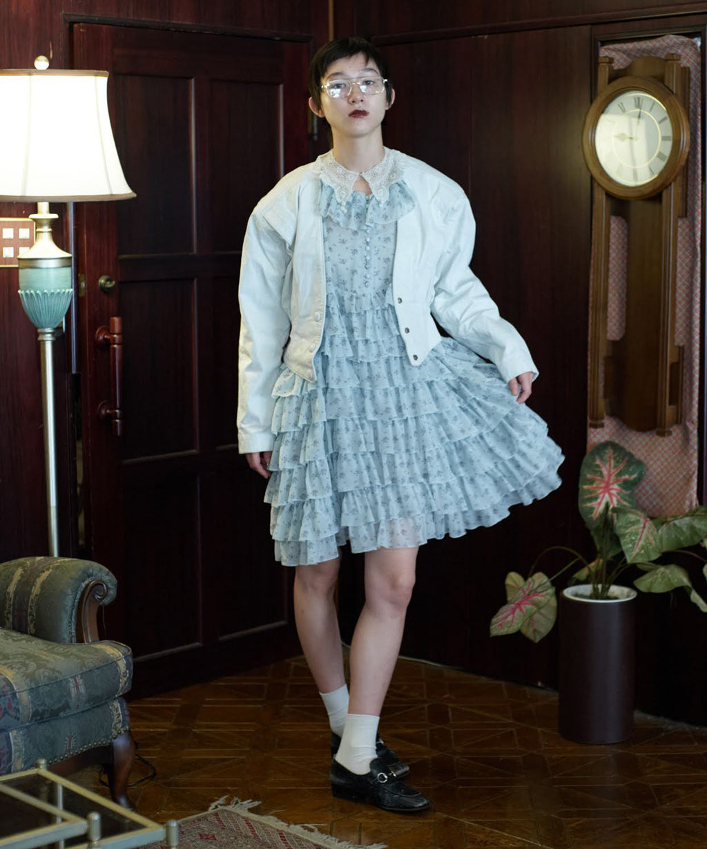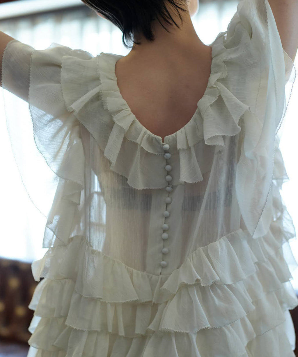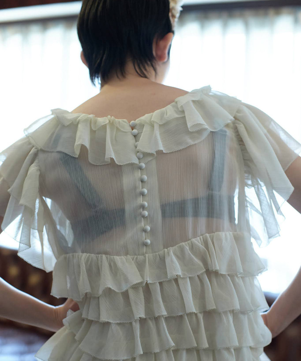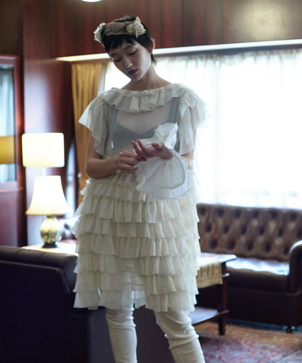 アンティークの子供しか着れないフリルが贅沢なワンピースを大人でも着れるサイズ感に再現。