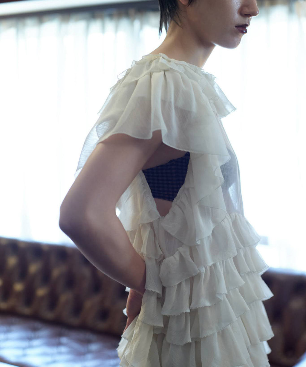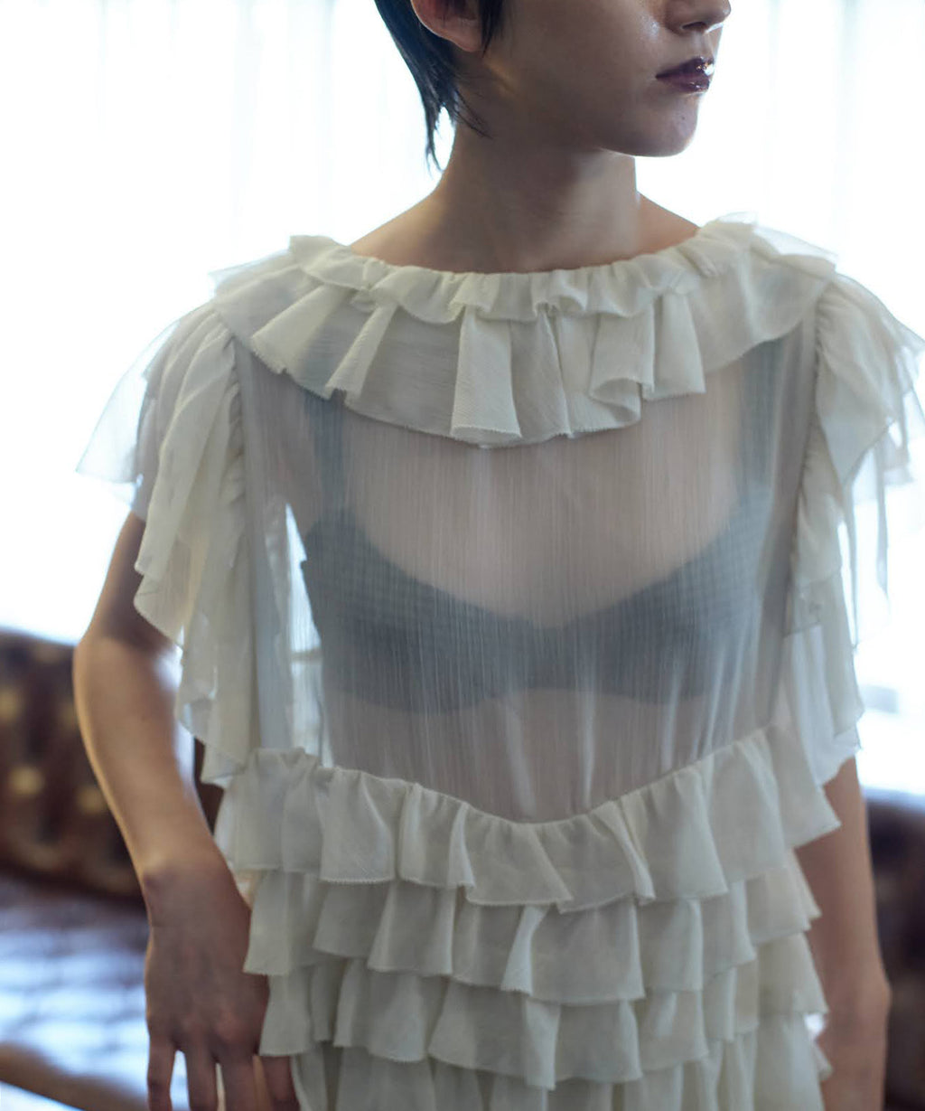透け感を敢えてカジュアルなTシャツなどとレイアードしてみせるのもかわいいです◎