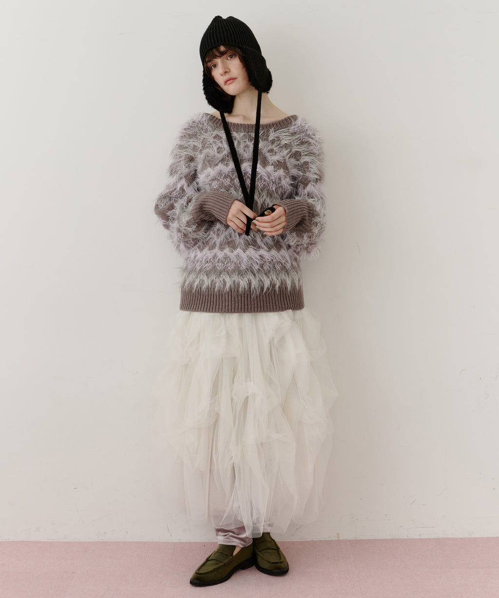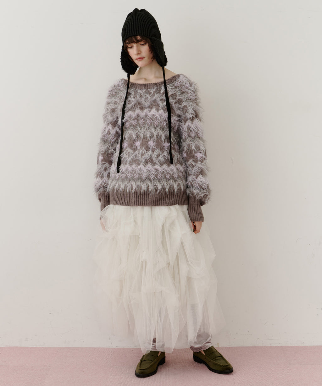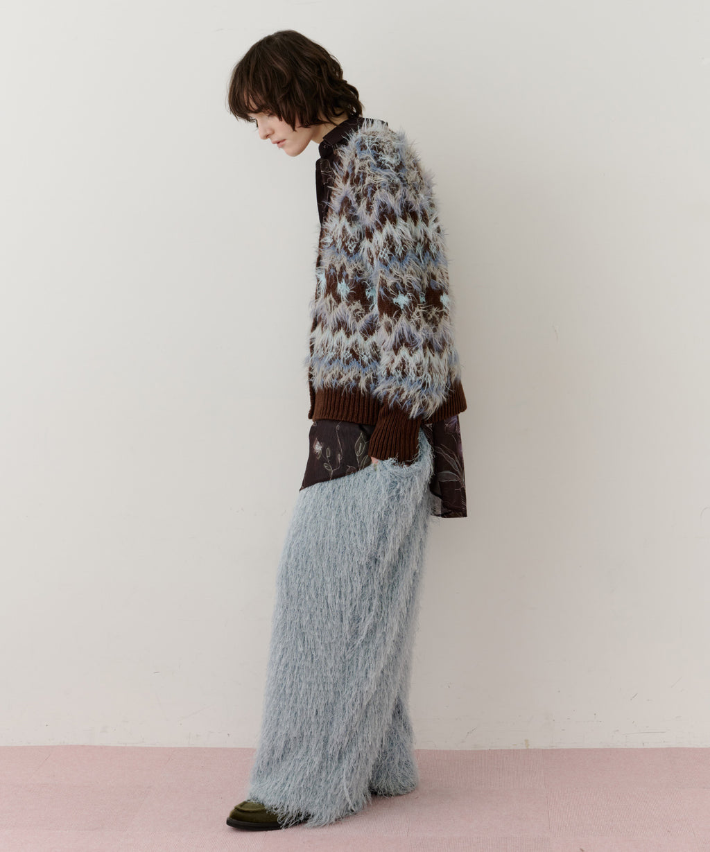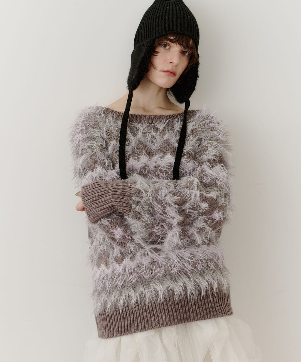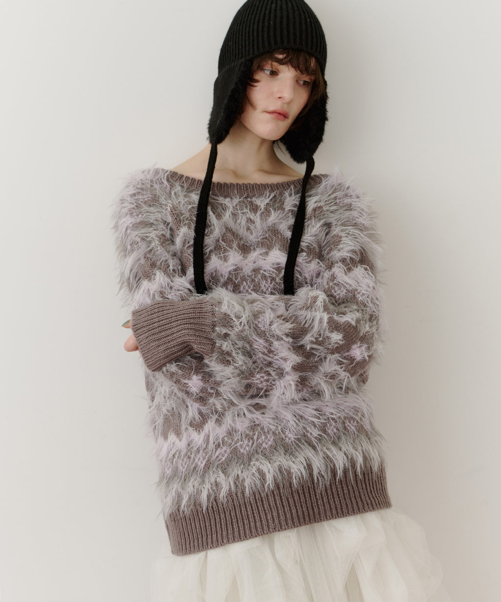 フェザーとウェーブ感のある糸を合わせることで、色差がでて奥行きのある色合いが完成。