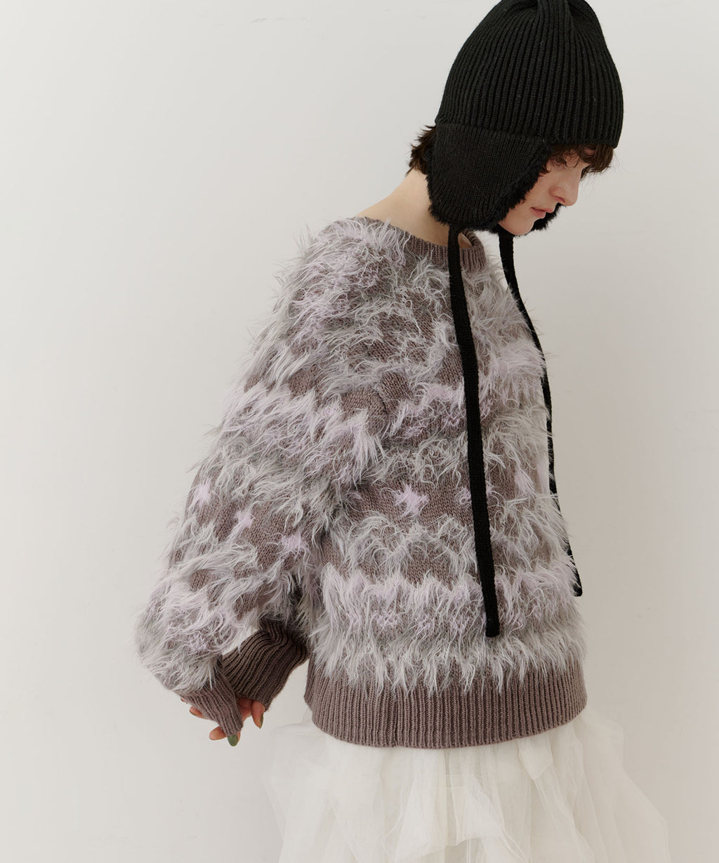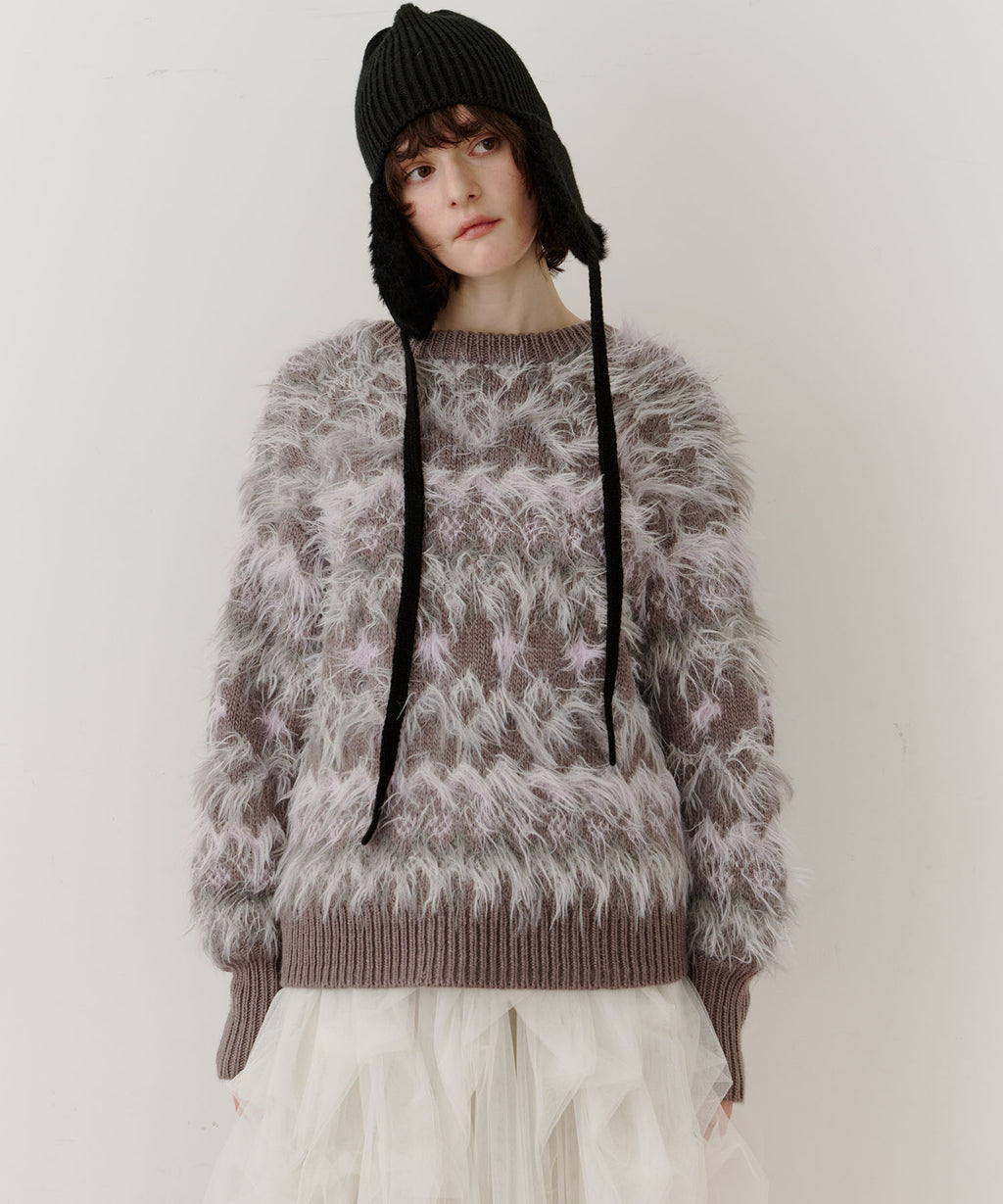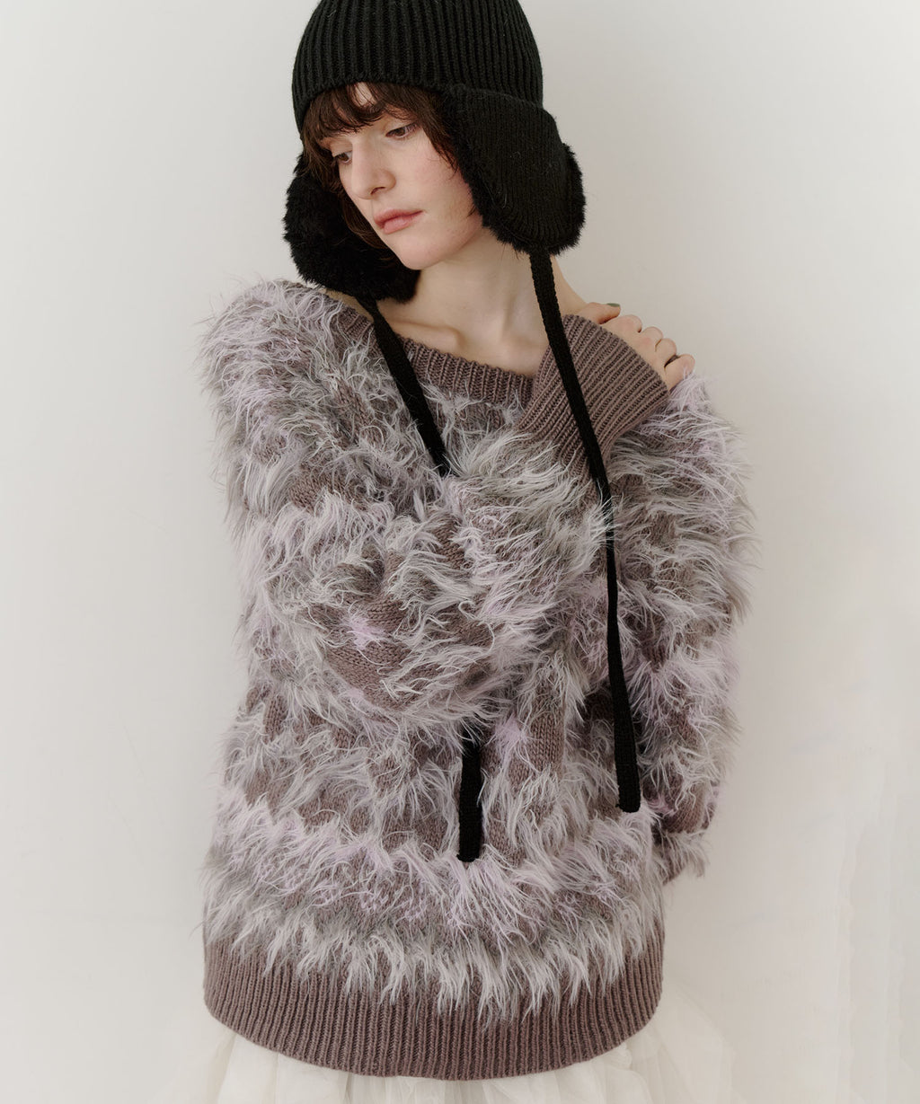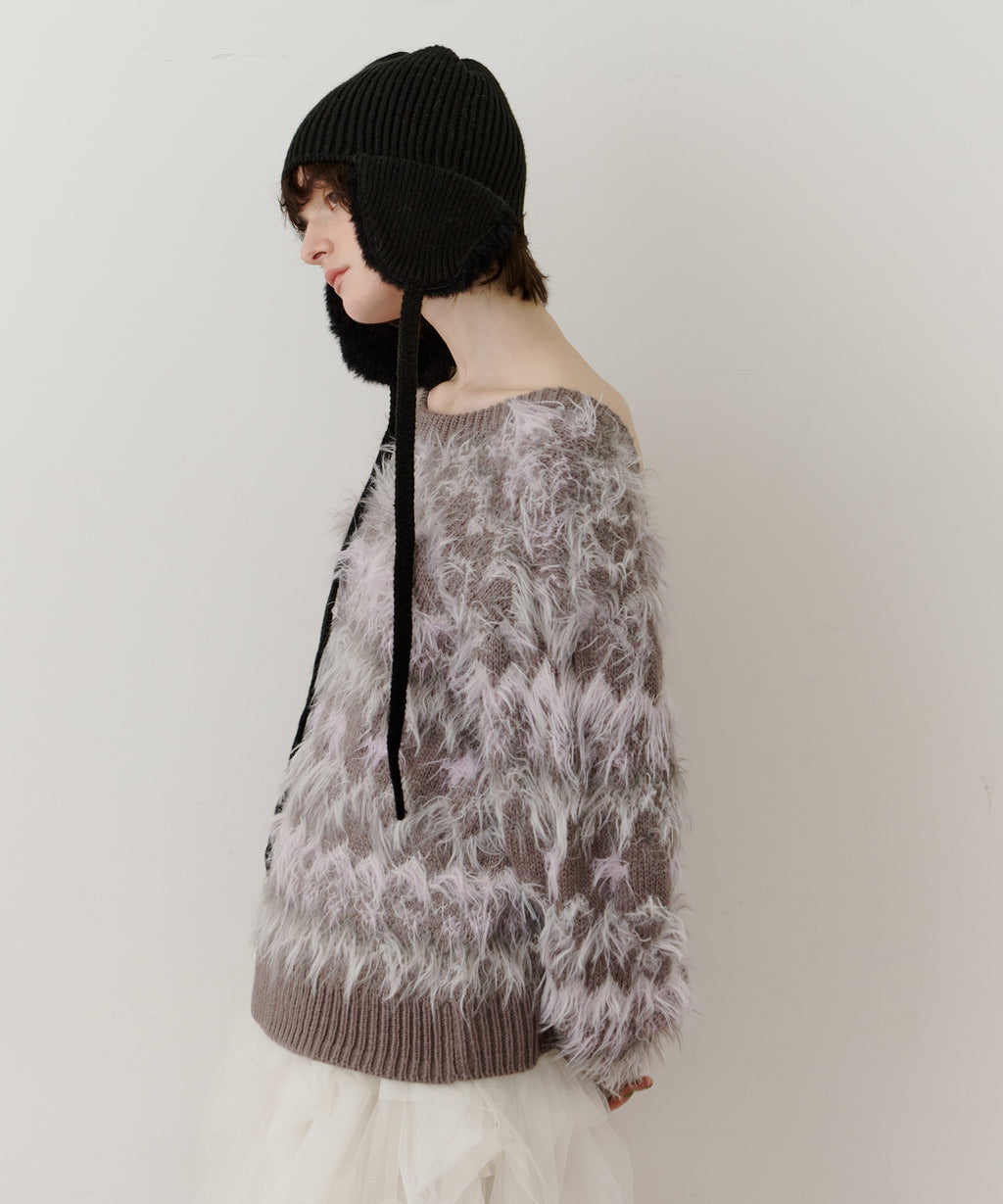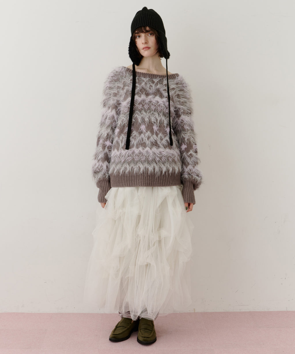 フェザーとウェーブ感のある糸を合わせることで、色差がでて奥行きのある色合いが完成。