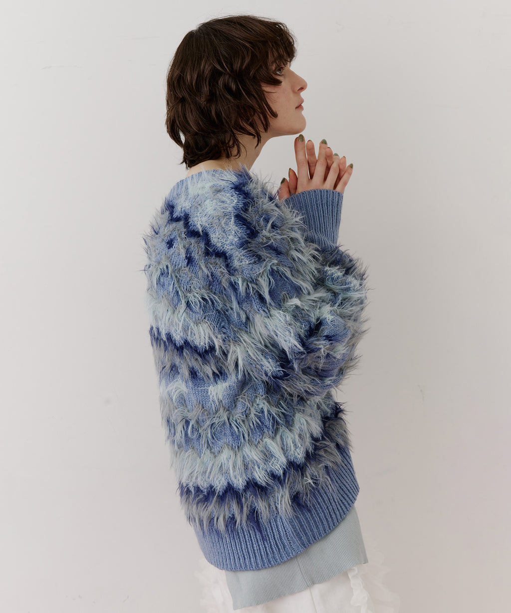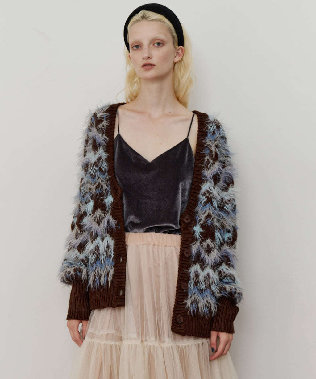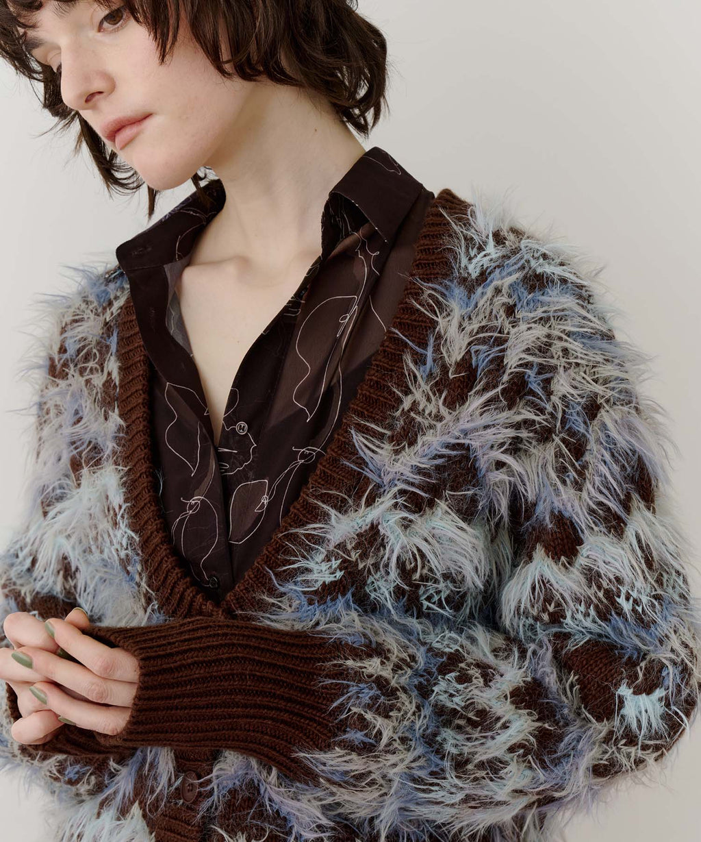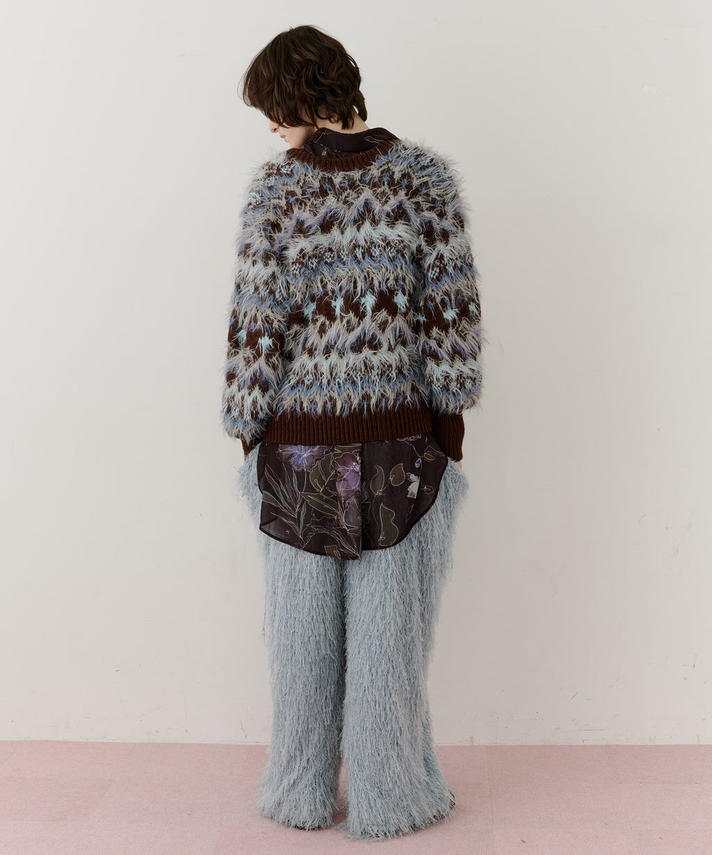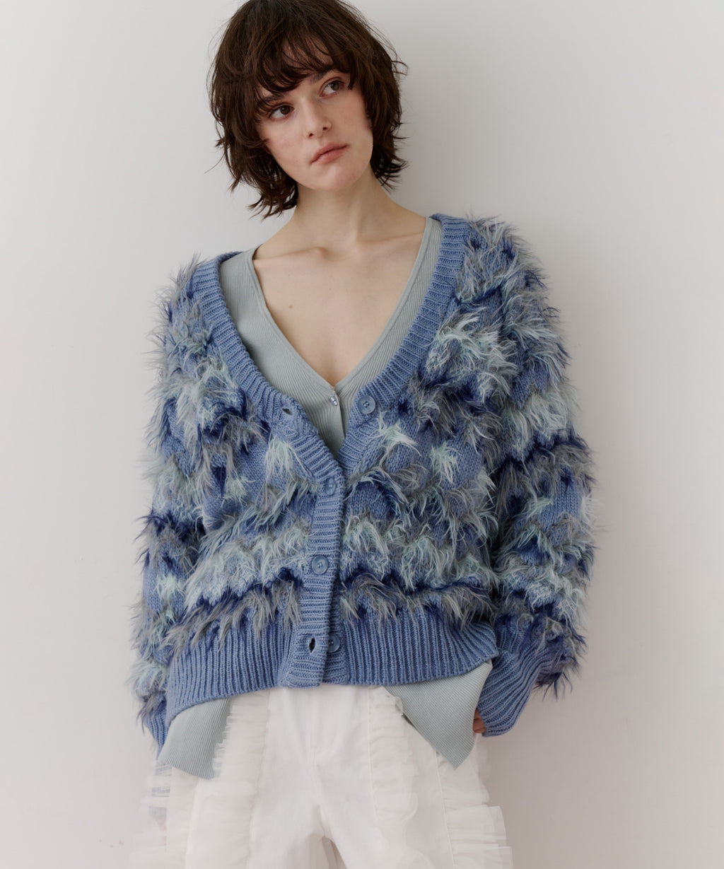 フェザーとウェーブ感のある糸を合わせることで、色差がでて奥行きのある色合いが完成。