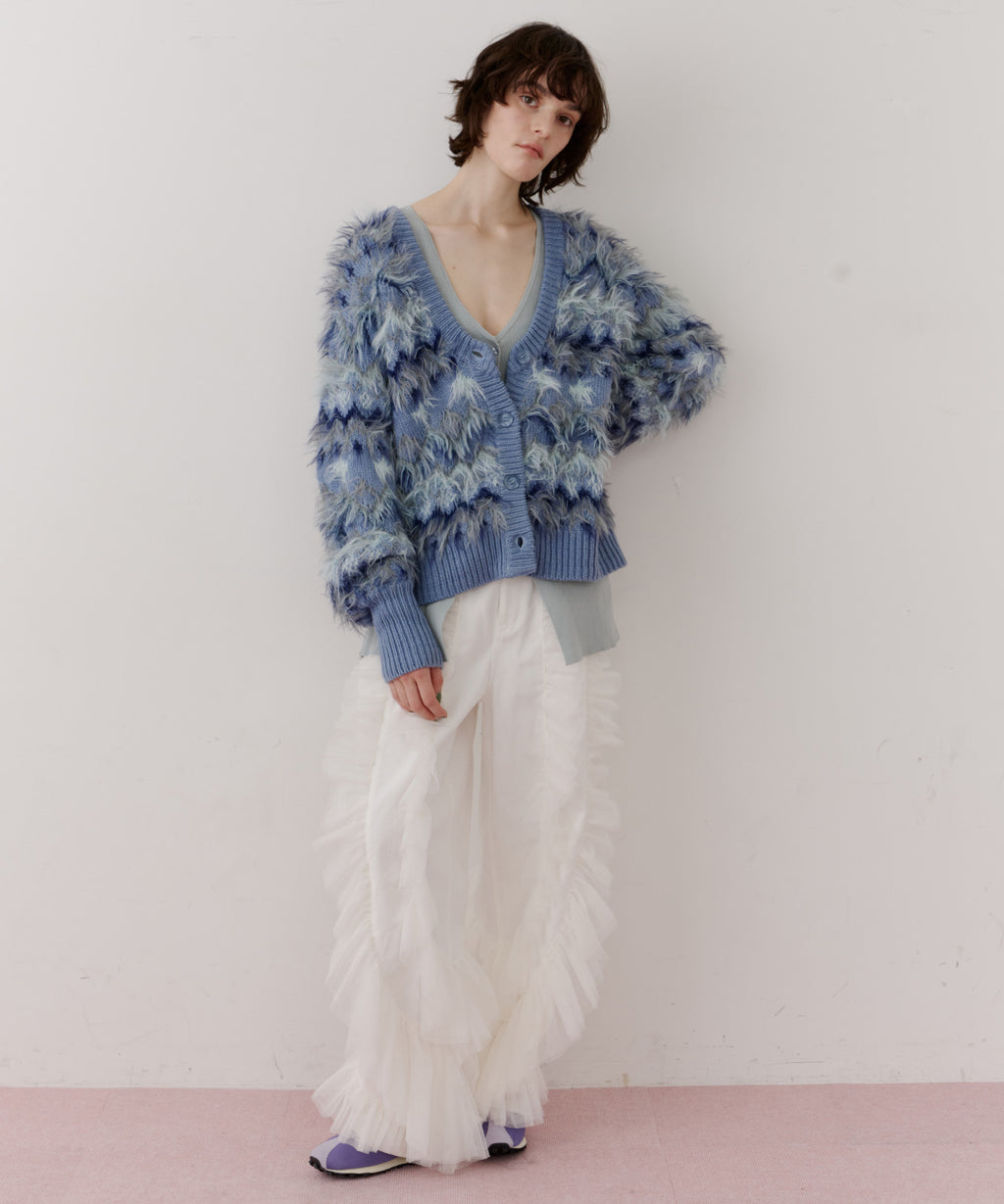 毛足の長いフェザーとウェーブ感のある糸を組み合わせたニット糸。