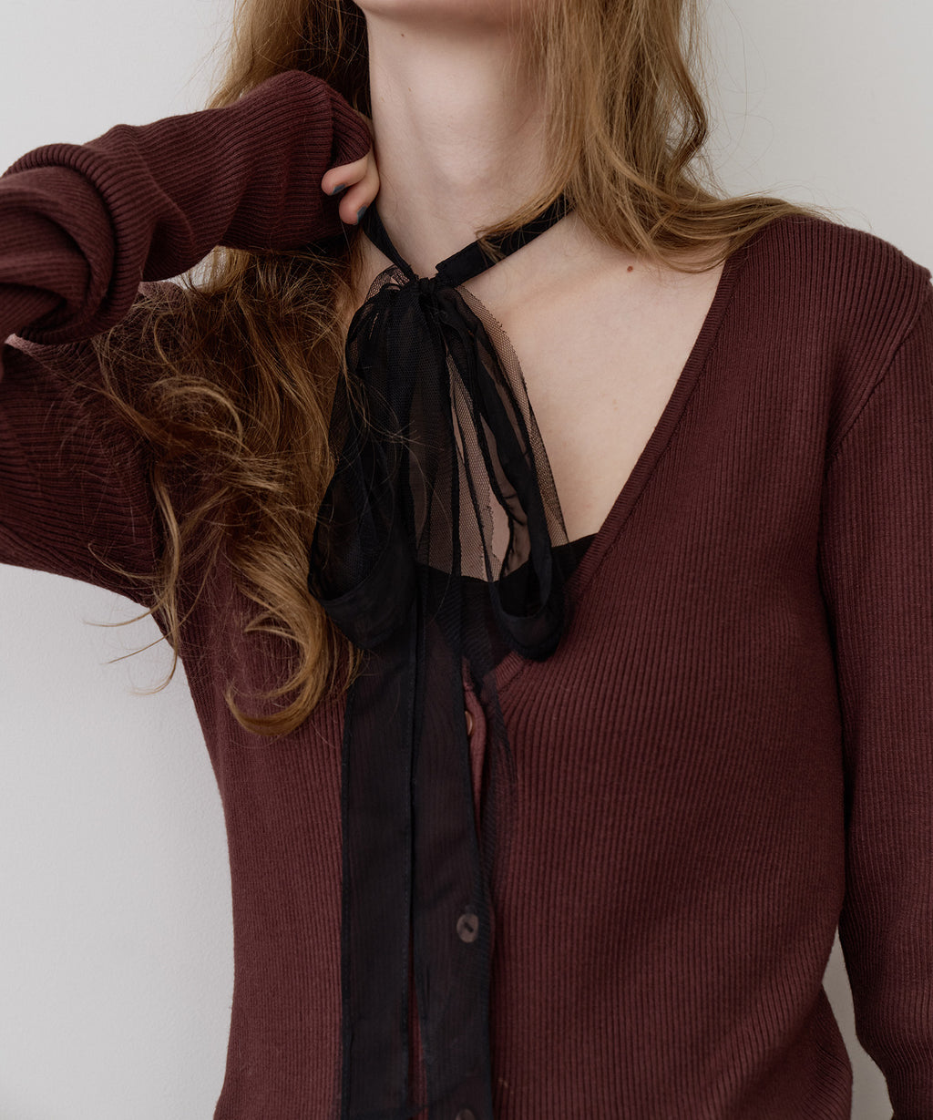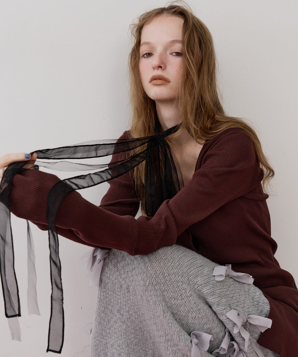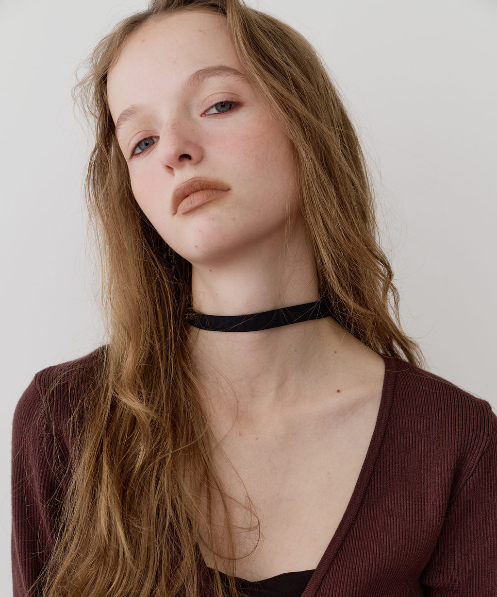 スタイリングのアクセントになる細めリボンのチョーカー。