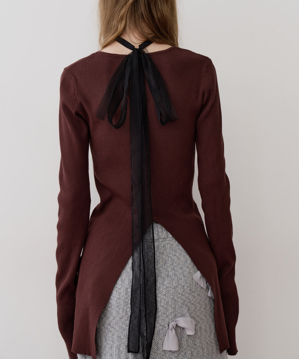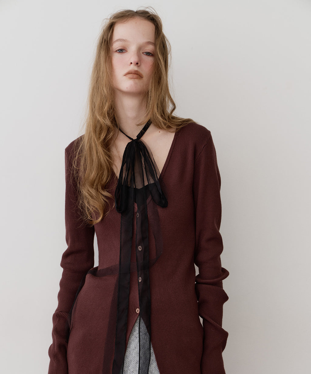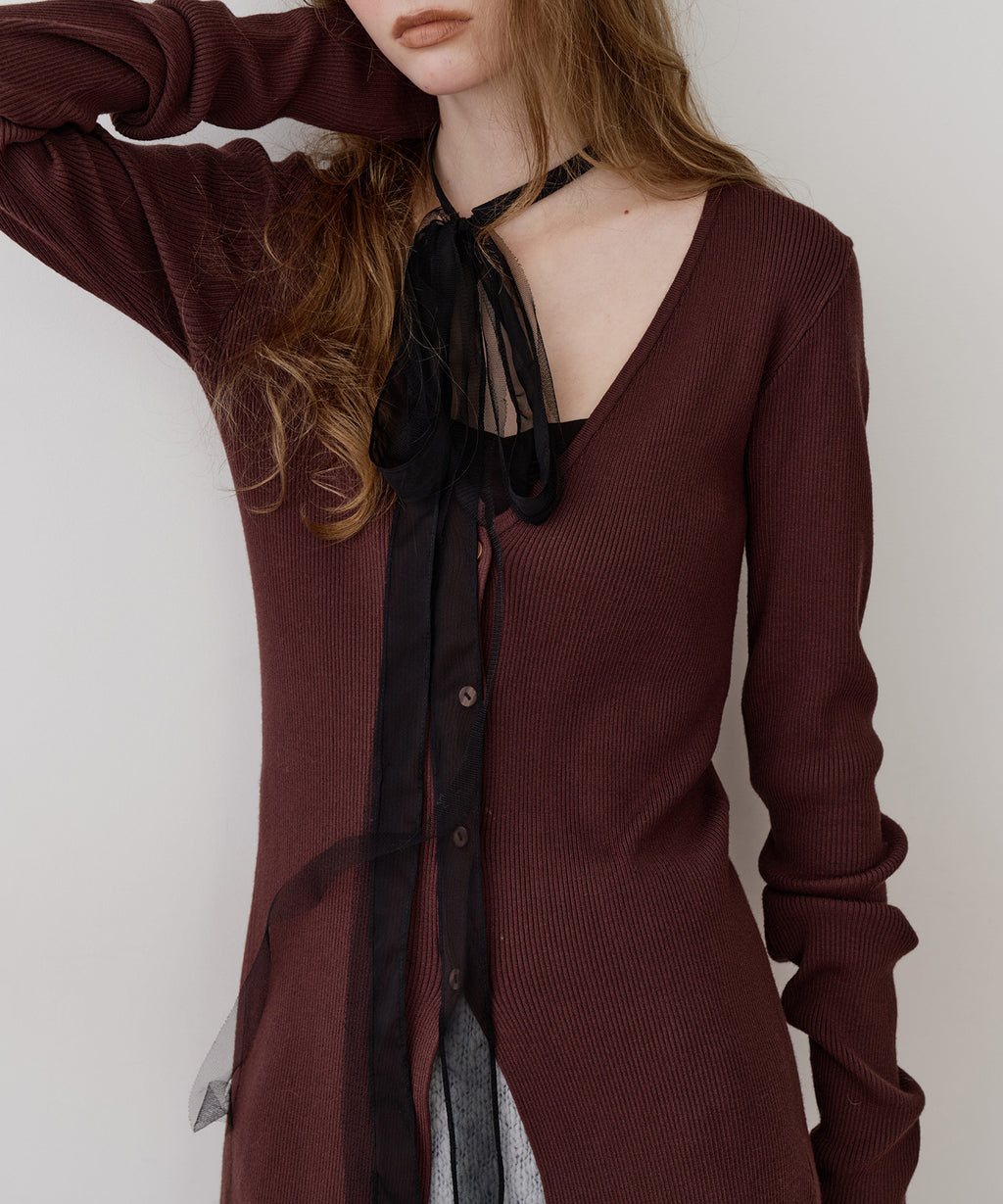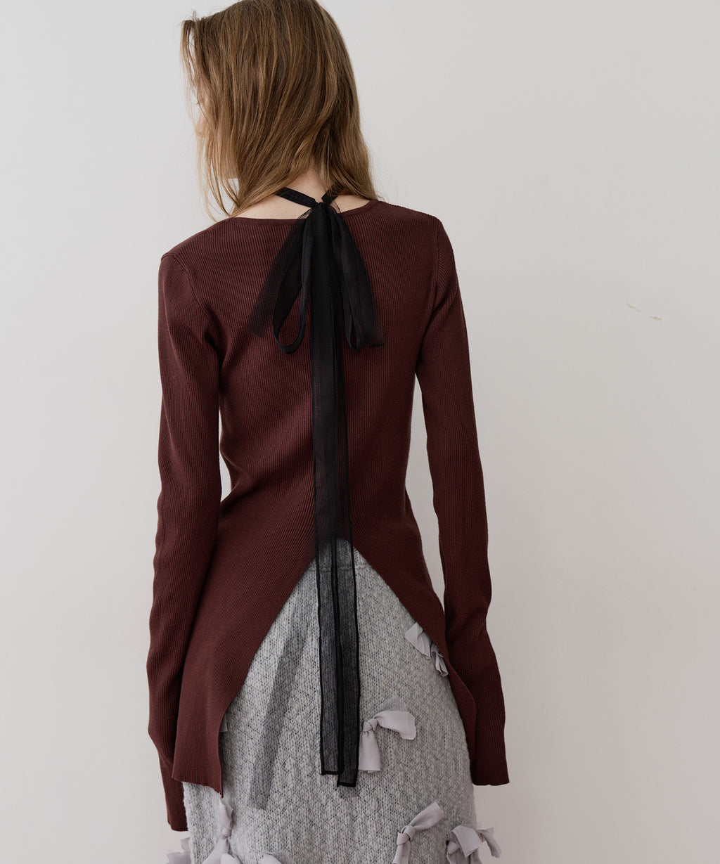 スタイリングのアクセントになる細めリボンのチョーカー。