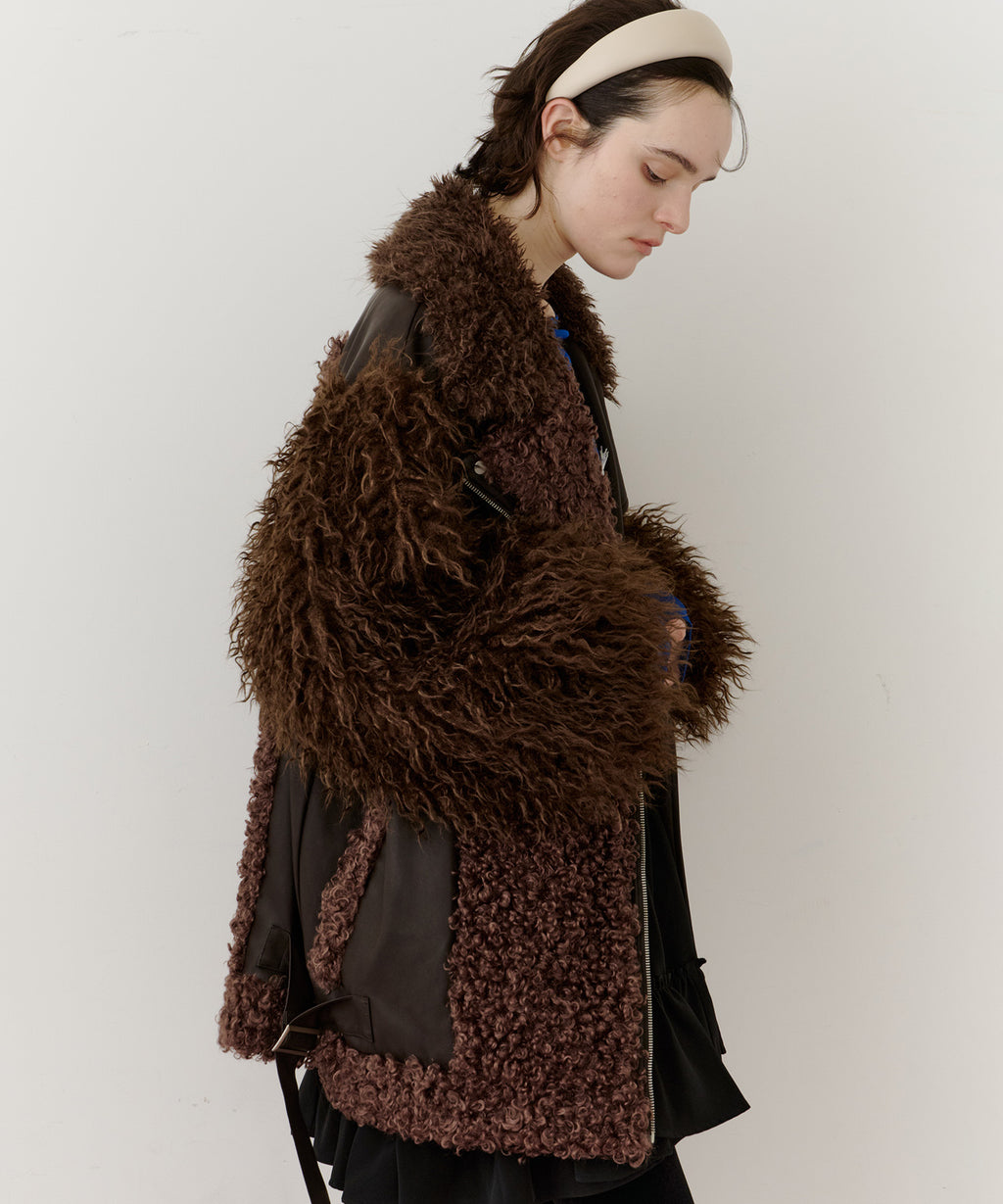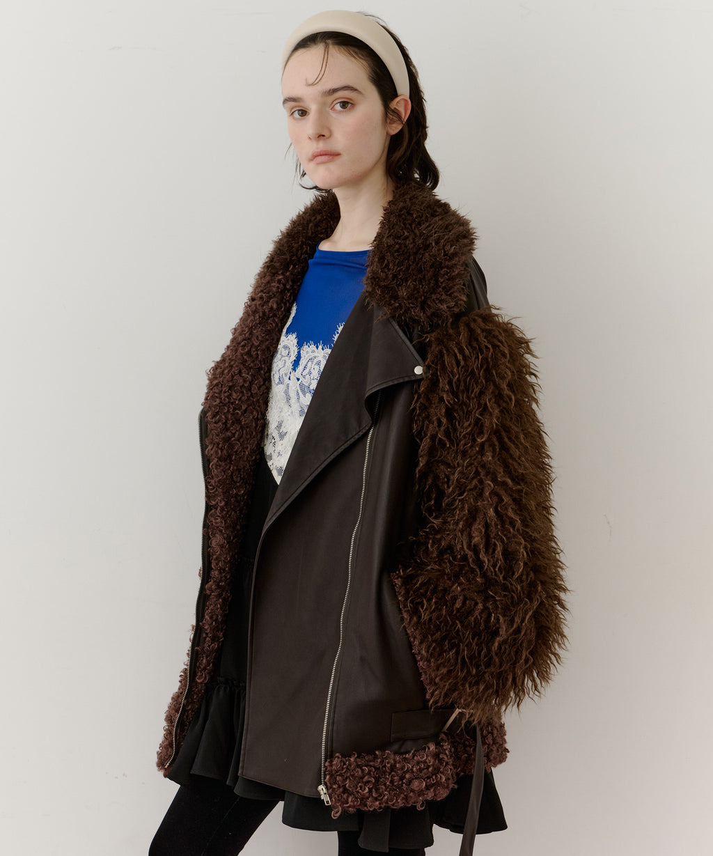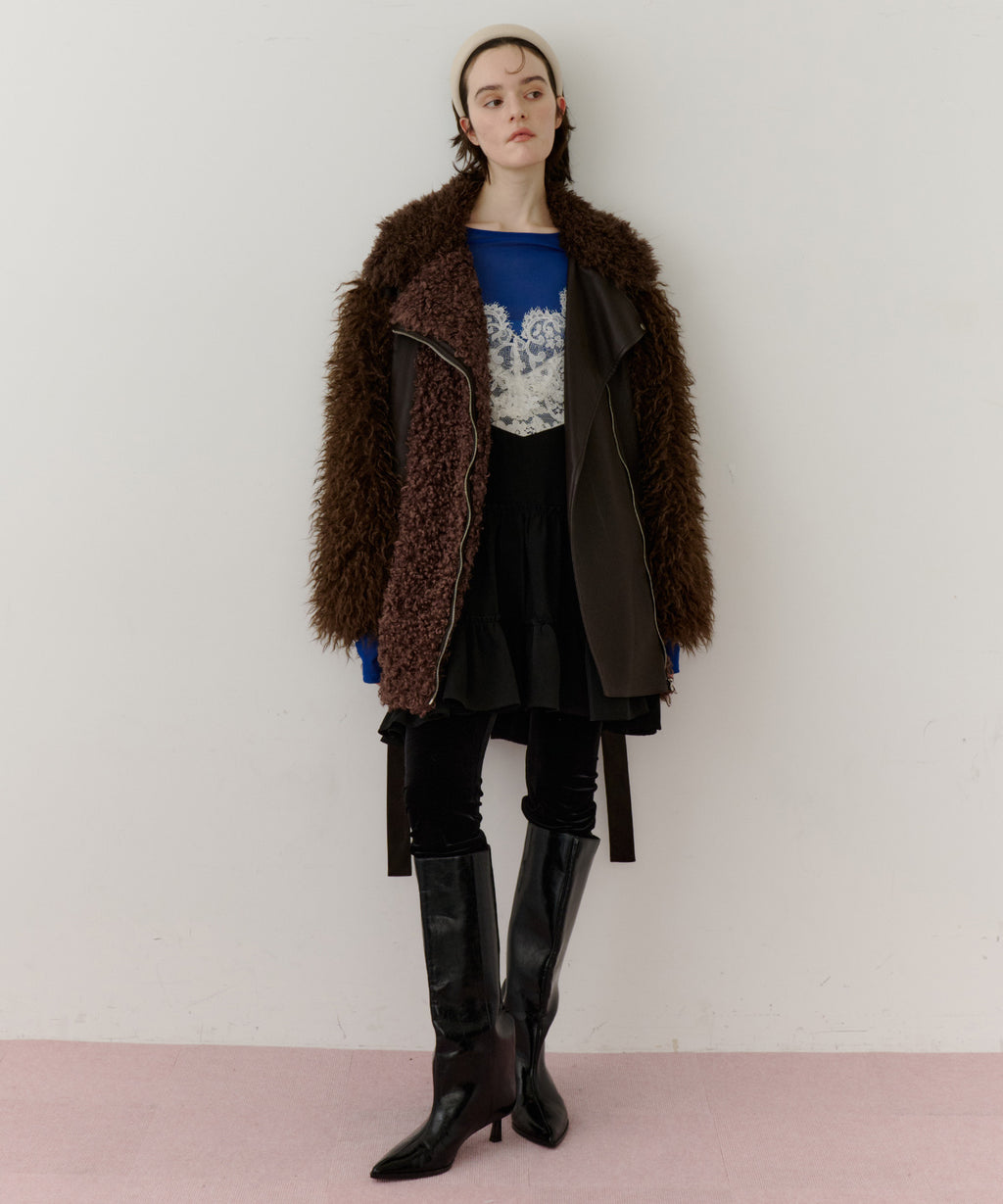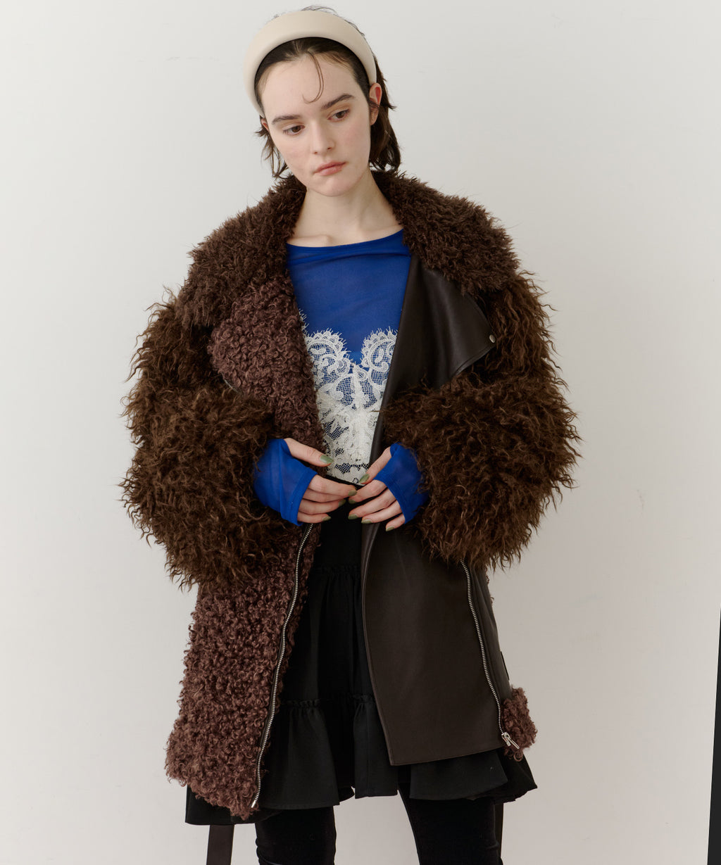 ファー、ボア、レザーと異素材のファブリックの組み合わせ。