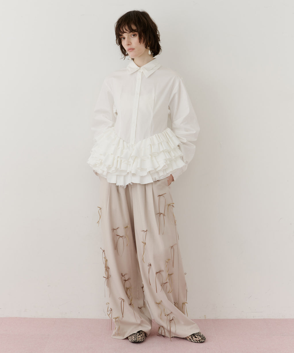 フリルの裾はあえて切りっぱなしで、かっちりとしすぎない抜け感とヴィンテージ感のあるデザインに仕上げました。