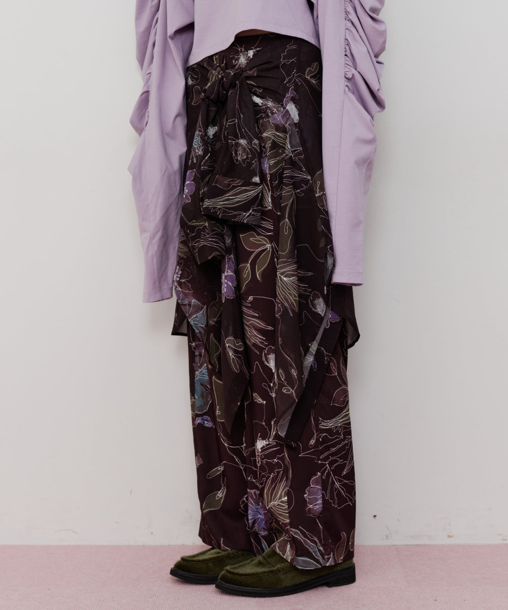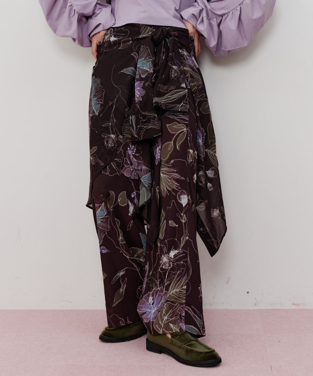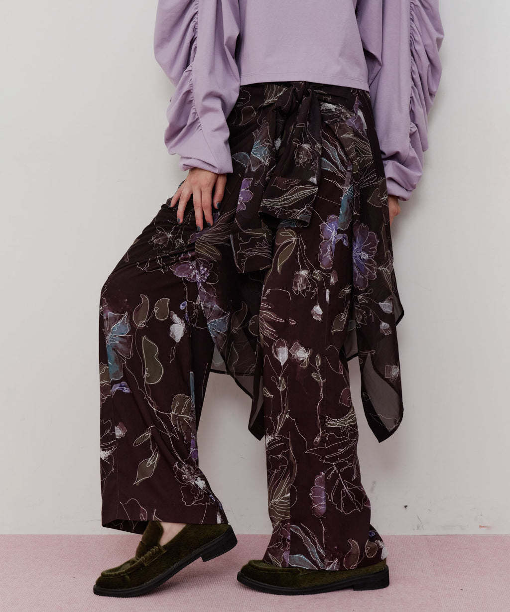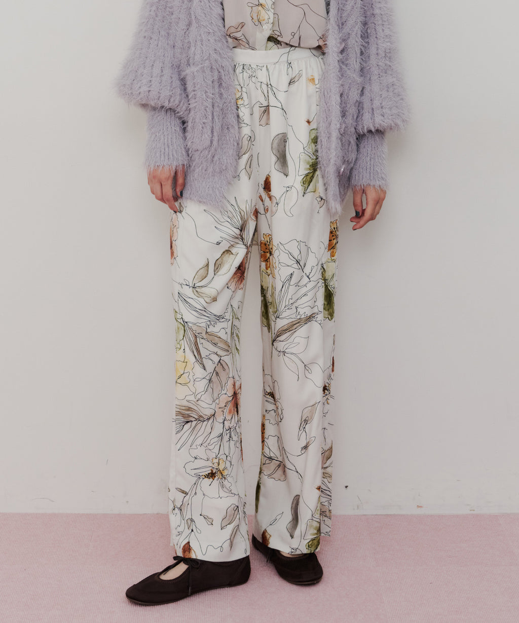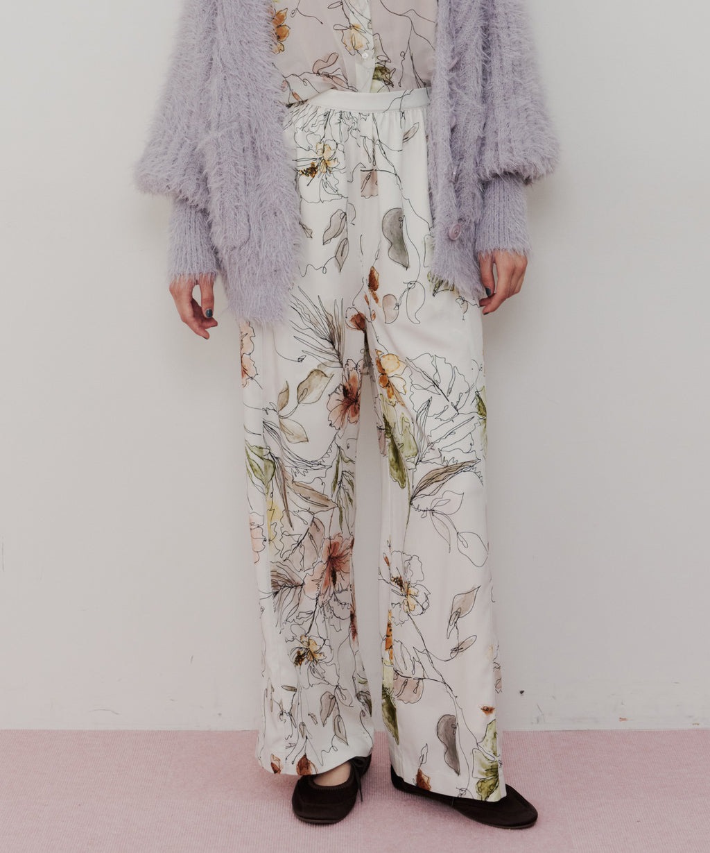花柄もパンツにすることで可愛くなりすぎず、カジュアルにもなりすぎない大人可愛いスタイリングが実現◎