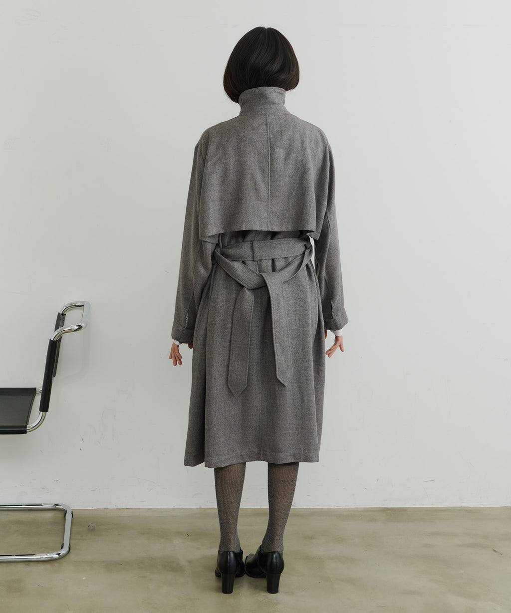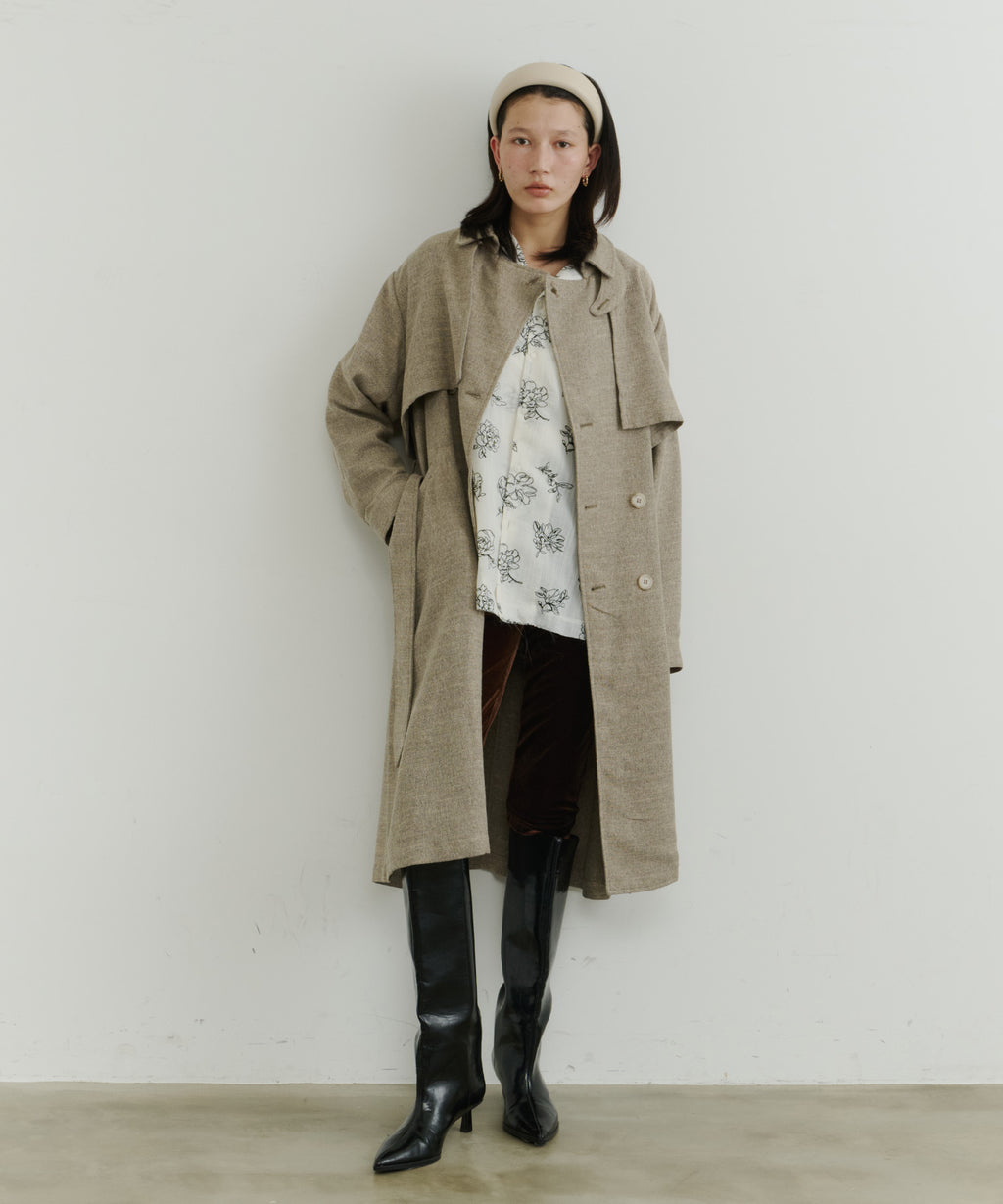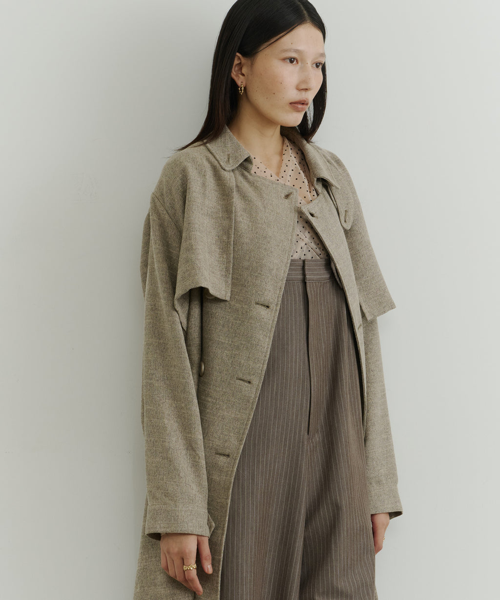 ややAラインに広がるシルエットで、女性らしさも出しつつ、襟を立ててマニッシュにも着こなすことができます。