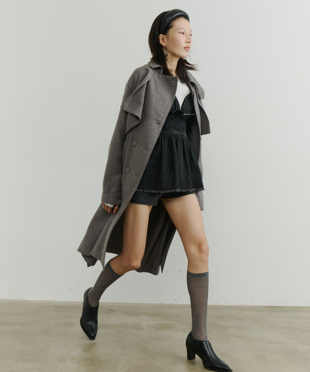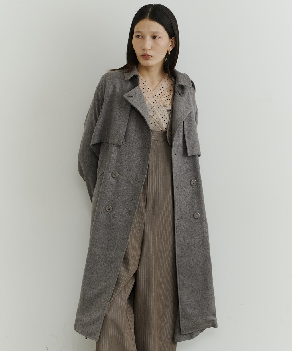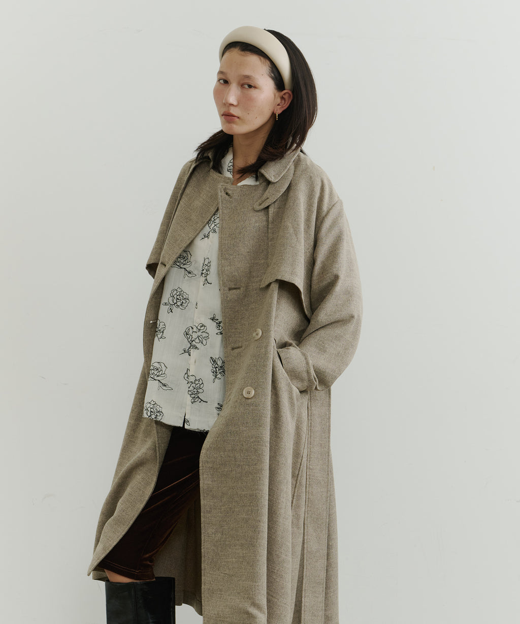 ややAラインに広がるシルエットで、女性らしさも出しつつ、襟を立ててマニッシュにも着こなすことができます。
