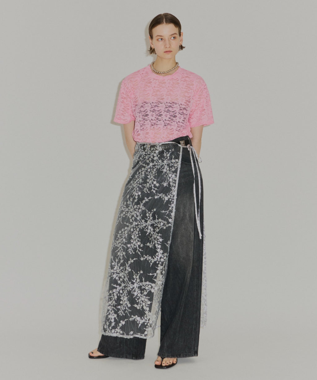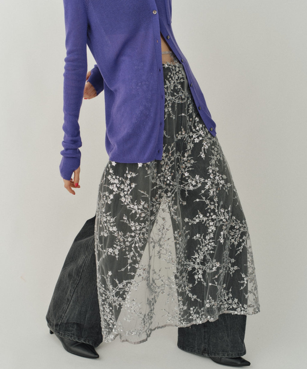 ・花模様にスパンコールが配置されたユニークな素材を使用したラップスカートです。
