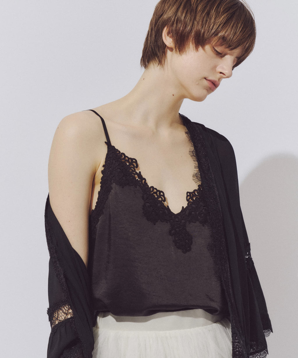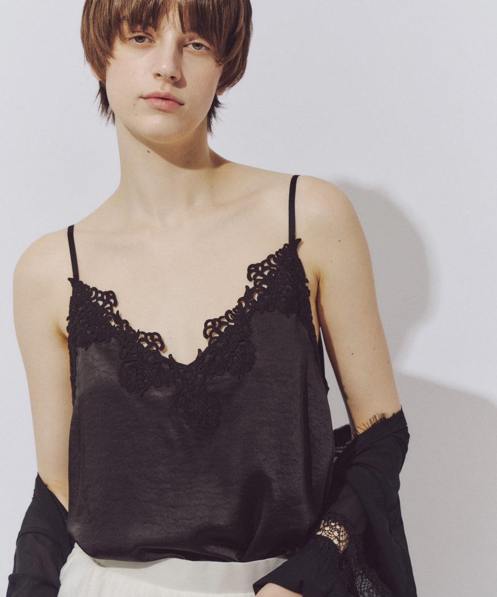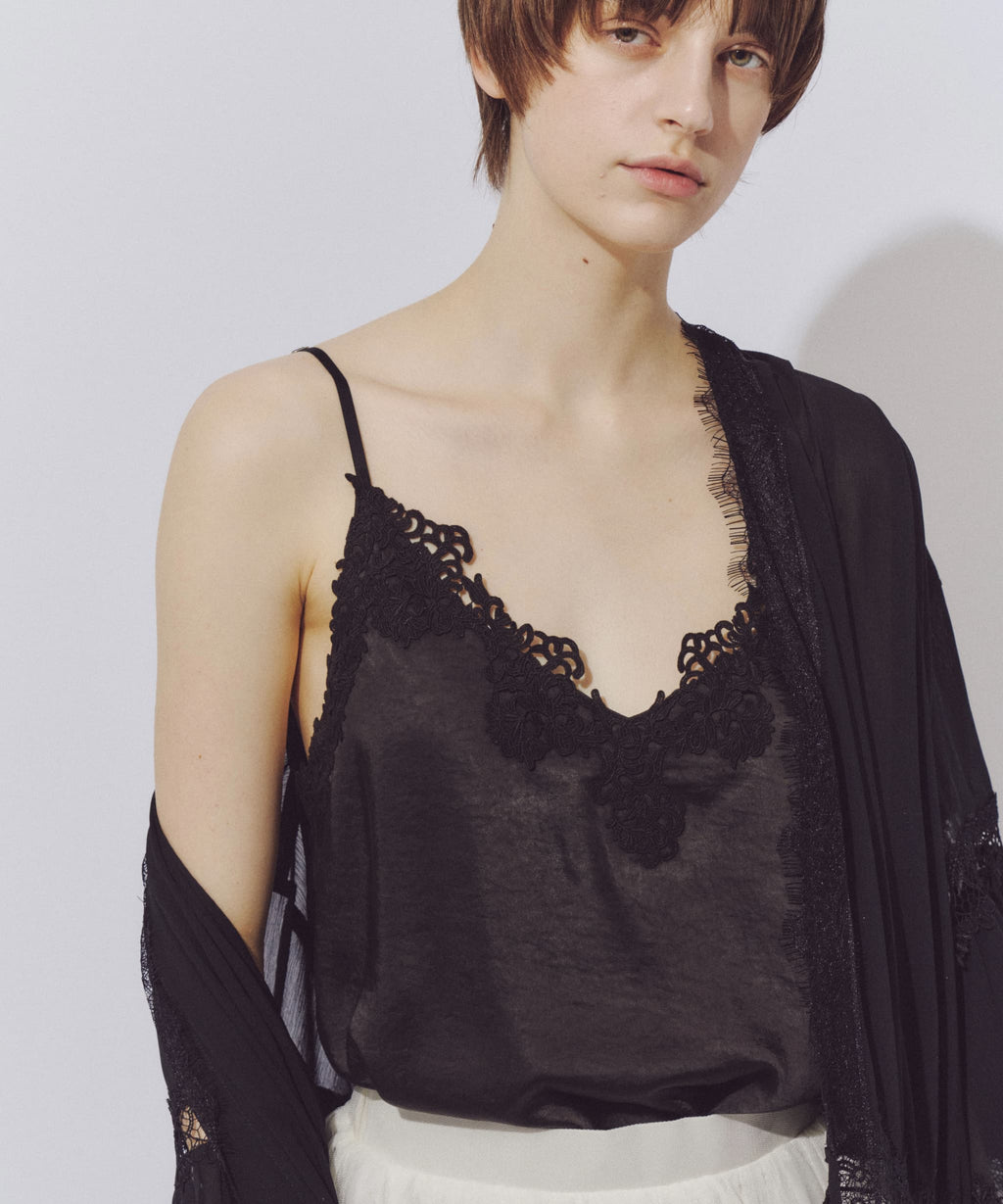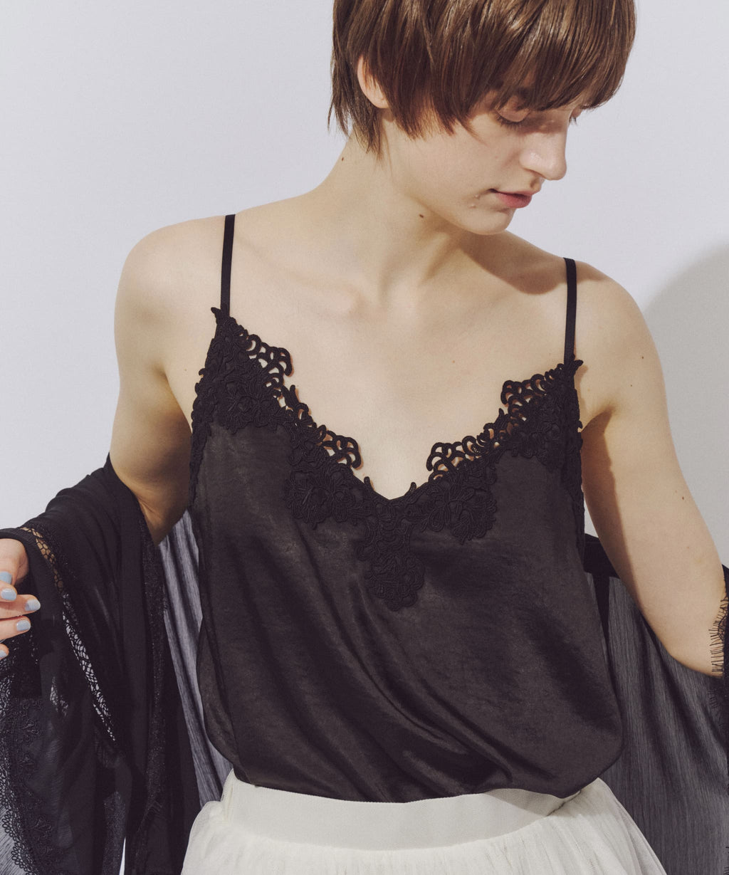 控えめなモチーフレースをほどこした着まわし力のあるサテンキャミソール。