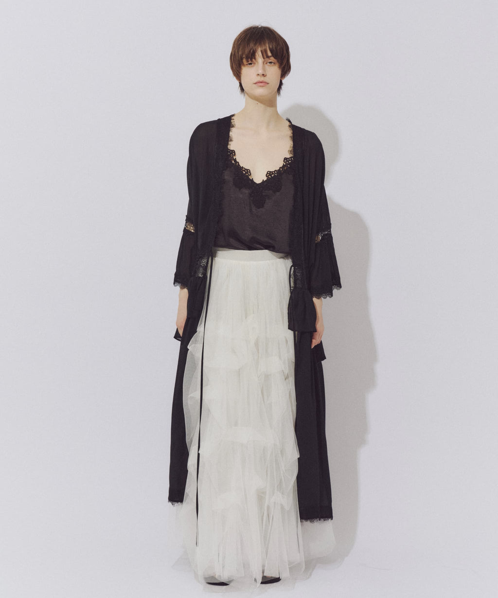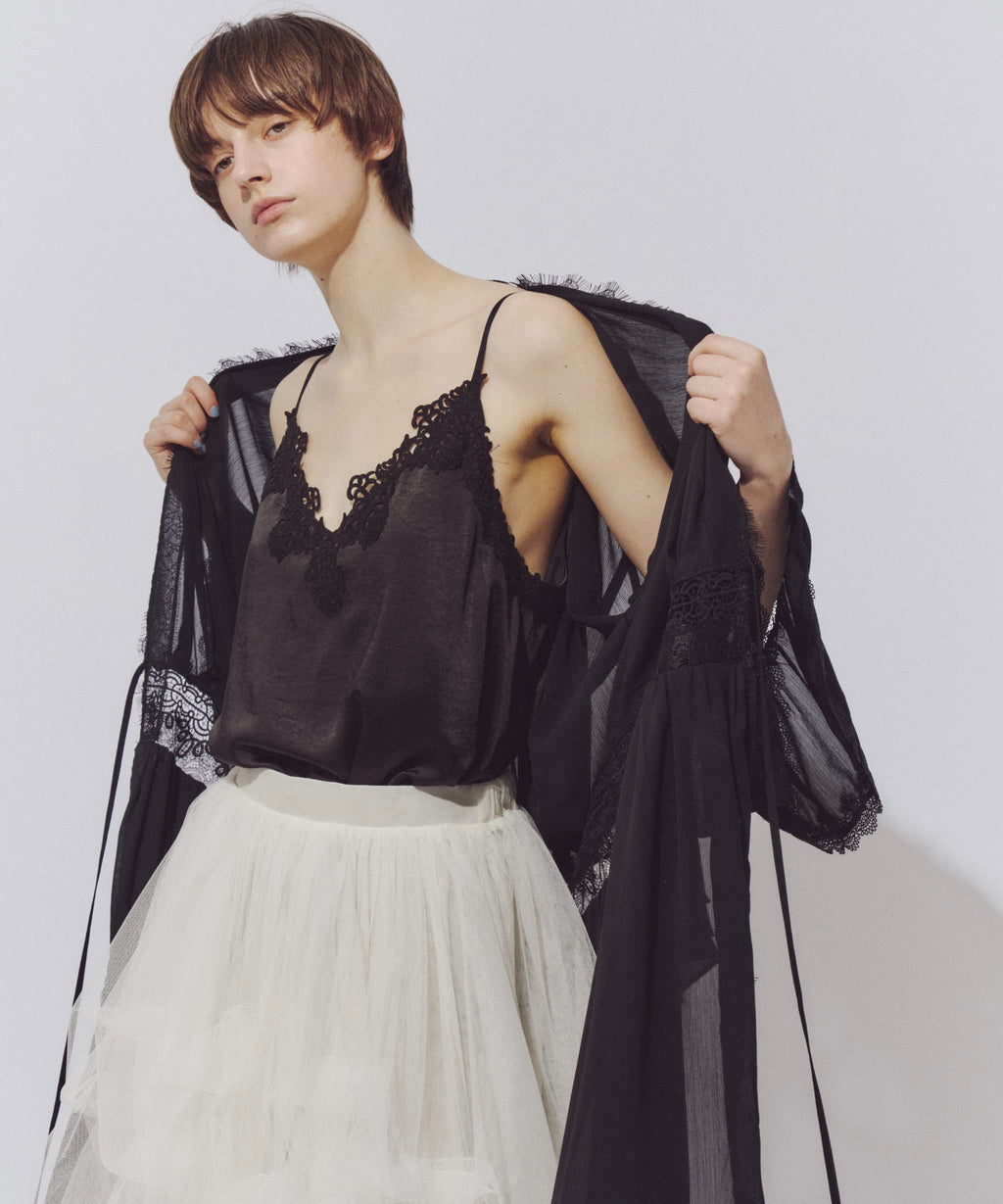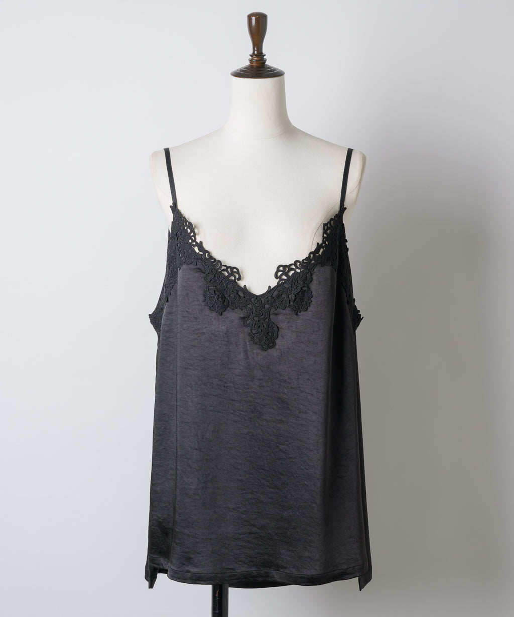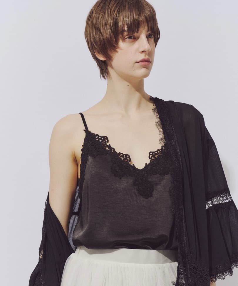 控えめなモチーフレースをほどこした着まわし力のあるサテンキャミソール。