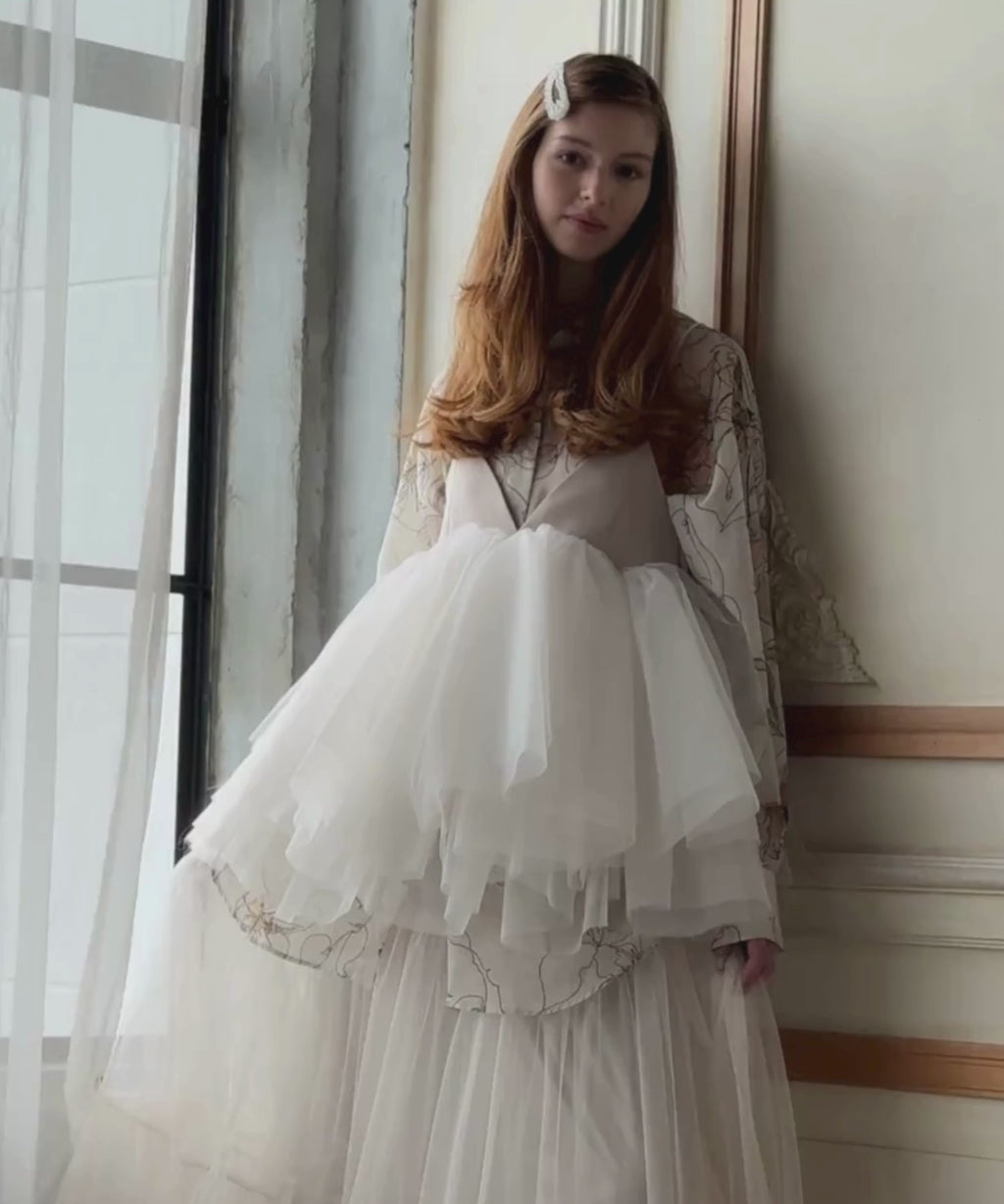 ハードチュール、オーガンジー、ソフトチュールを使ったエアリーな見え方と着心地がポイント。