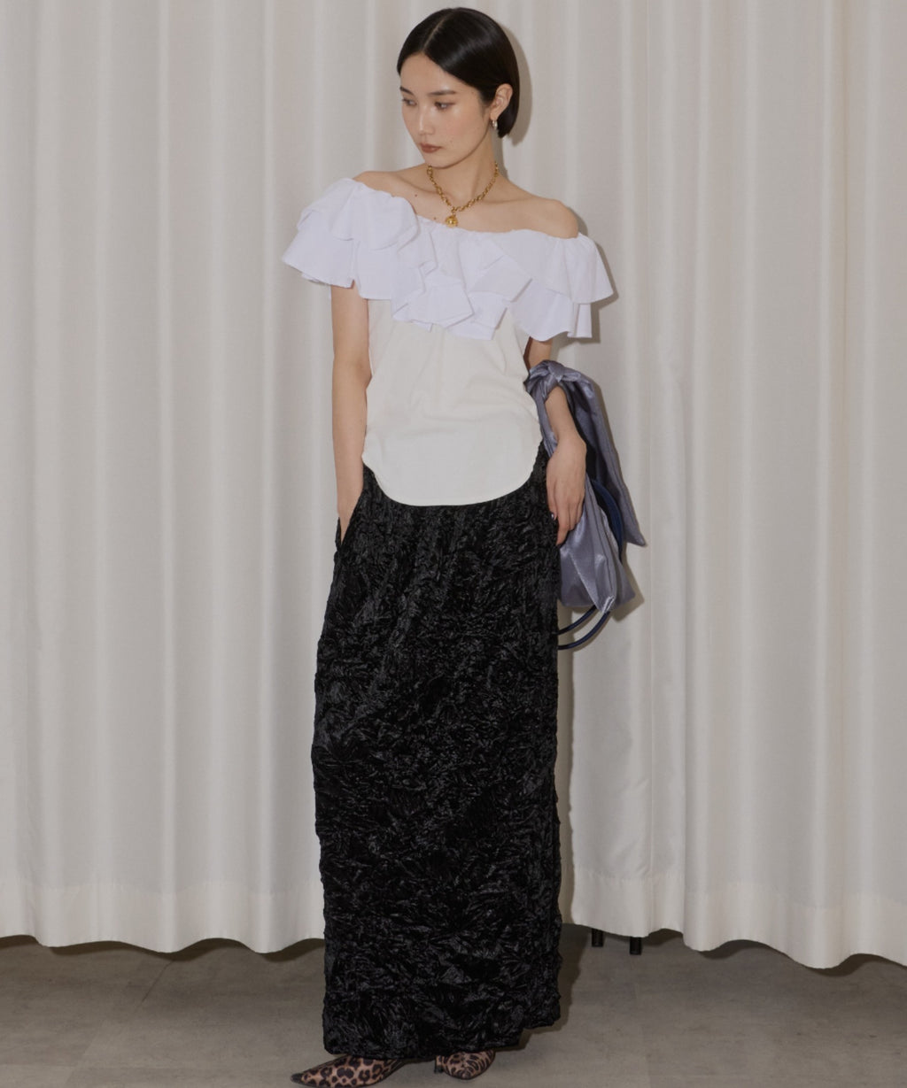 ・フリル部分に対して身頃はコンパクトに仕上げ、メリハリが出る着こなしに。