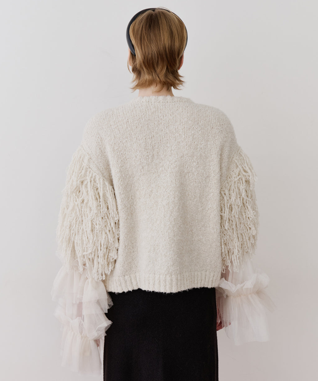 アームはループフリンジニットでボリューム感をプラス。