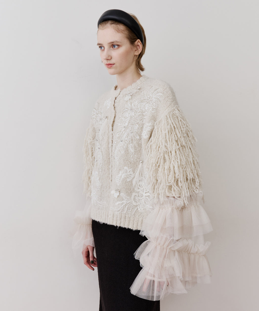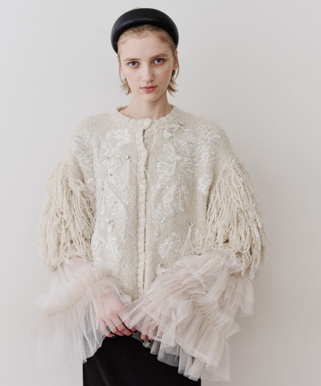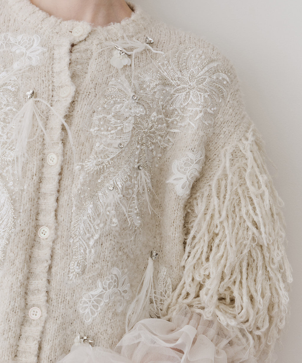装飾が目を惹くデコラティブなニットカーディガン 。