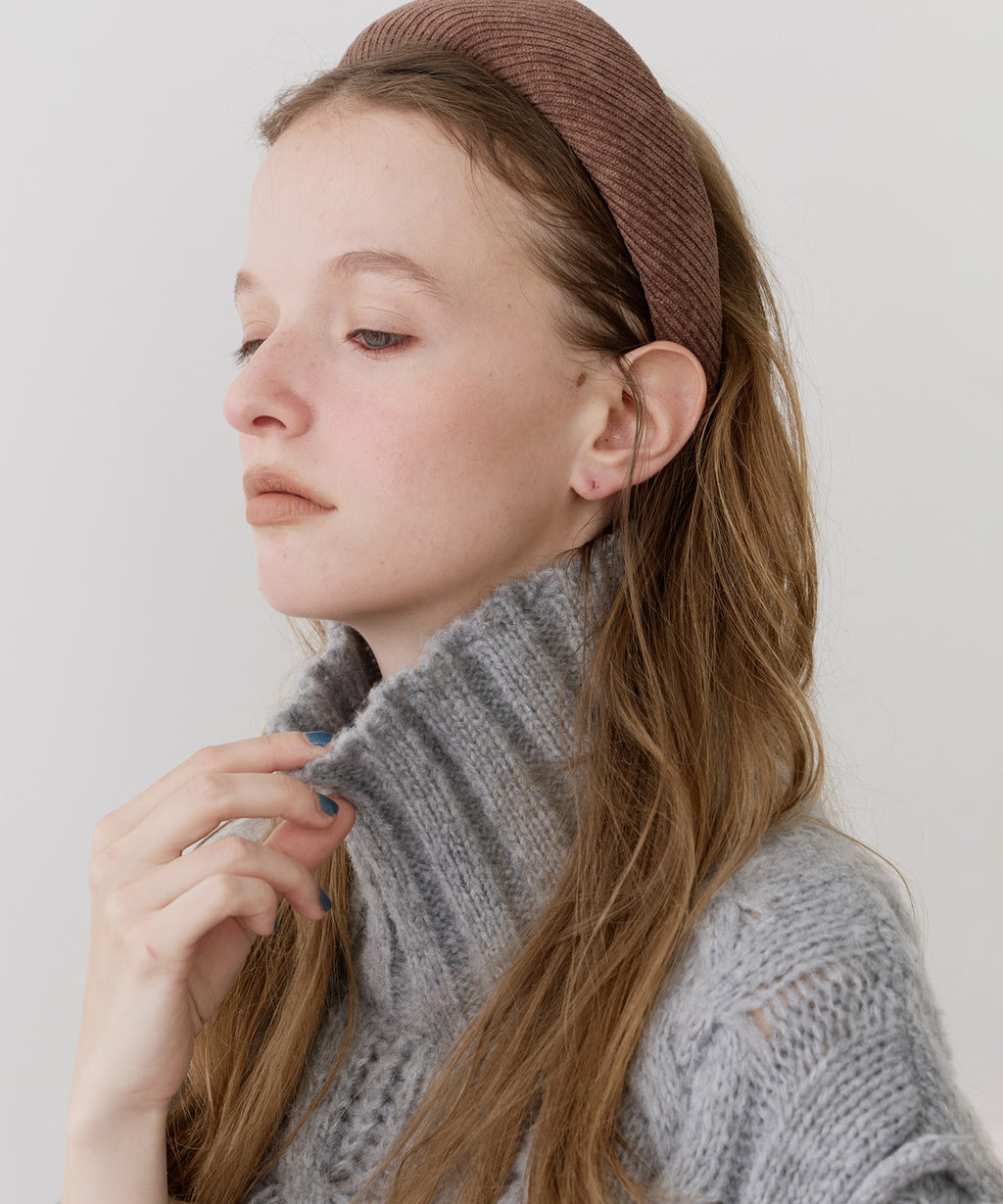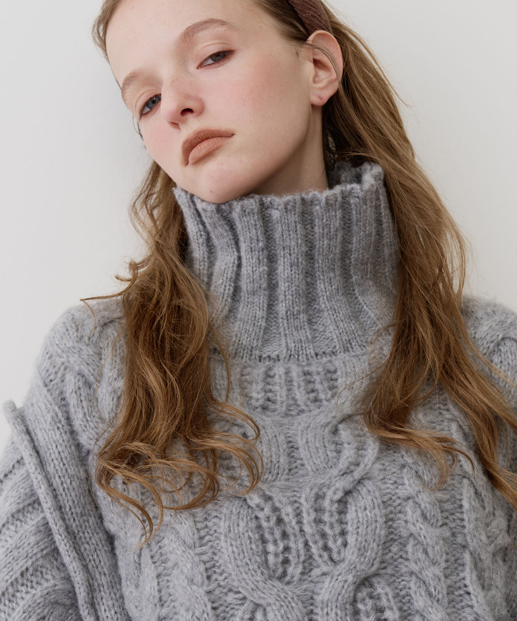 顔まわりは太めなリブ編みのワイドタートルネック。
