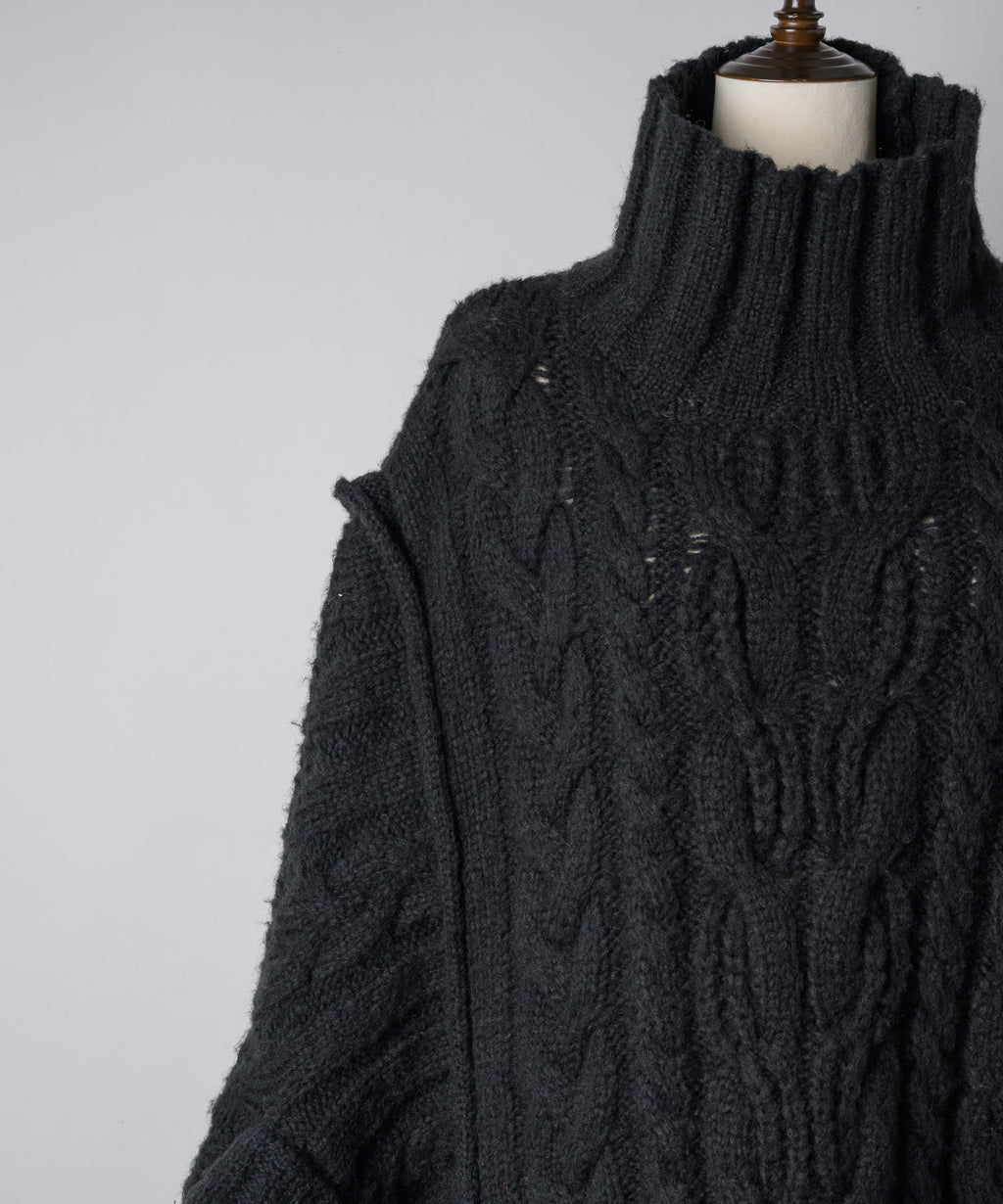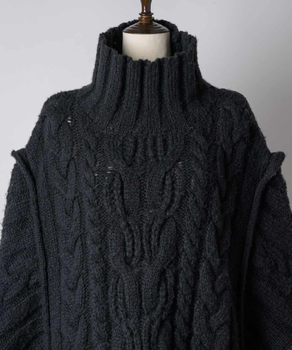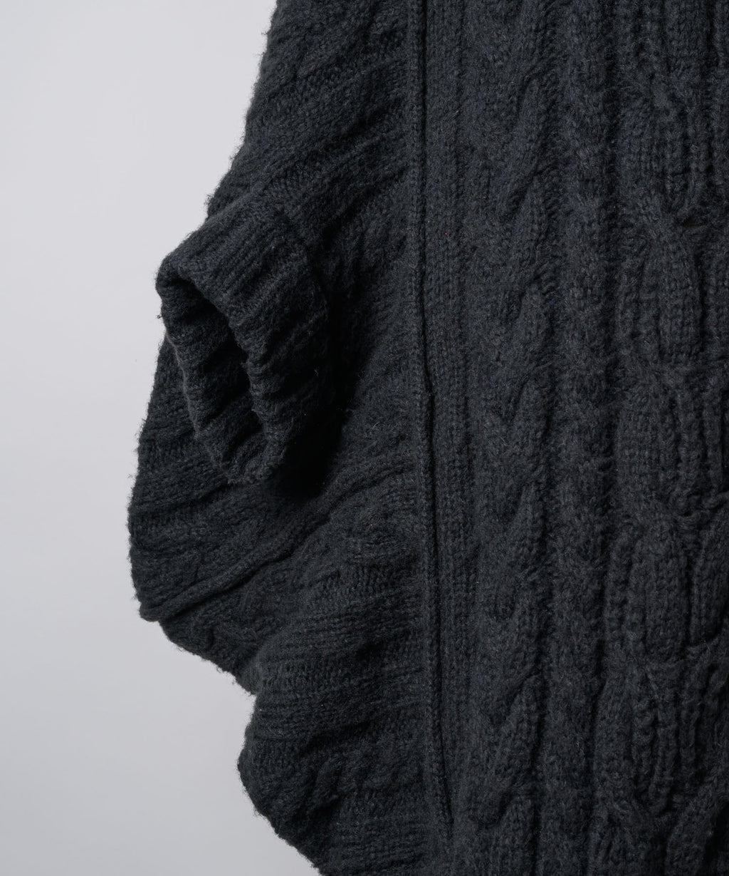 しっかりと厚みのある冬にぴったりなニット。全体的にケイブル編みを施し、身頃と袖部分の編み方を巧みに変化をつけました。