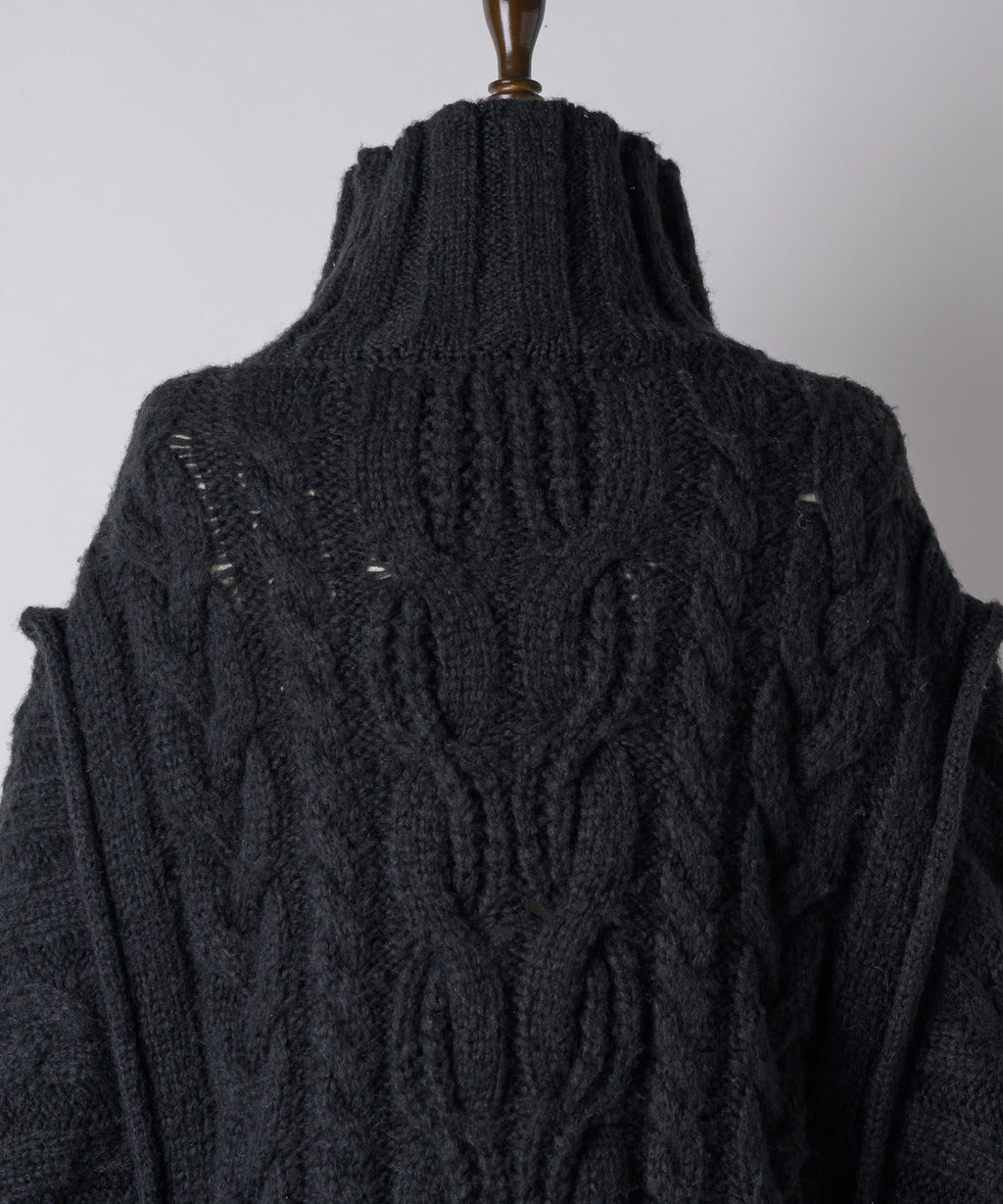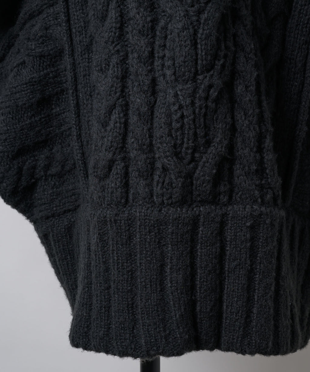 ゆったりとしたシルエットながら、身頃には縦に施された大きなケーブル編みで