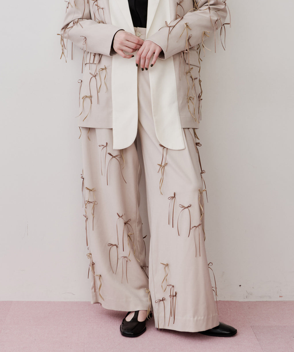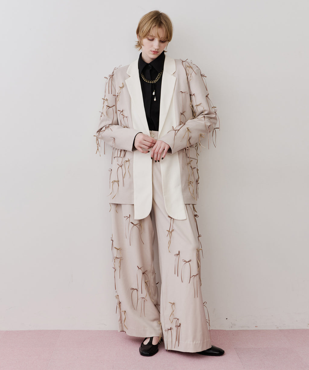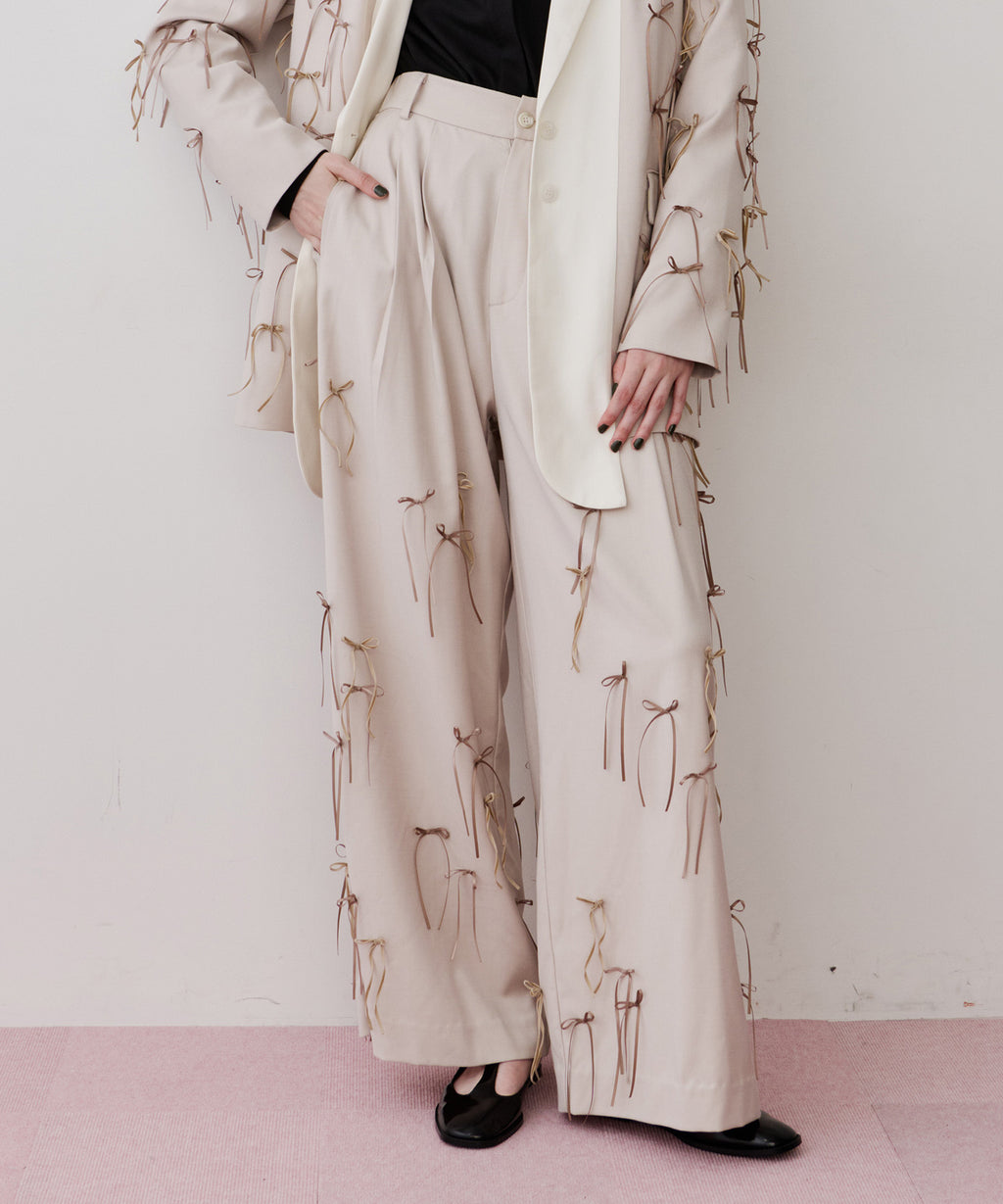 セミワイドなシルエットに、たくさんのリボンを散りばめたデザイン。