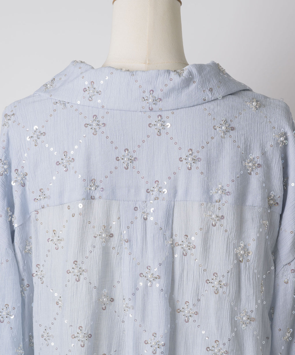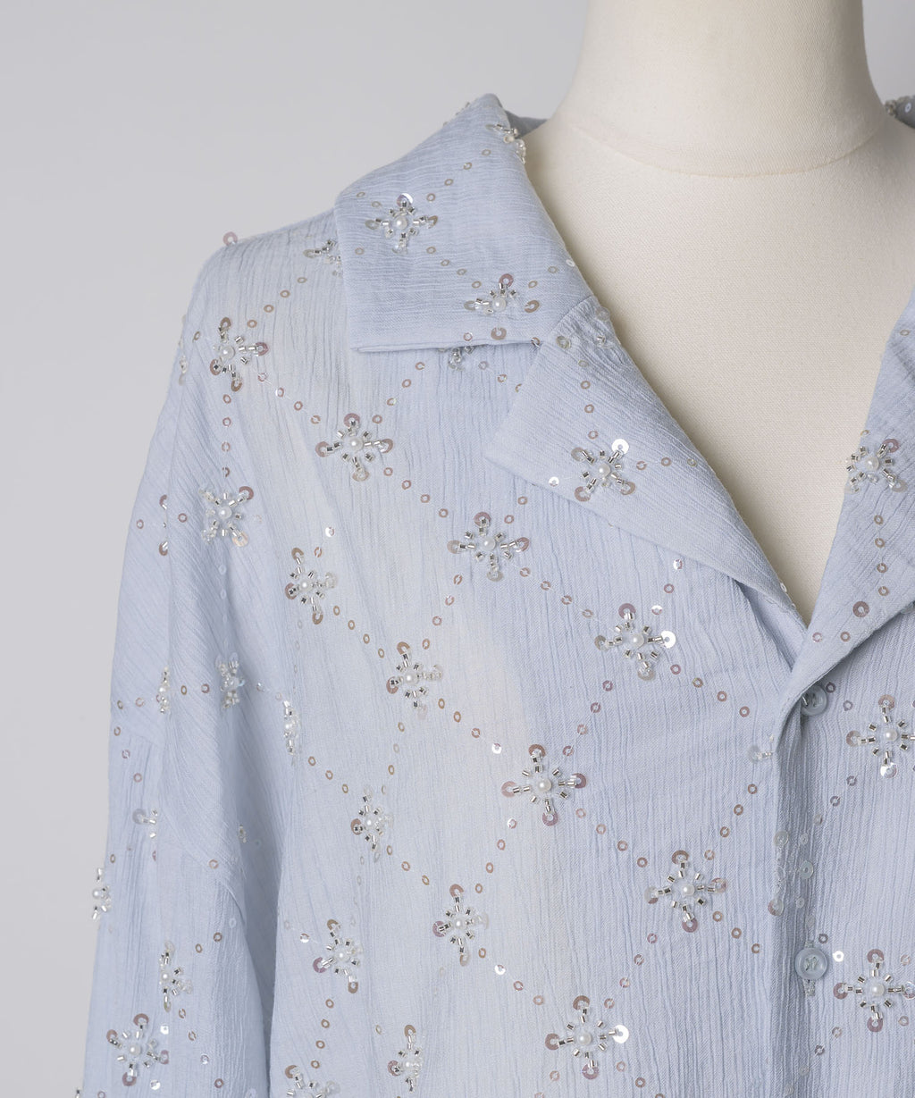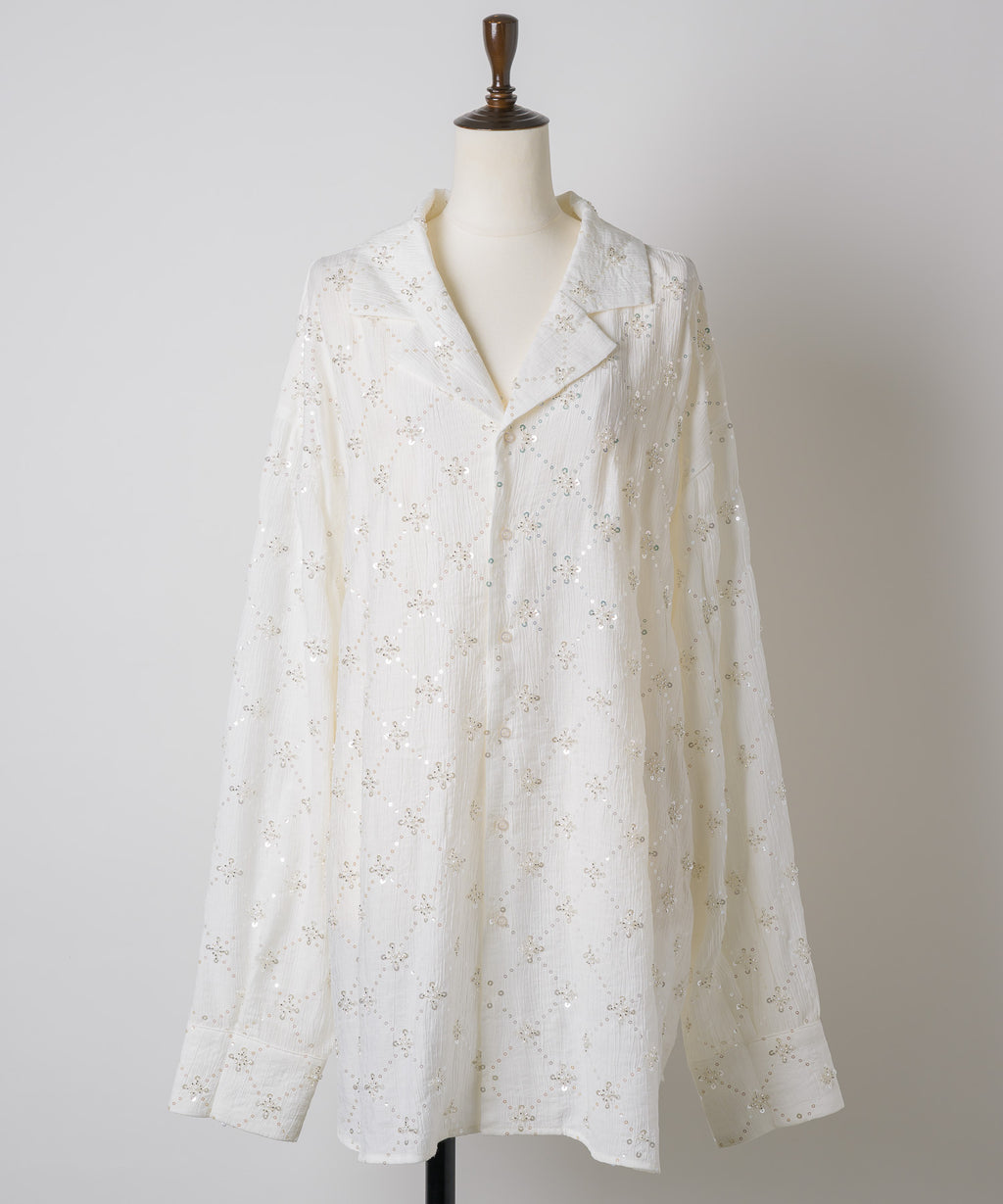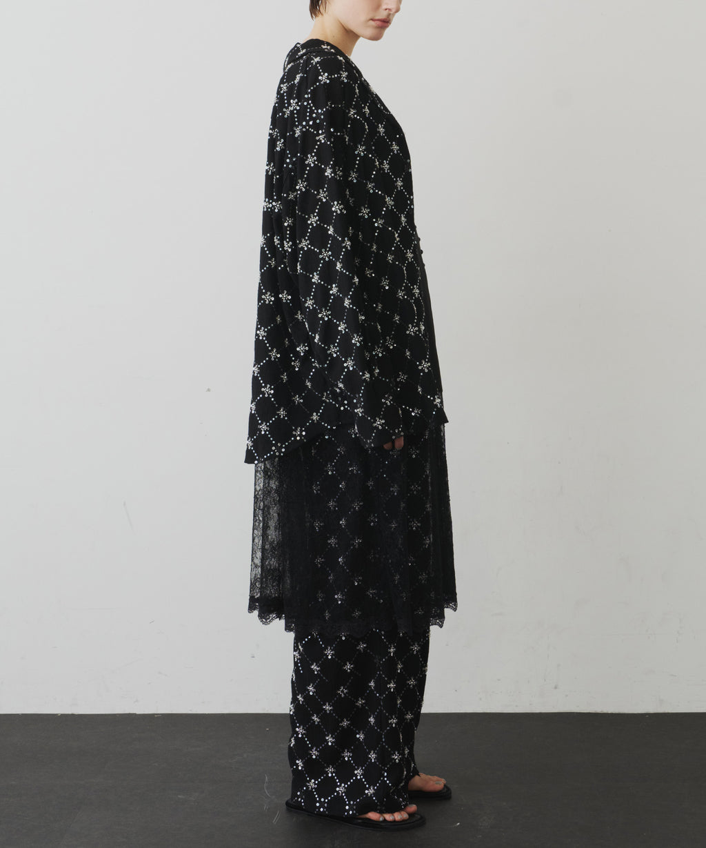 全体に施したビーズ刺繍と思い切ったリラックスシルエットがマッチした一着。