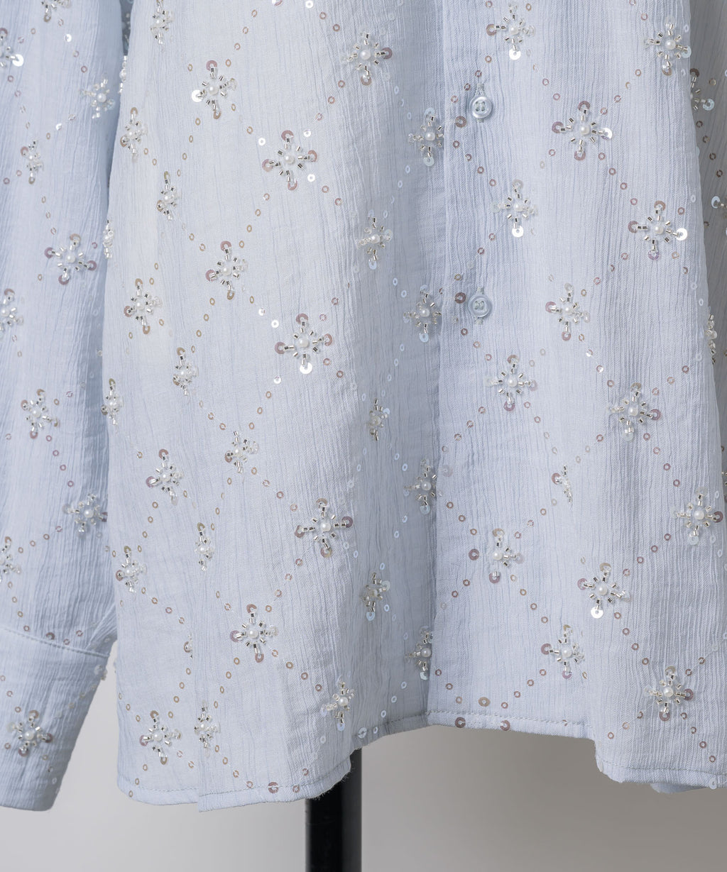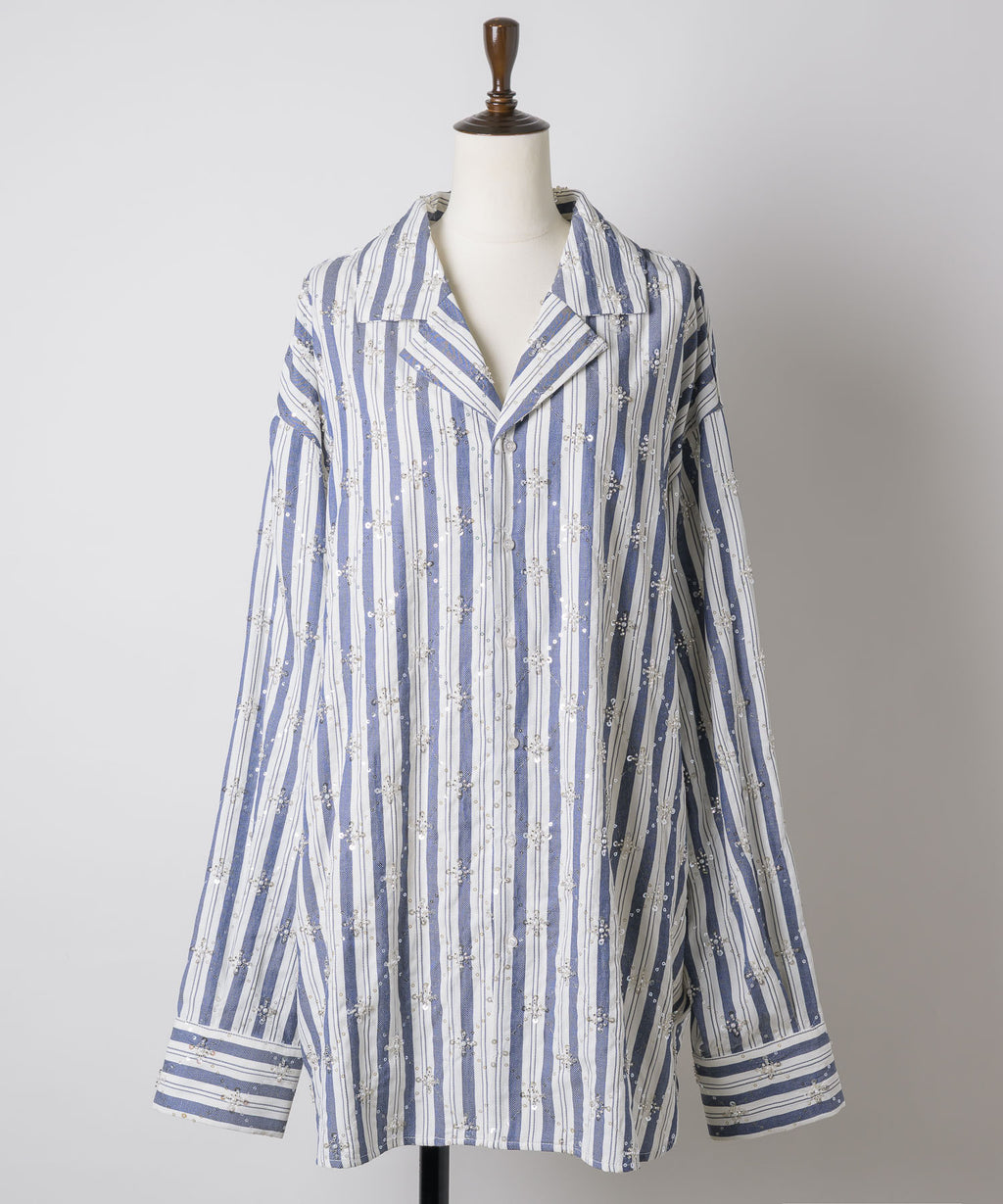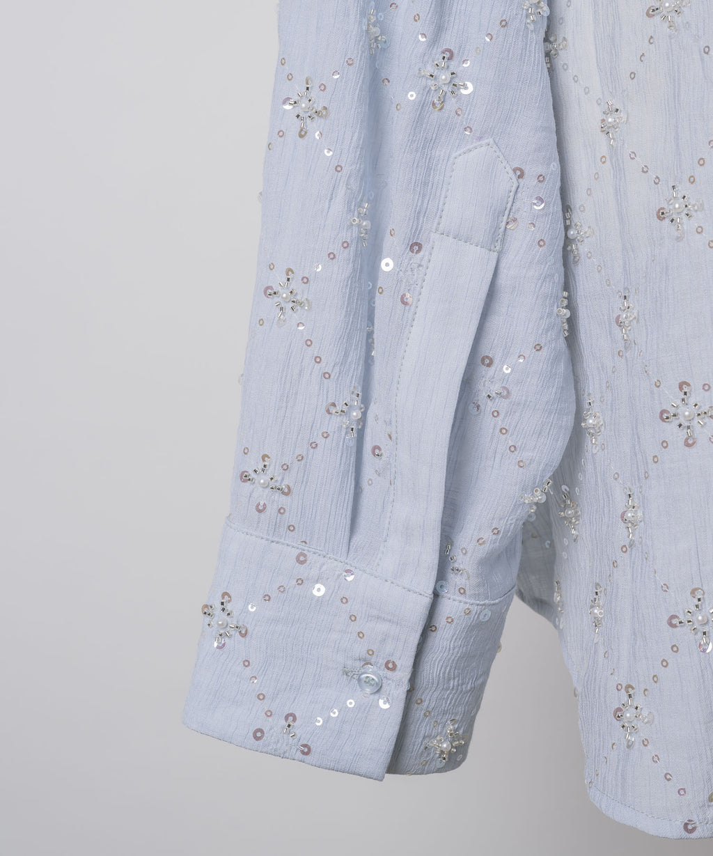 全体に施したビーズ刺繍と思い切ったリラックスシルエットがマッチした一着。