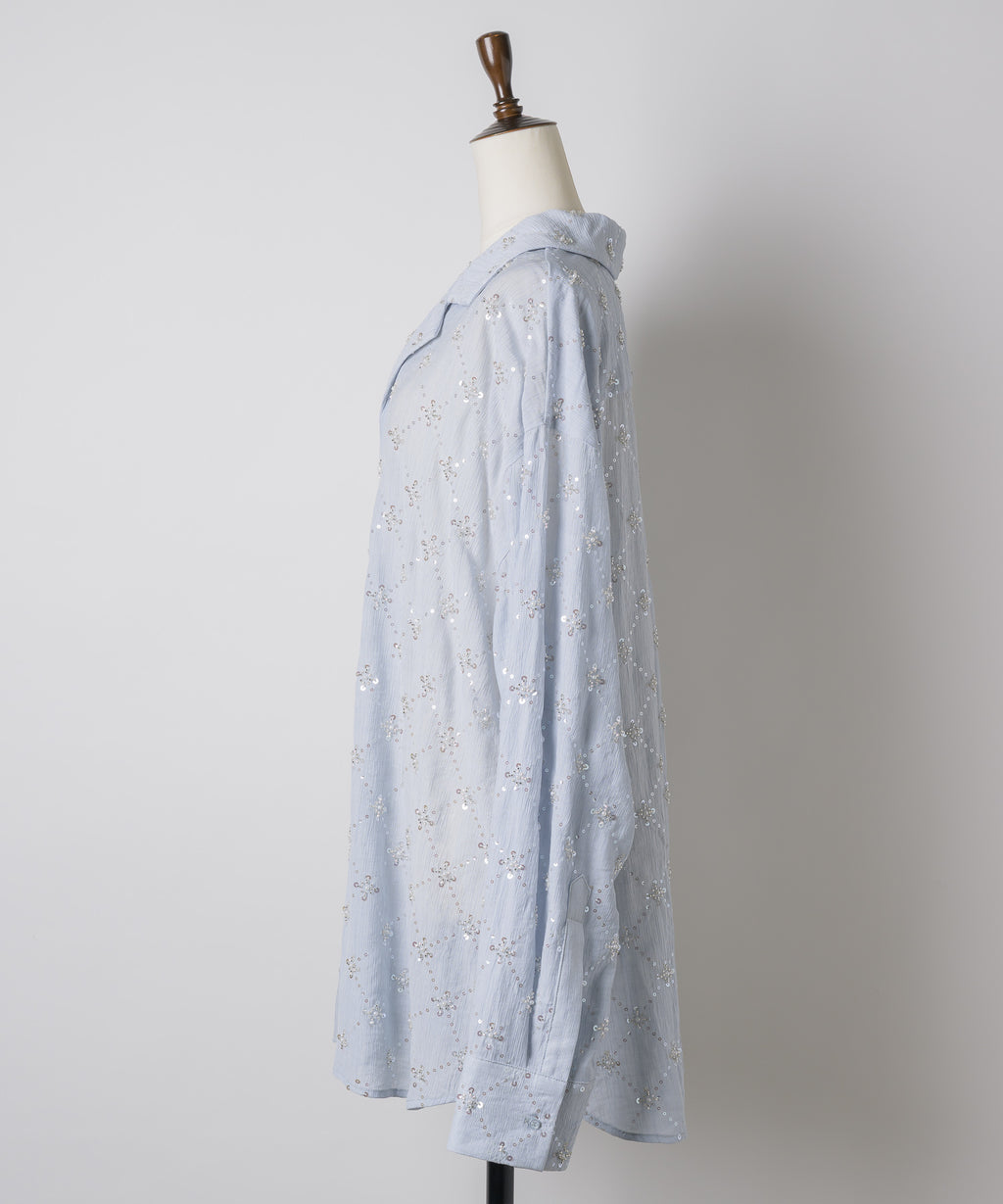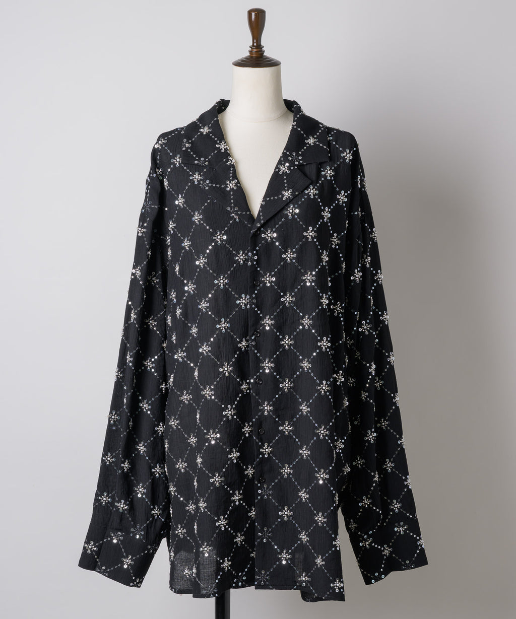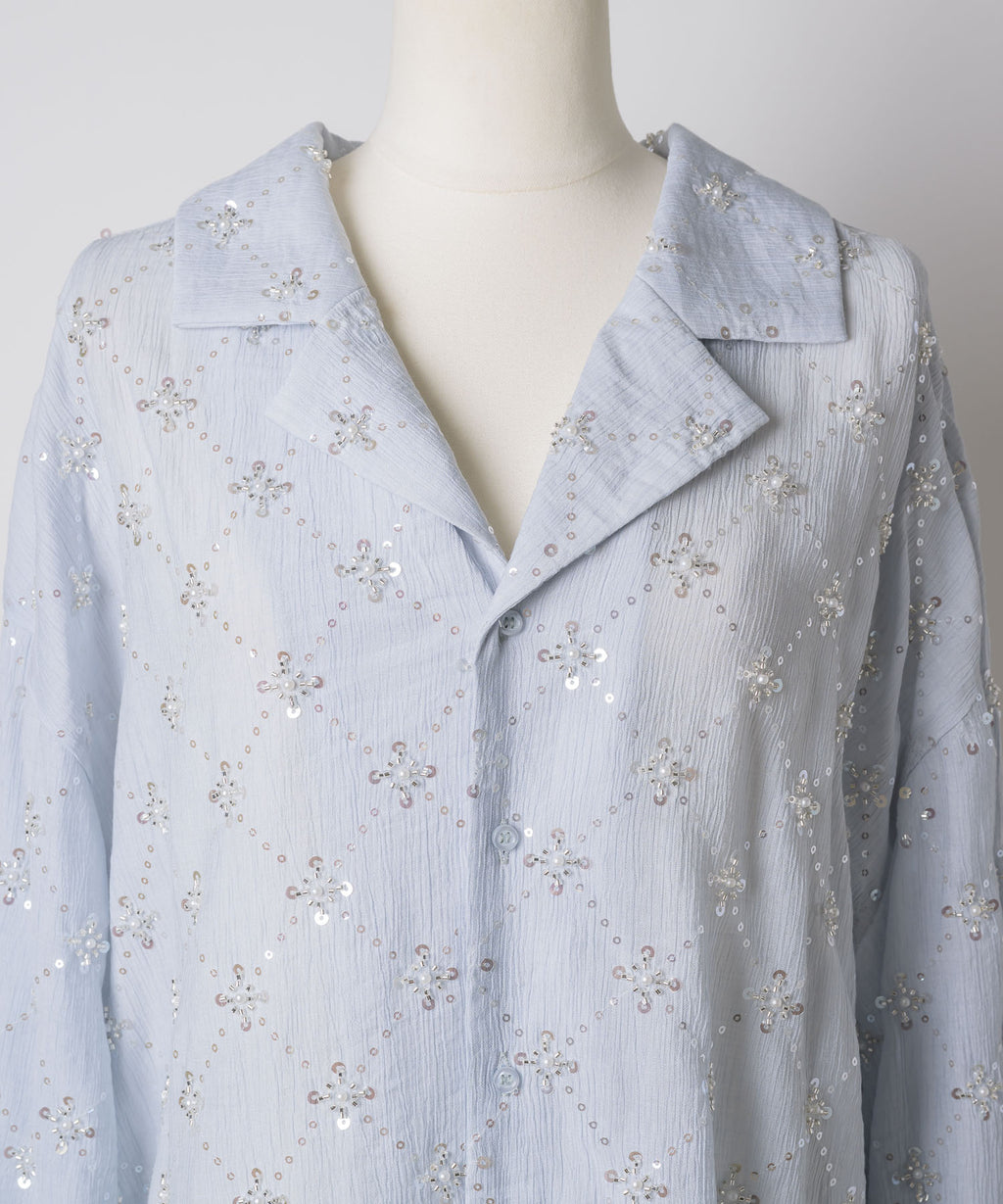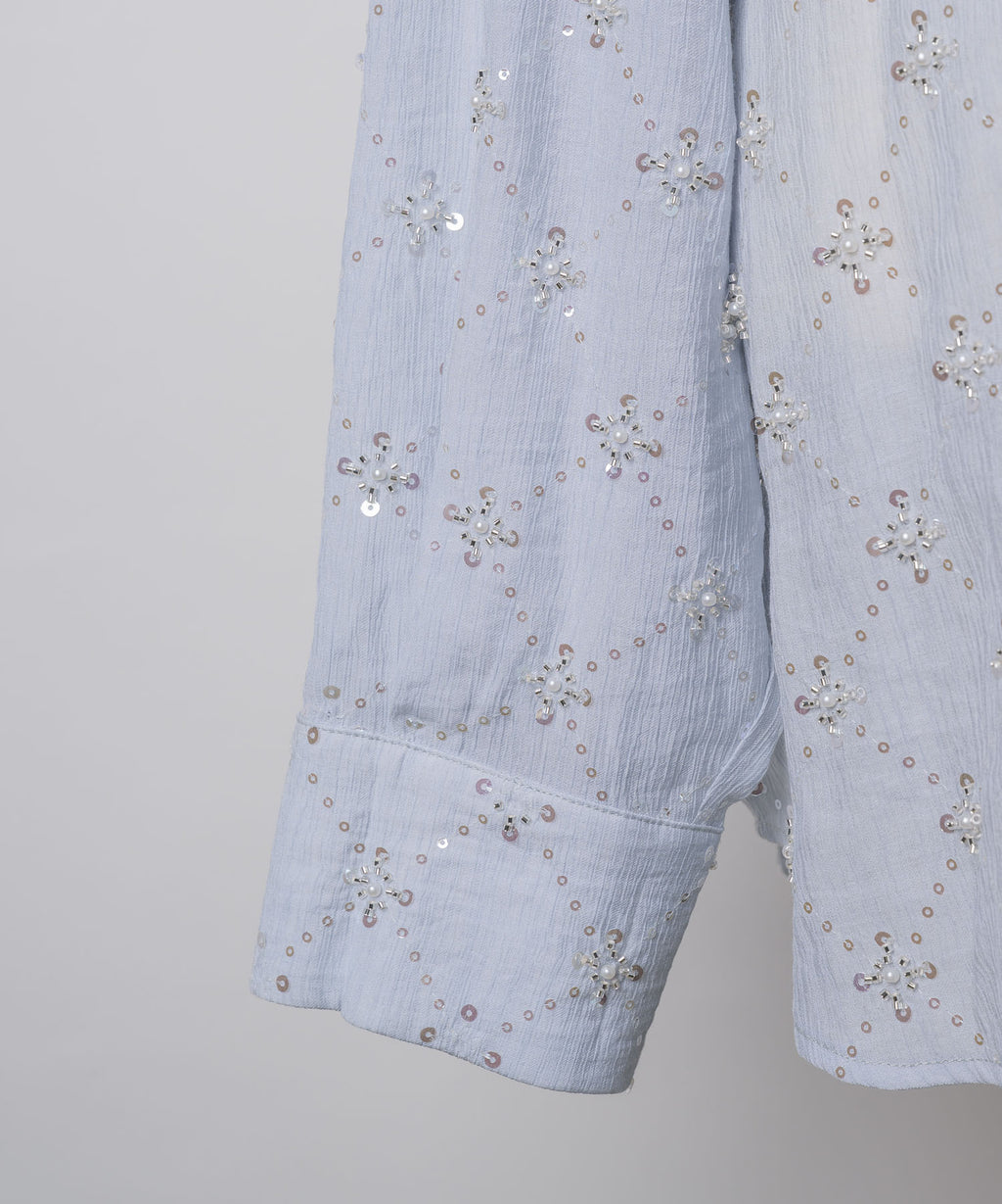全体に施したビーズ刺繍と思い切ったリラックスシルエットがマッチした一着。