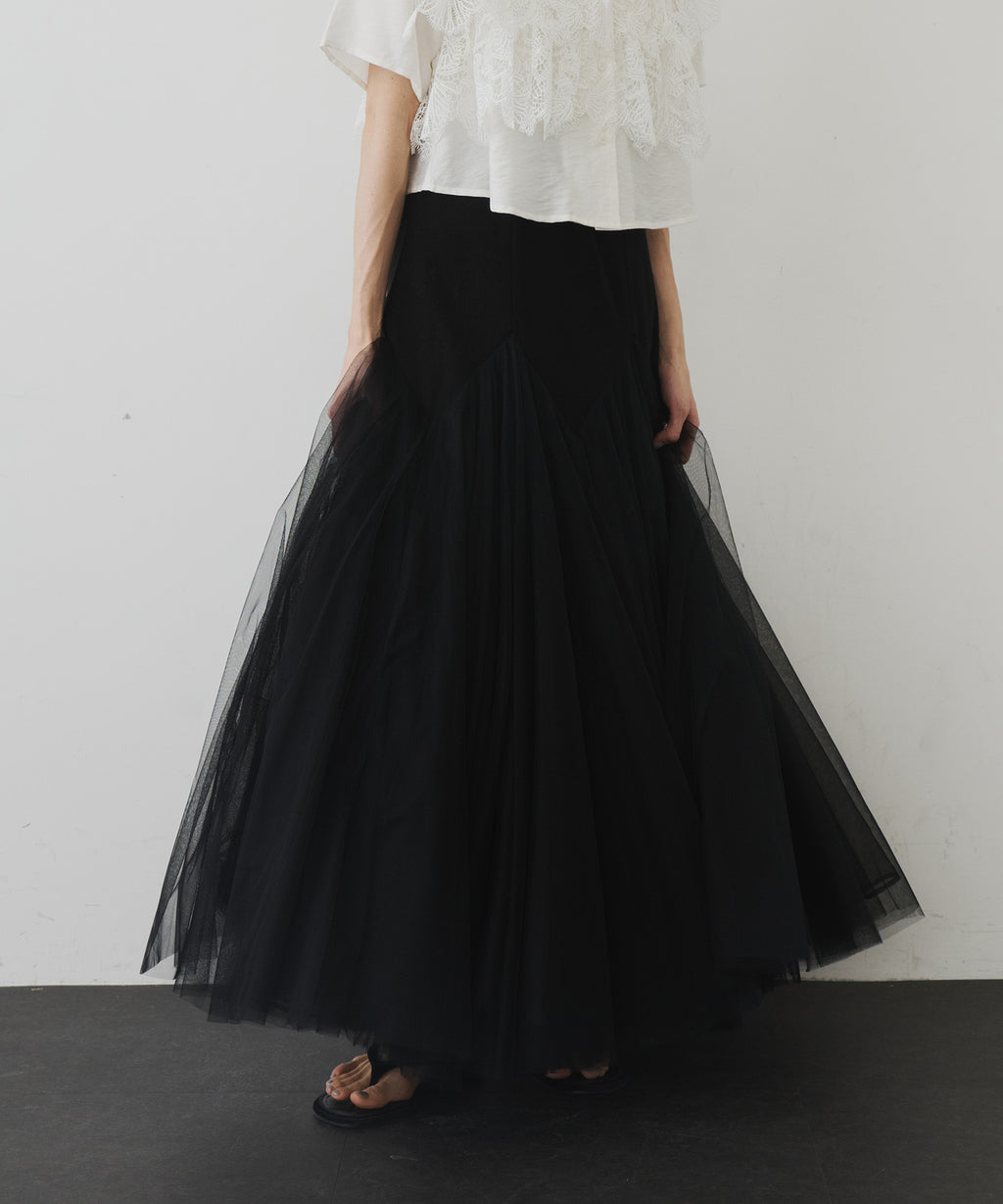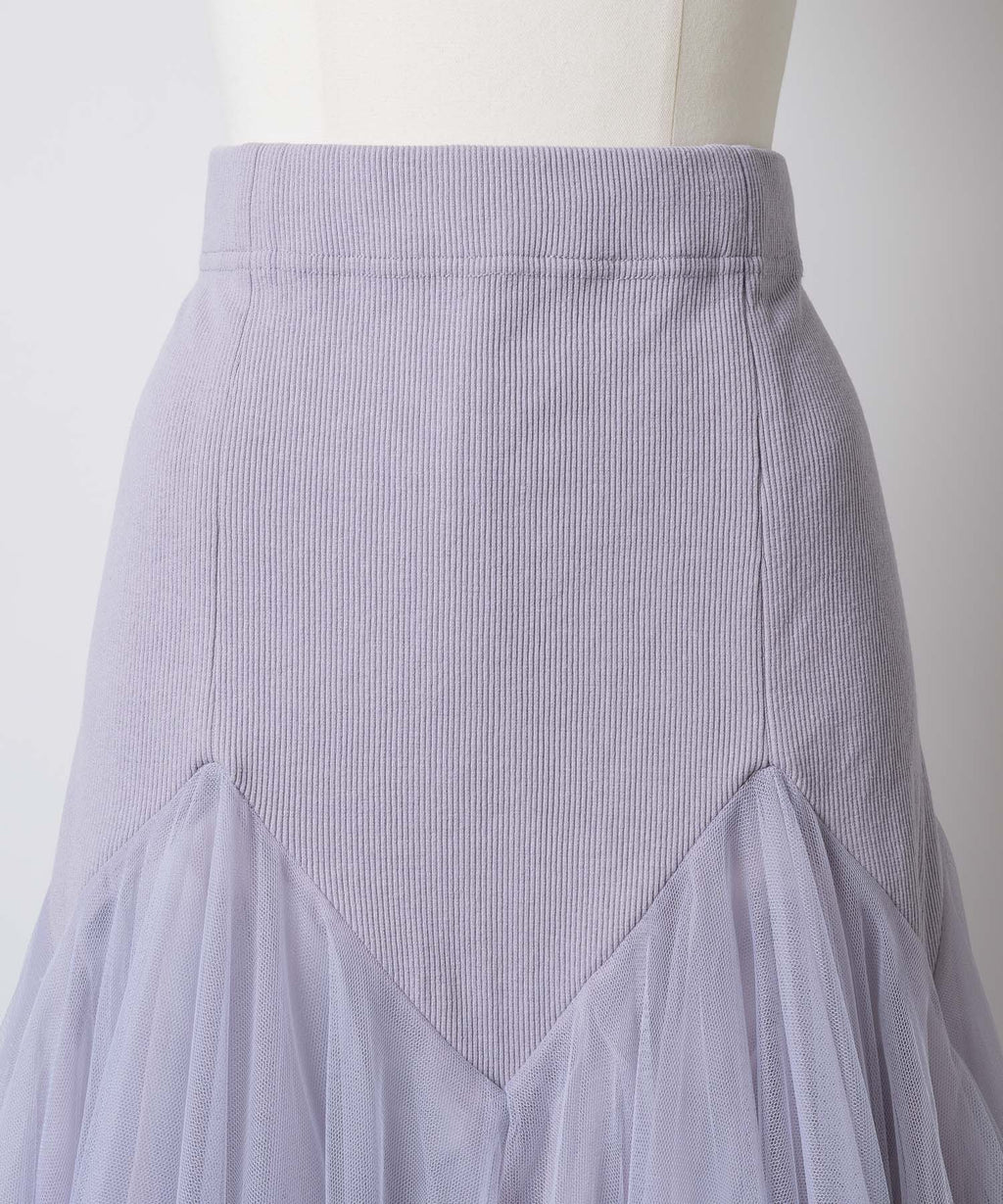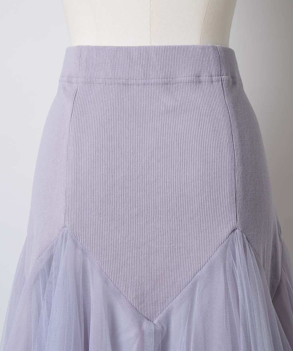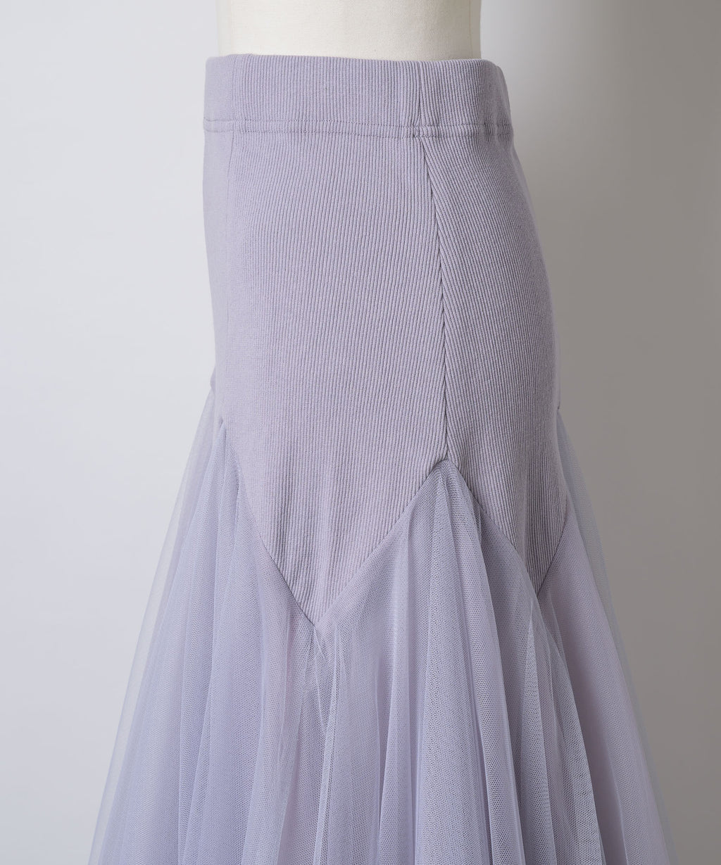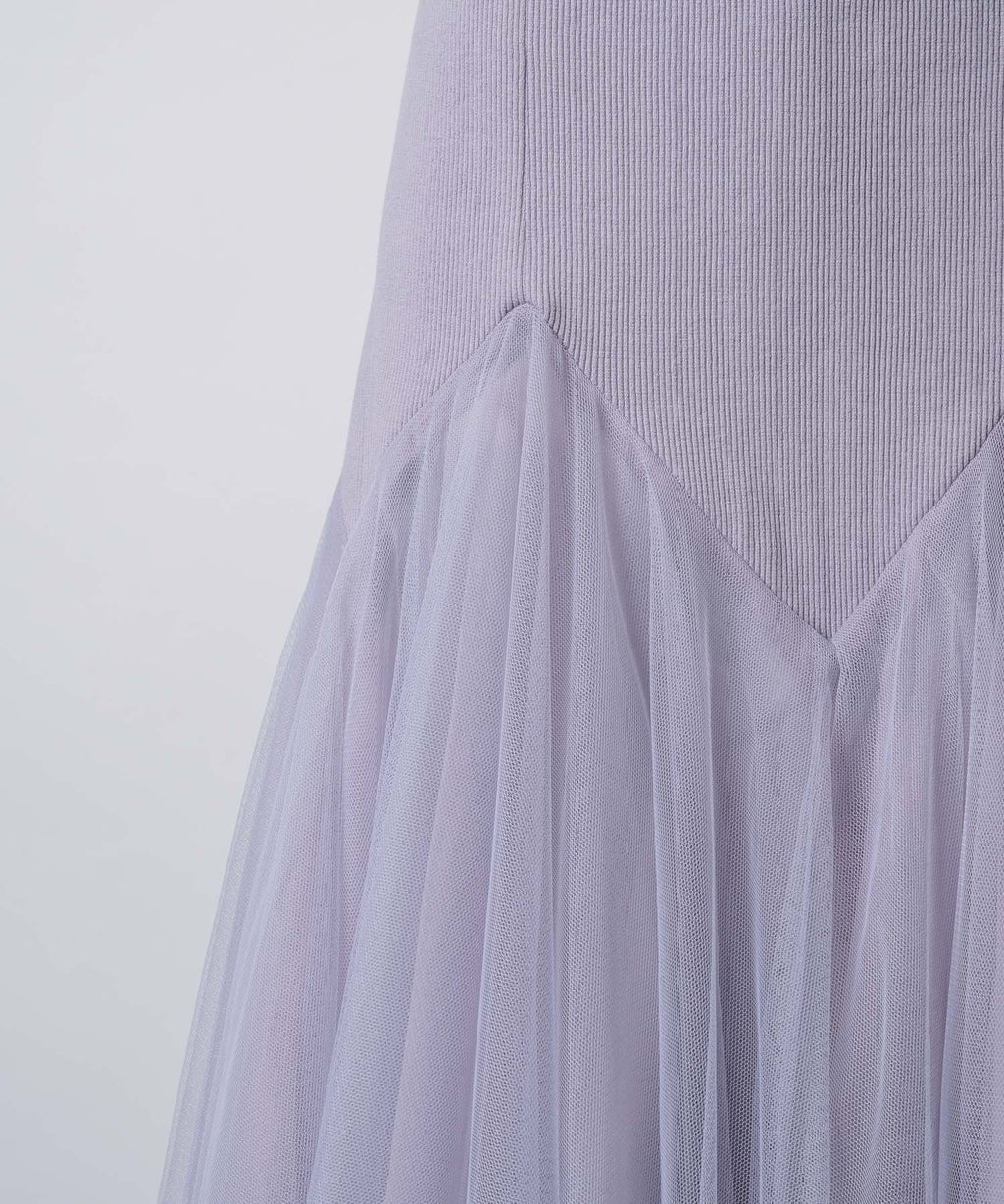 カジュアルなリブ素材とフェミニンなソフトチュールやオーガンジーを組み合わせることで