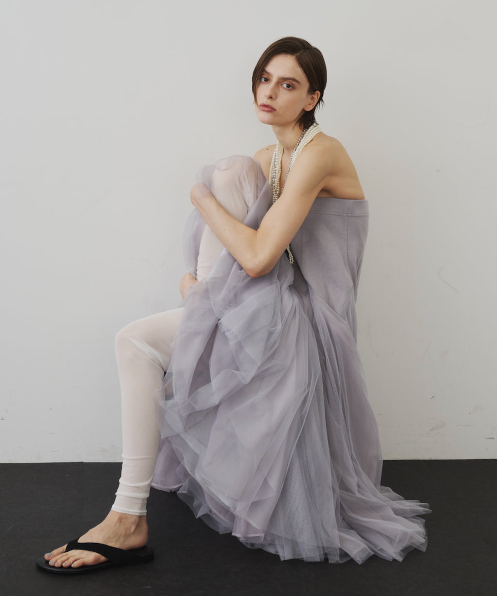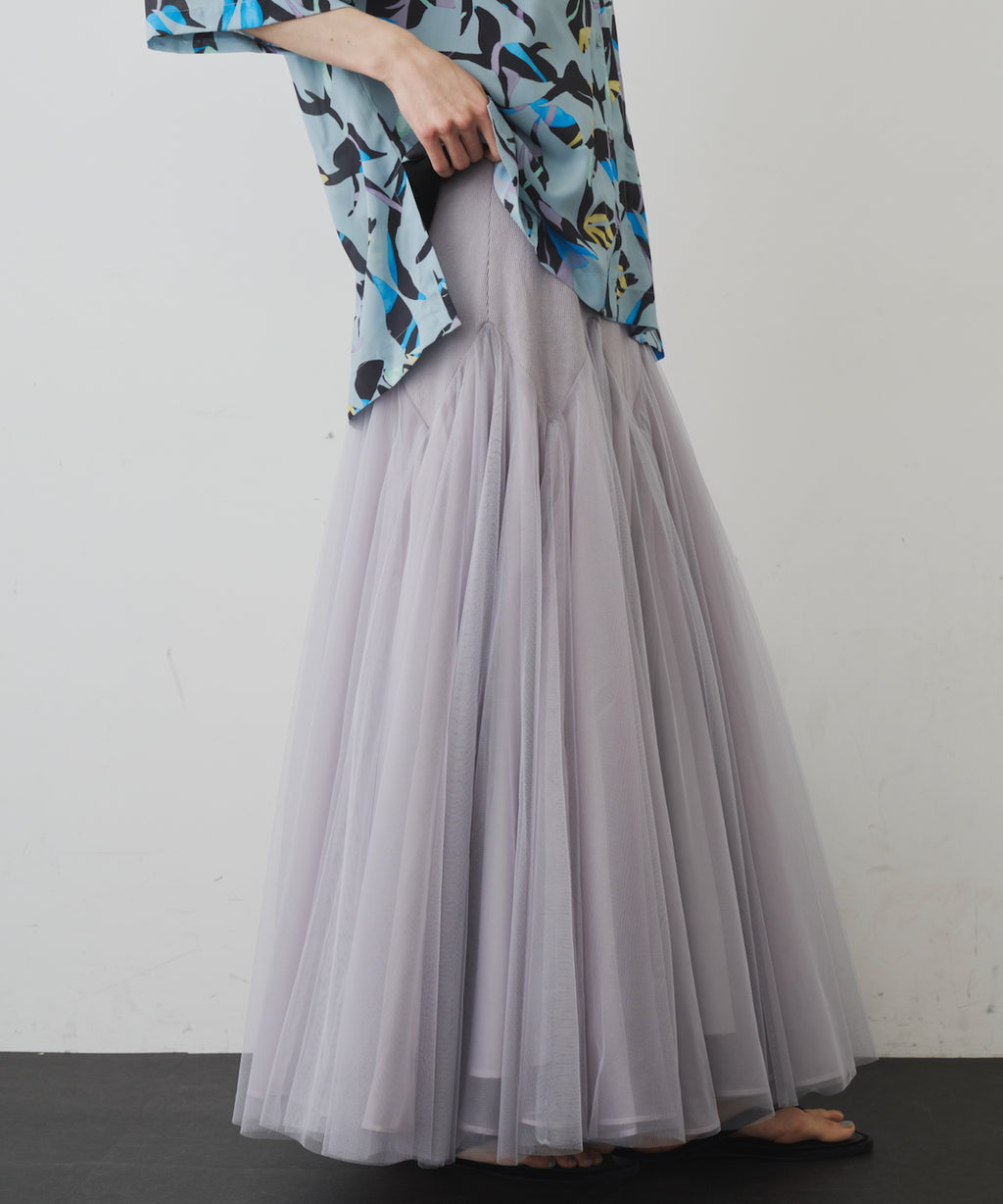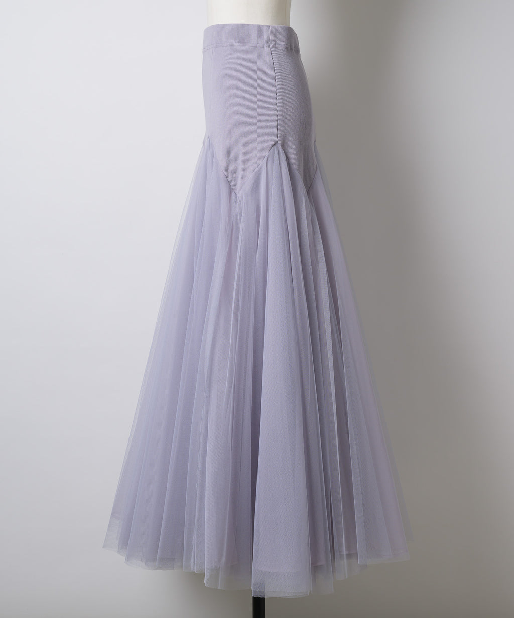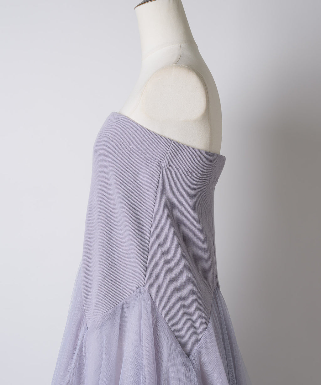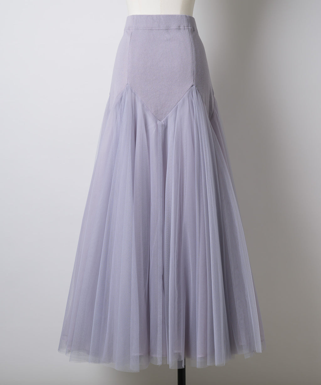 カジュアルなリブ素材とフェミニンなソフトチュールやオーガンジーを組み合わせることで