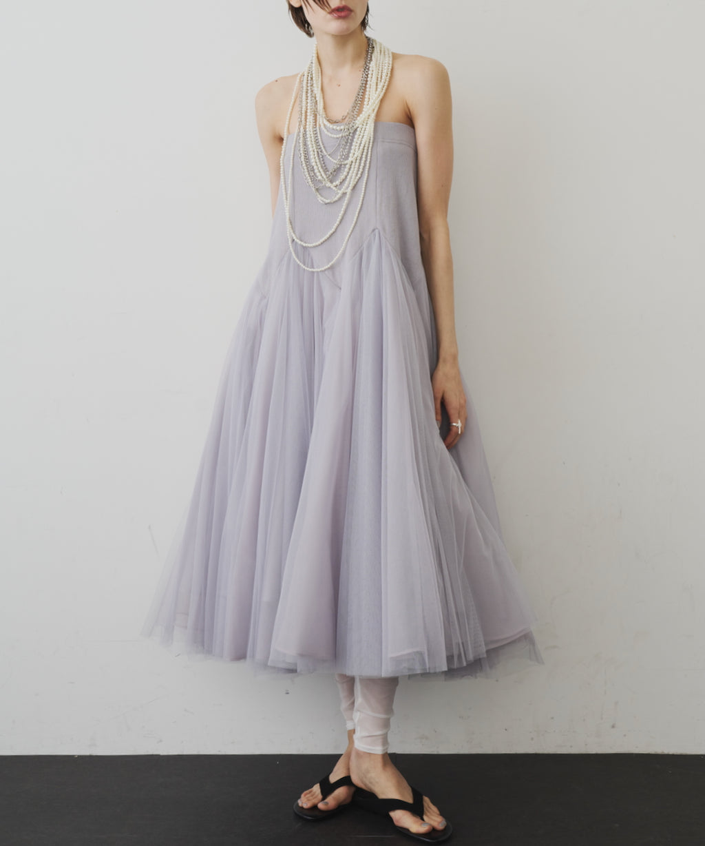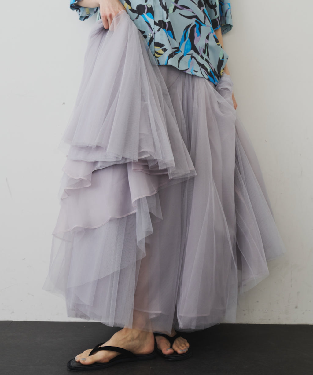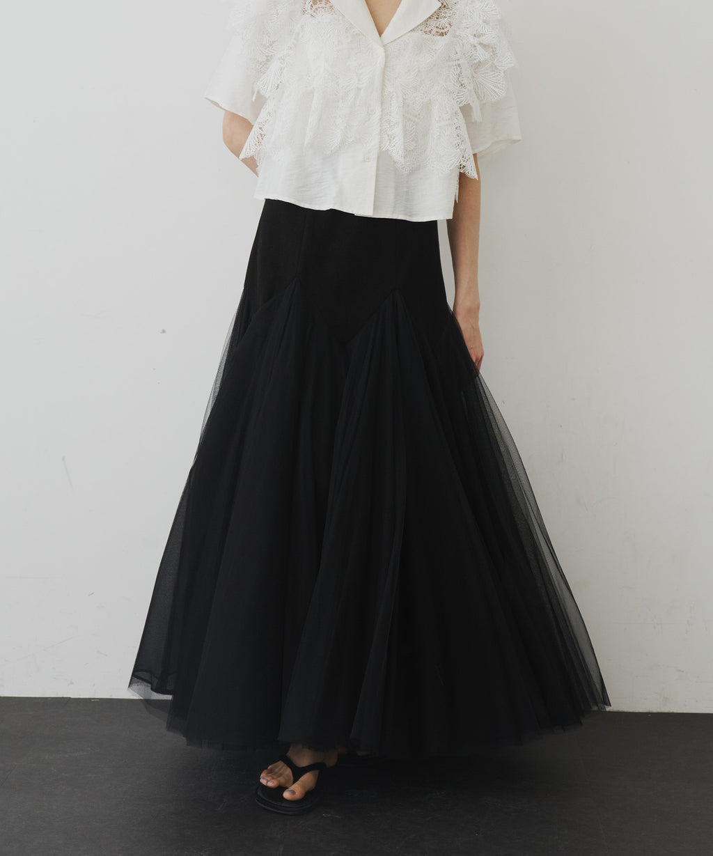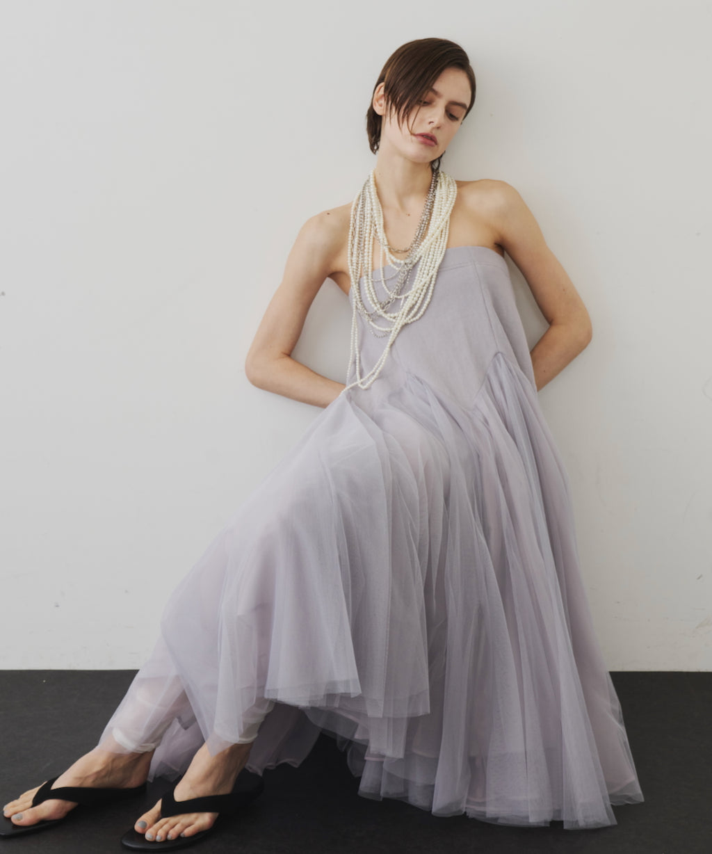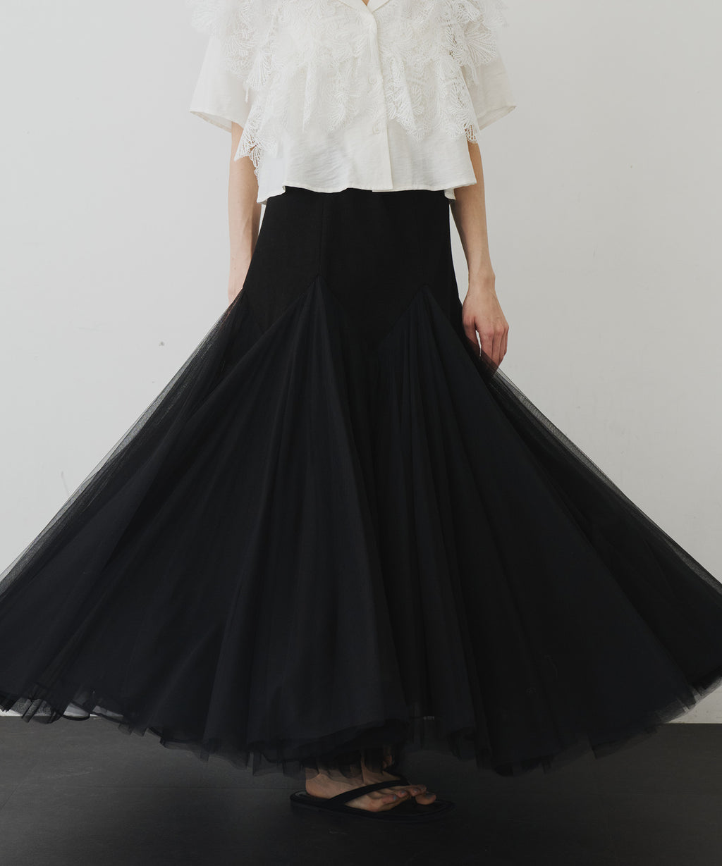 カジュアルなリブ素材とフェミニンなソフトチュールやオーガンジーを組み合わせることで