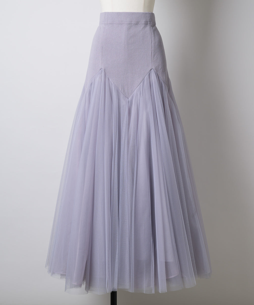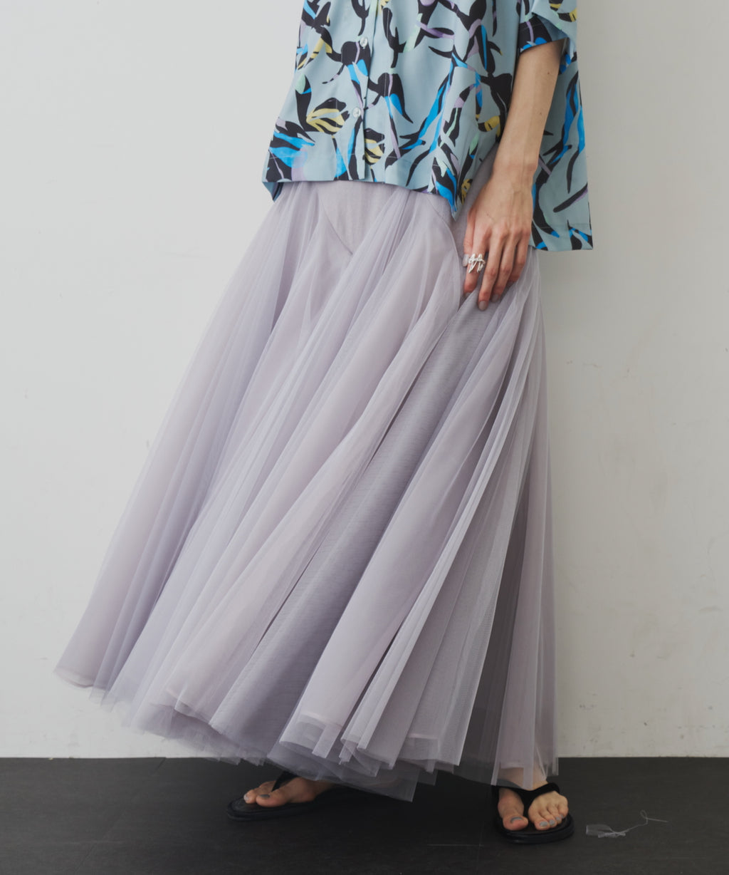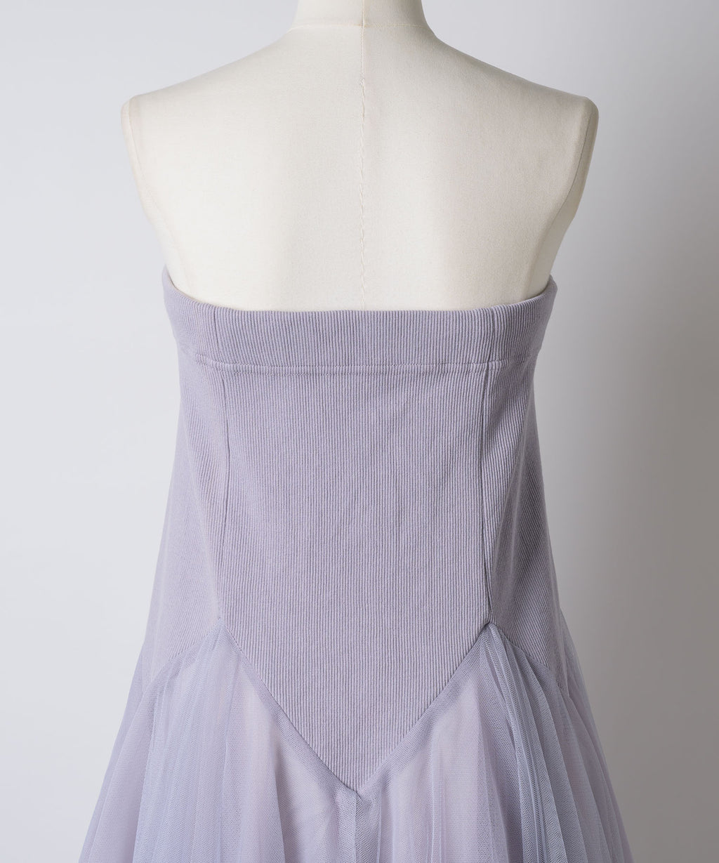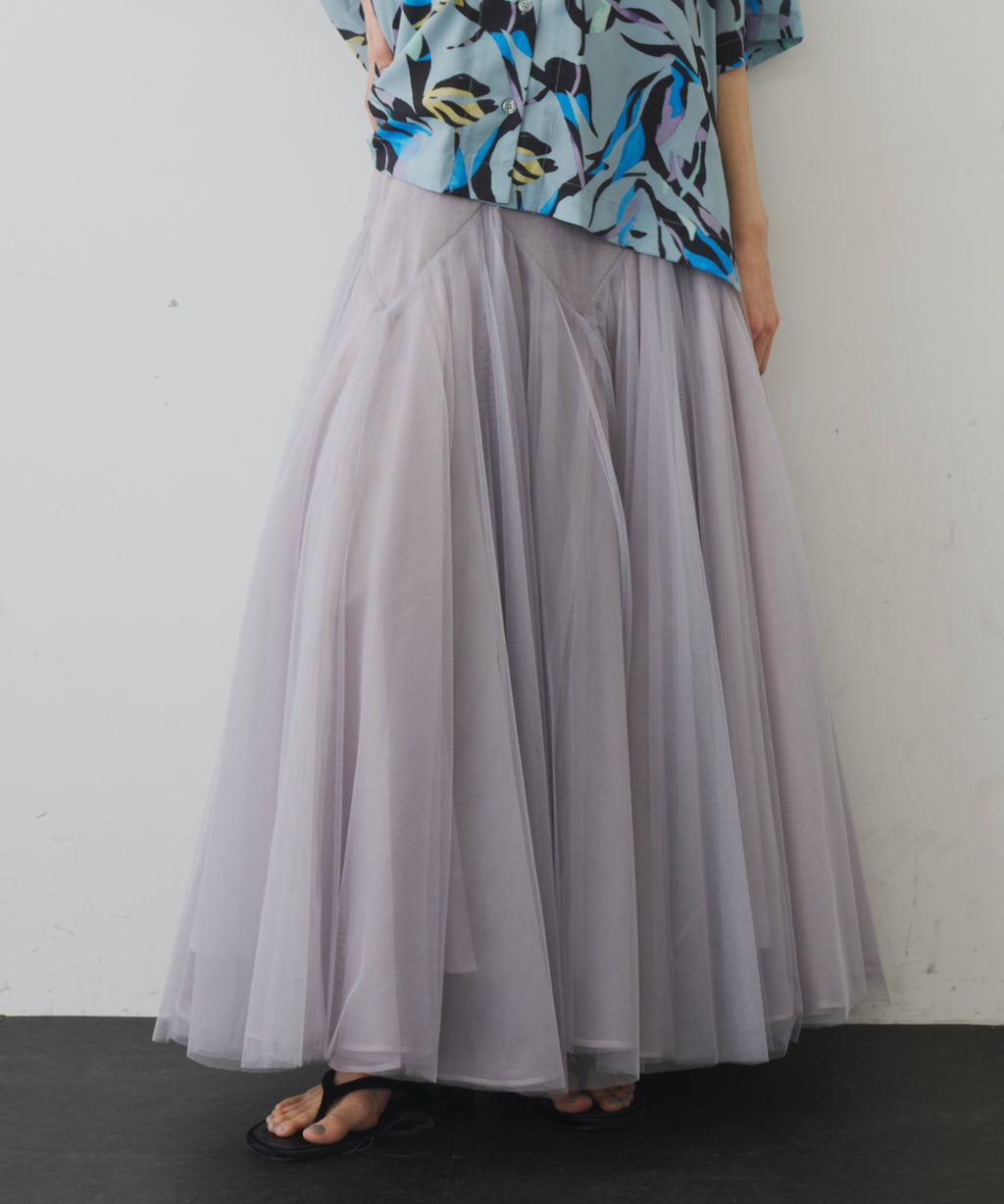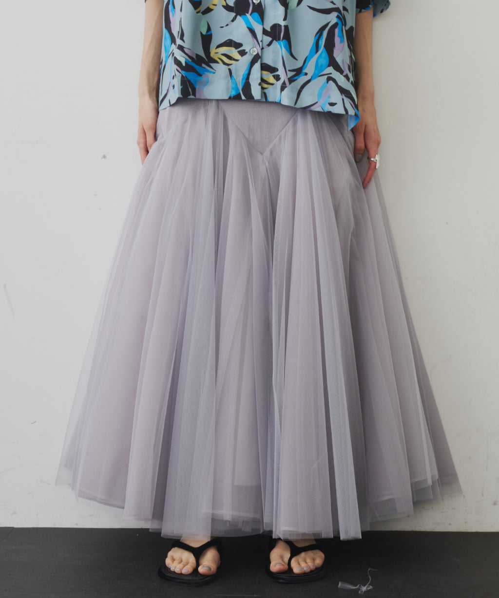 カジュアルなリブ素材とフェミニンなソフトチュールやオーガンジーを組み合わせることで