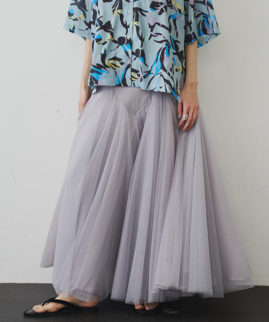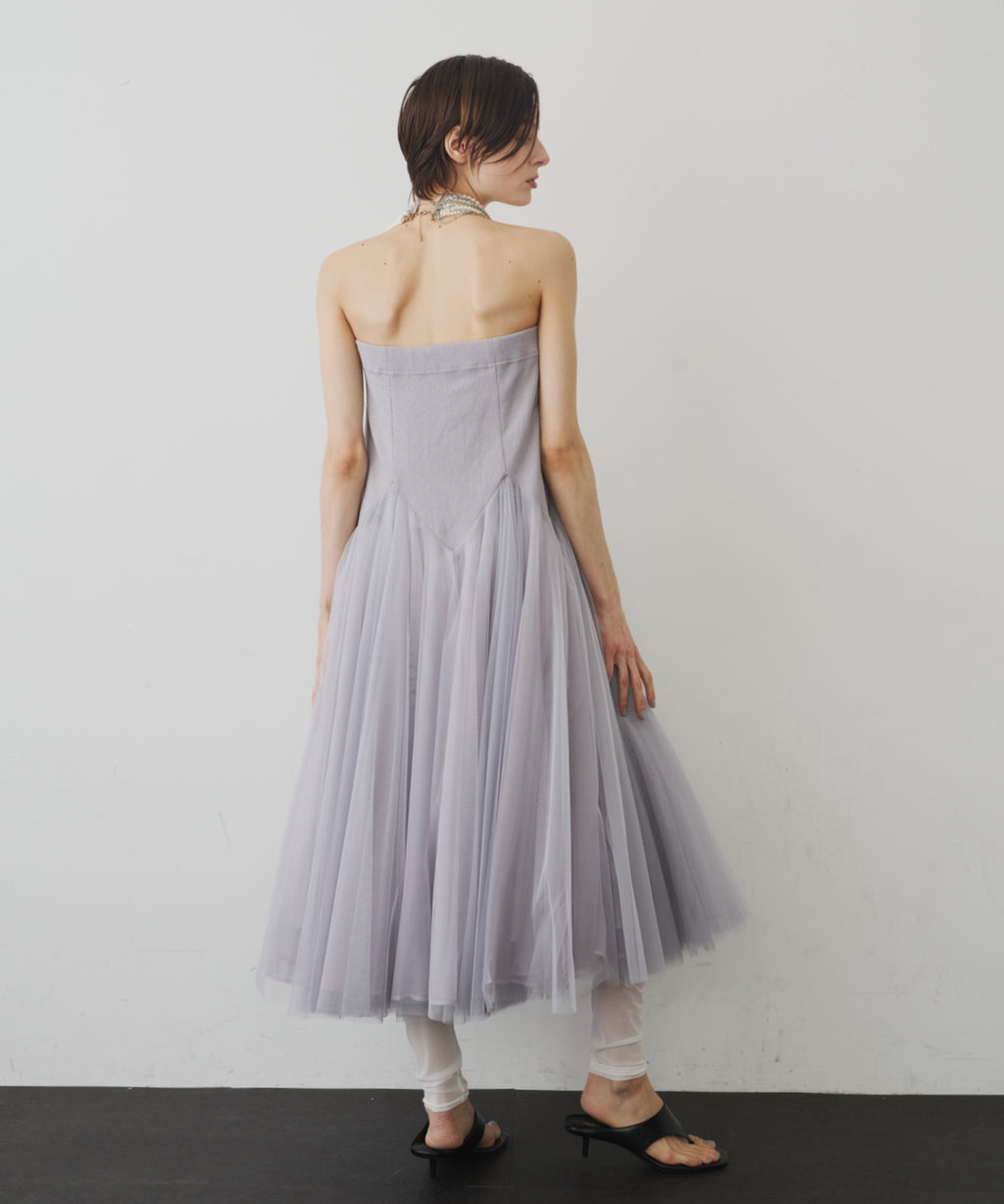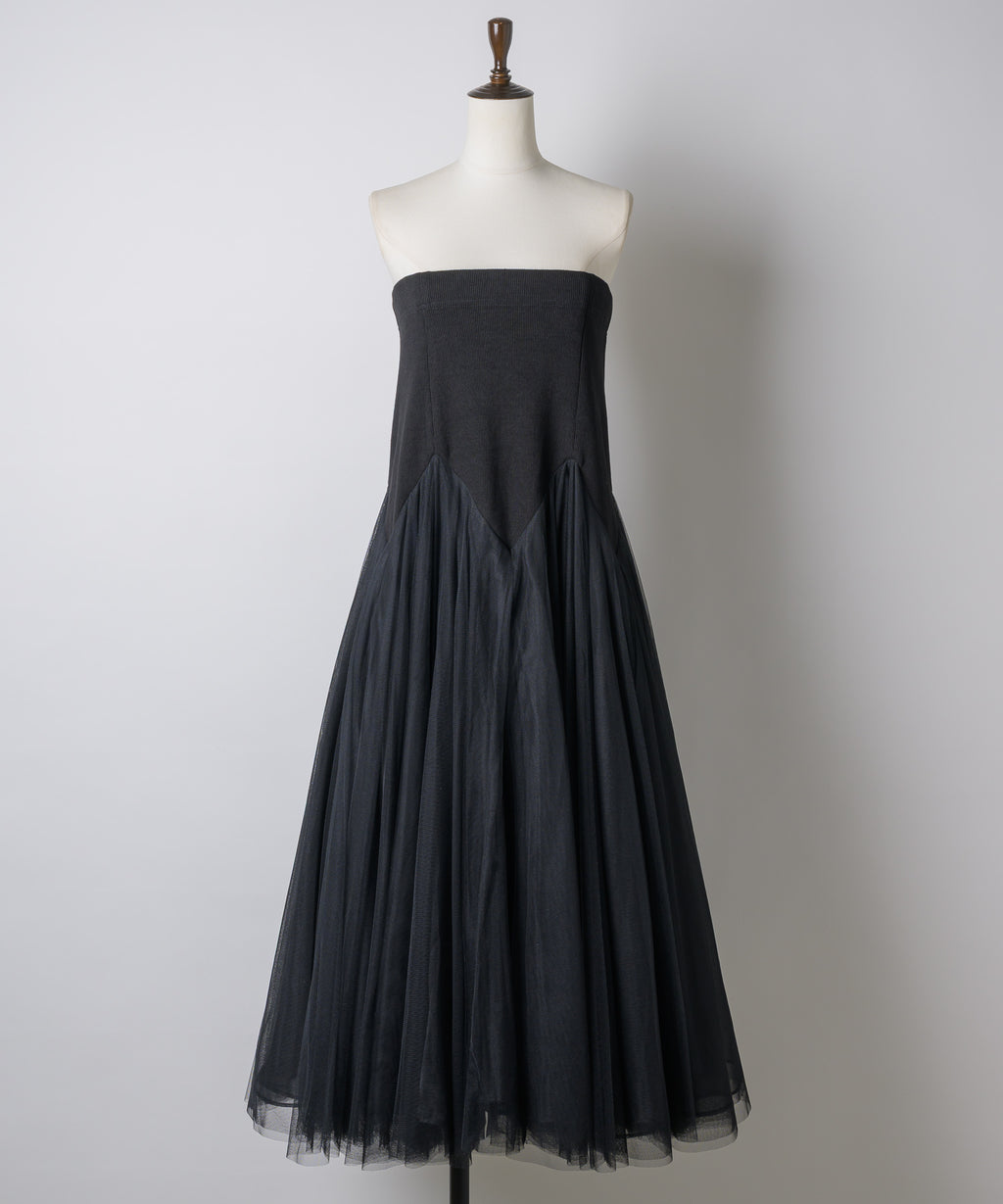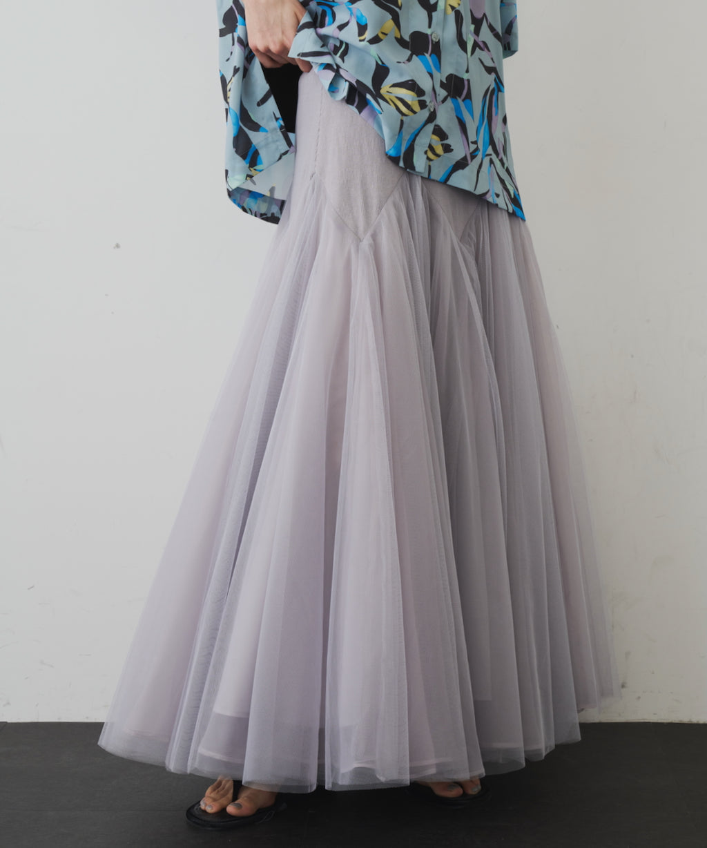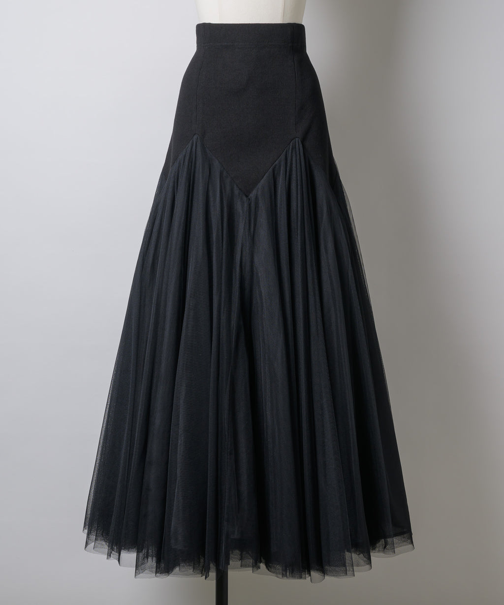 カジュアルなリブ素材とフェミニンなソフトチュールやオーガンジーを組み合わせることで