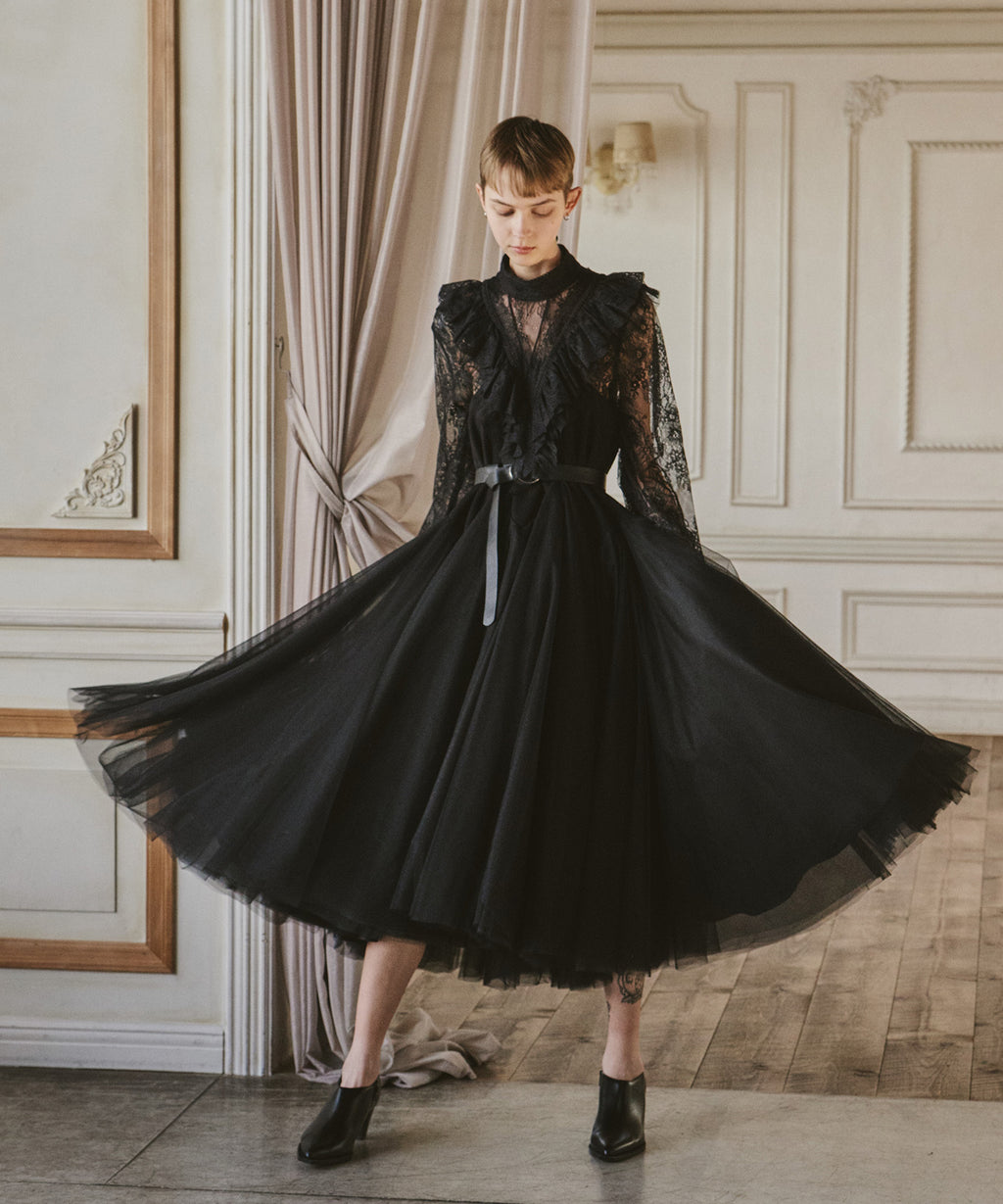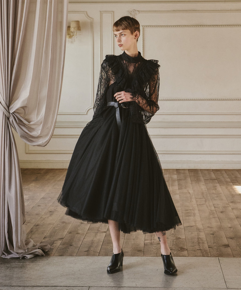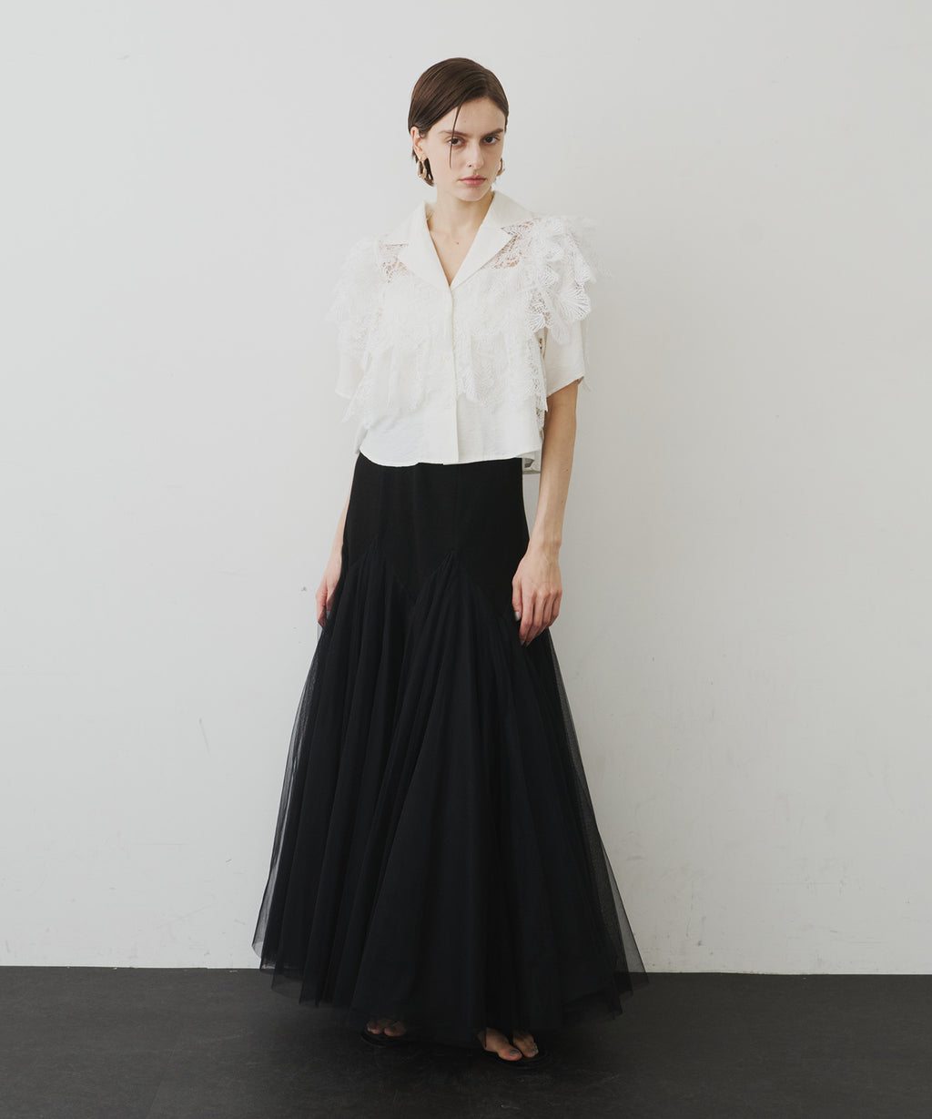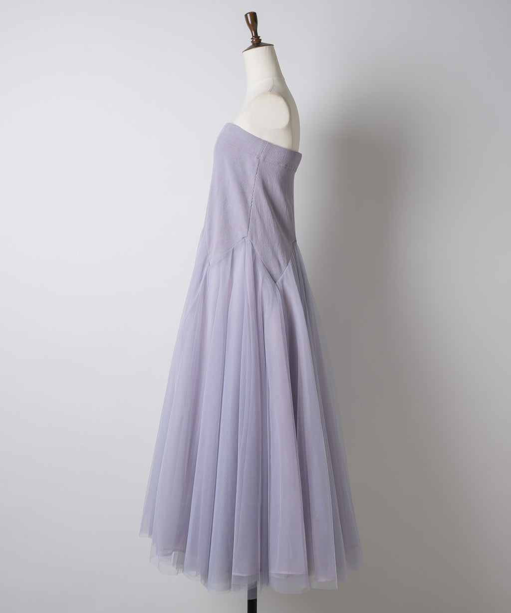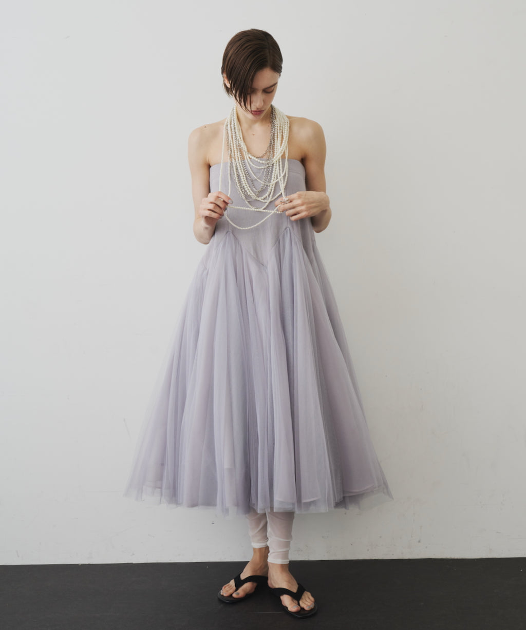 カジュアルなリブ素材とフェミニンなソフトチュールやオーガンジーを組み合わせることで