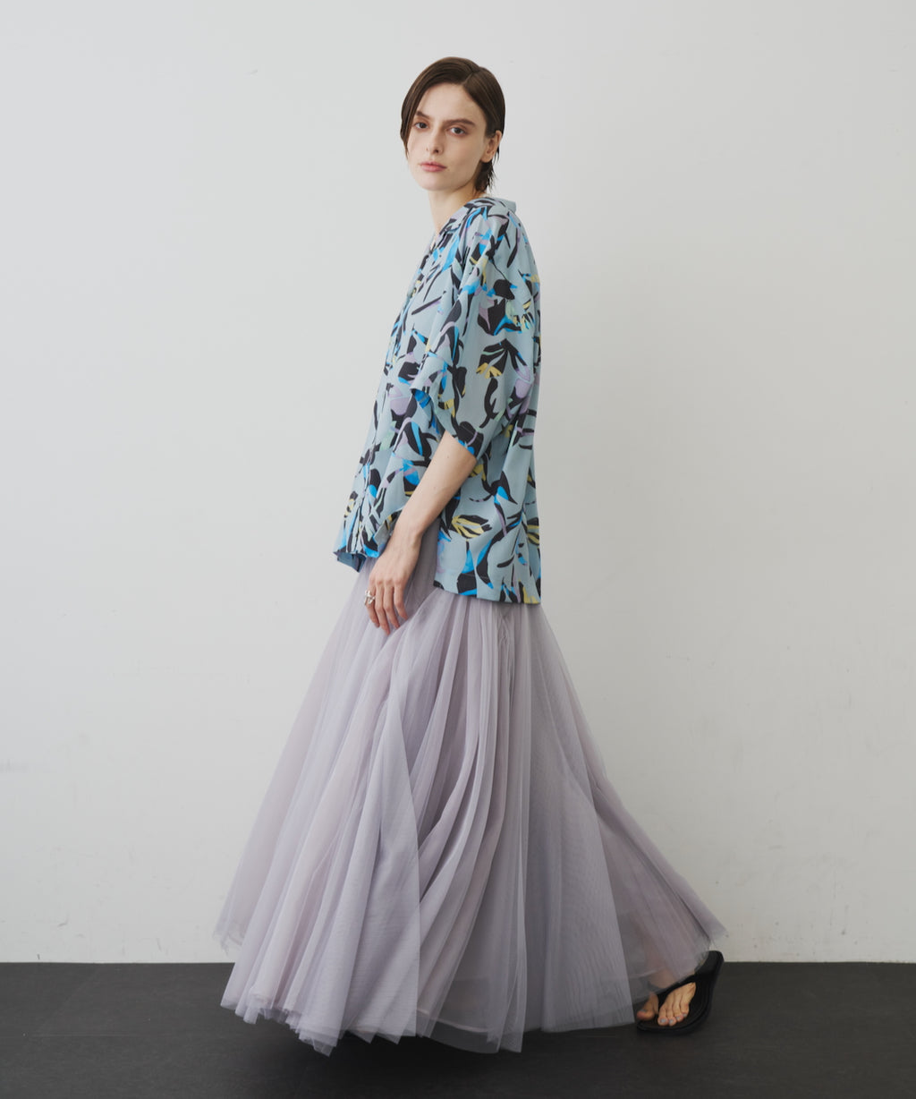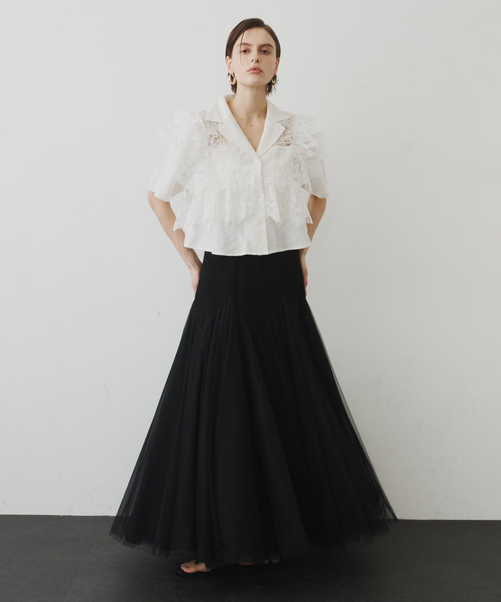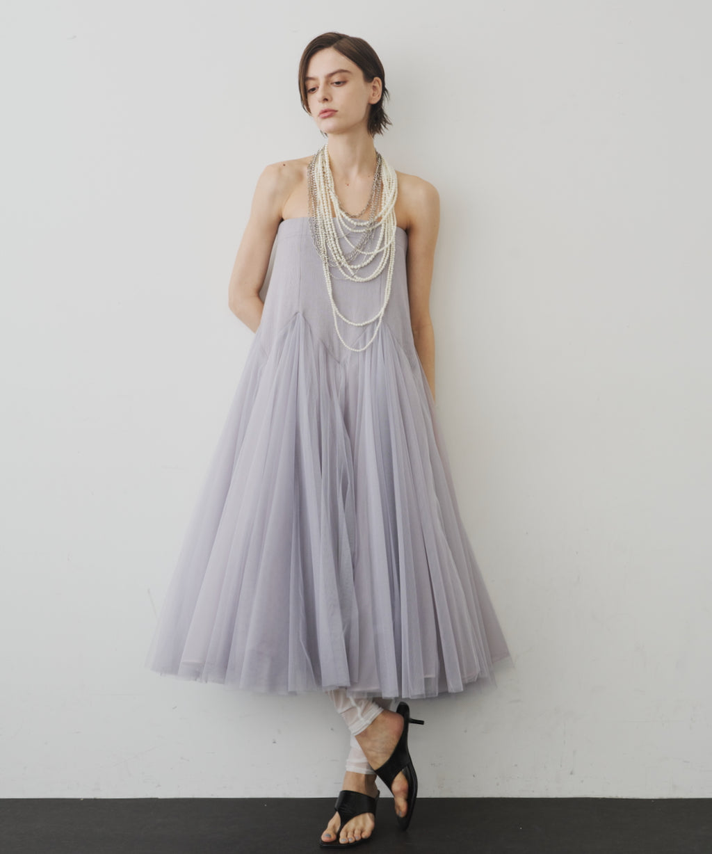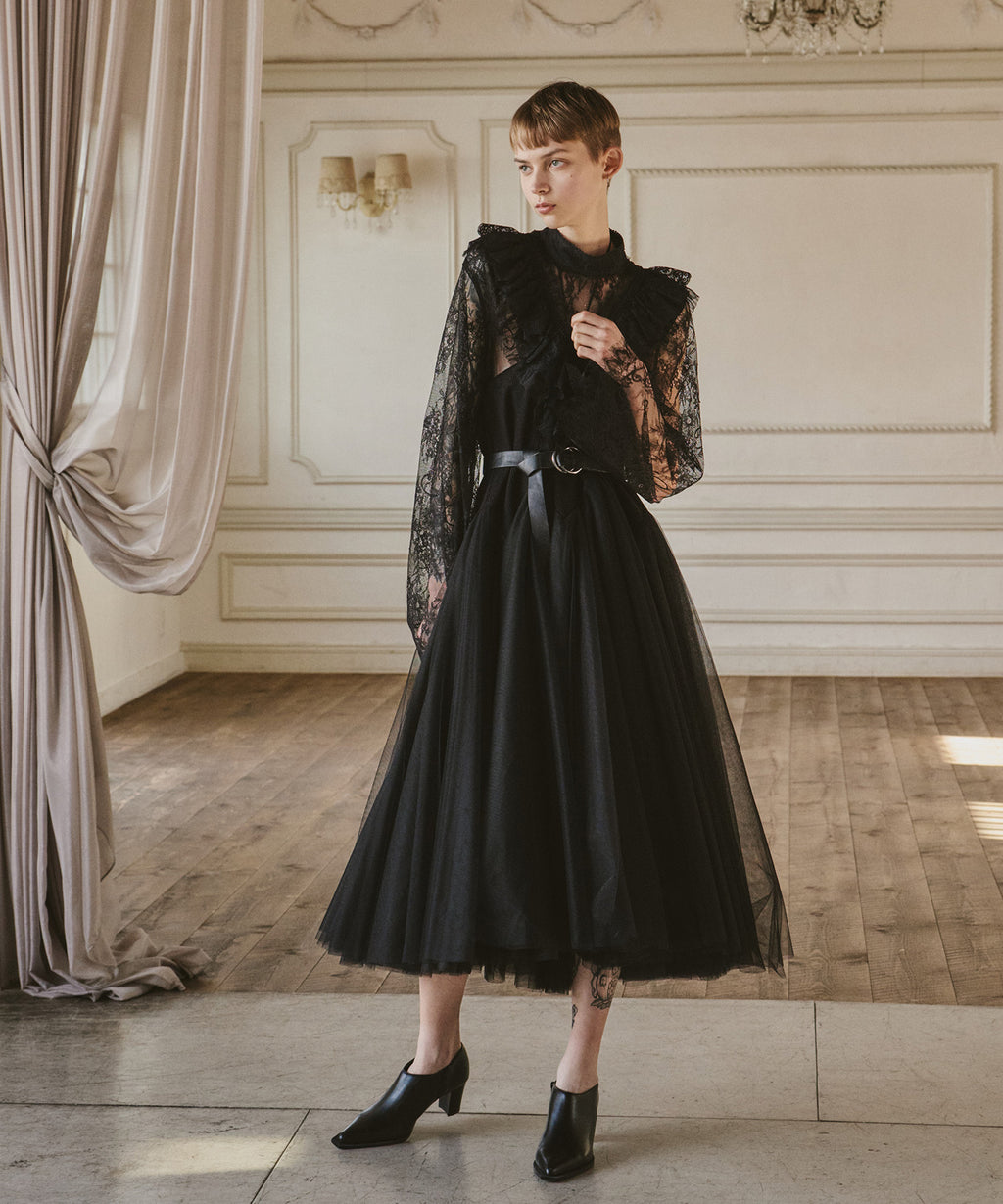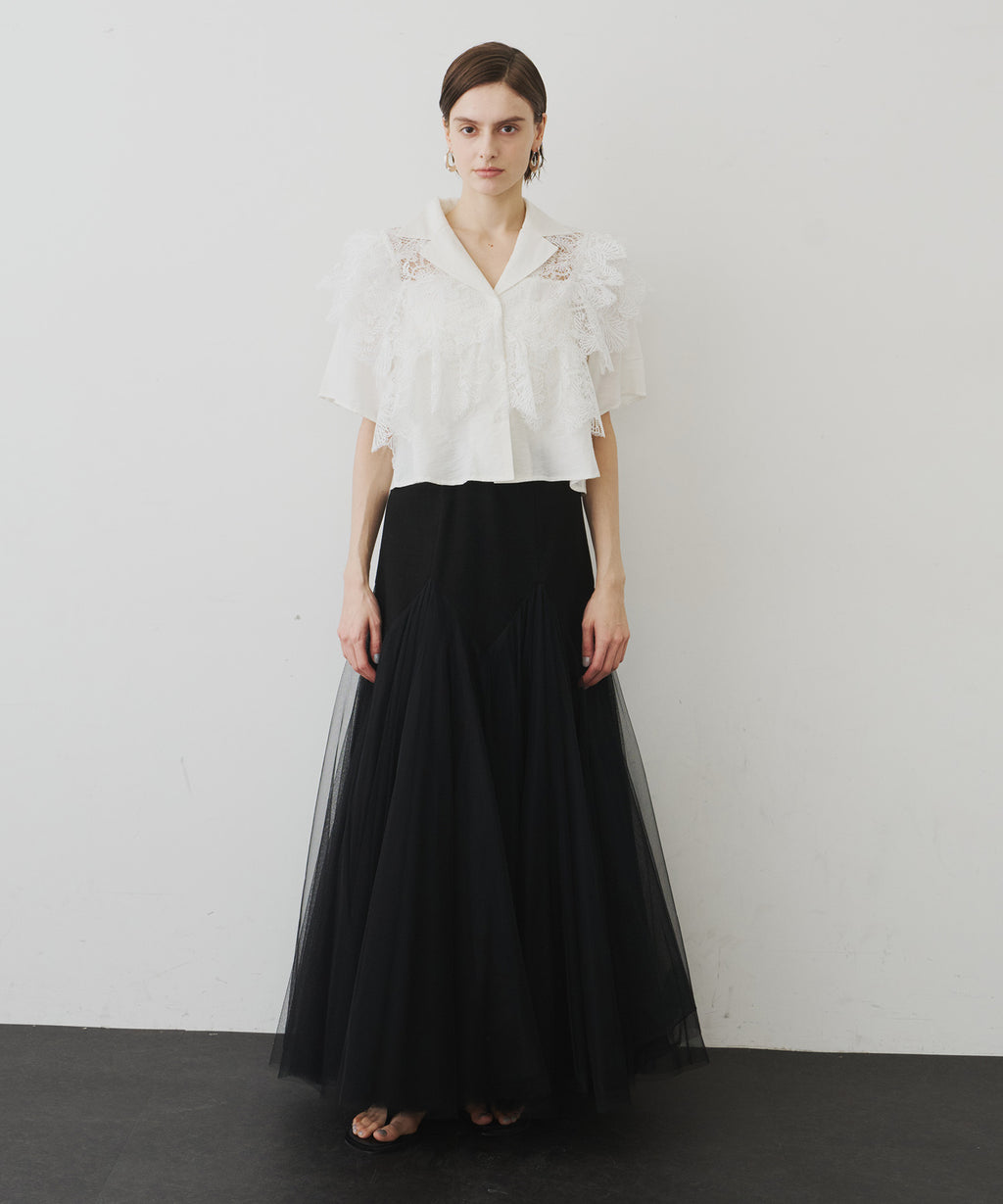 カジュアルなリブ素材とフェミニンなソフトチュールやオーガンジーを組み合わせることで