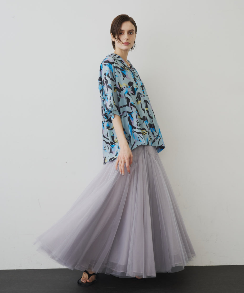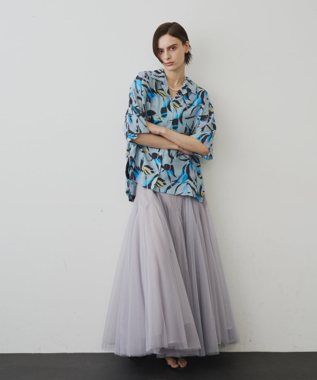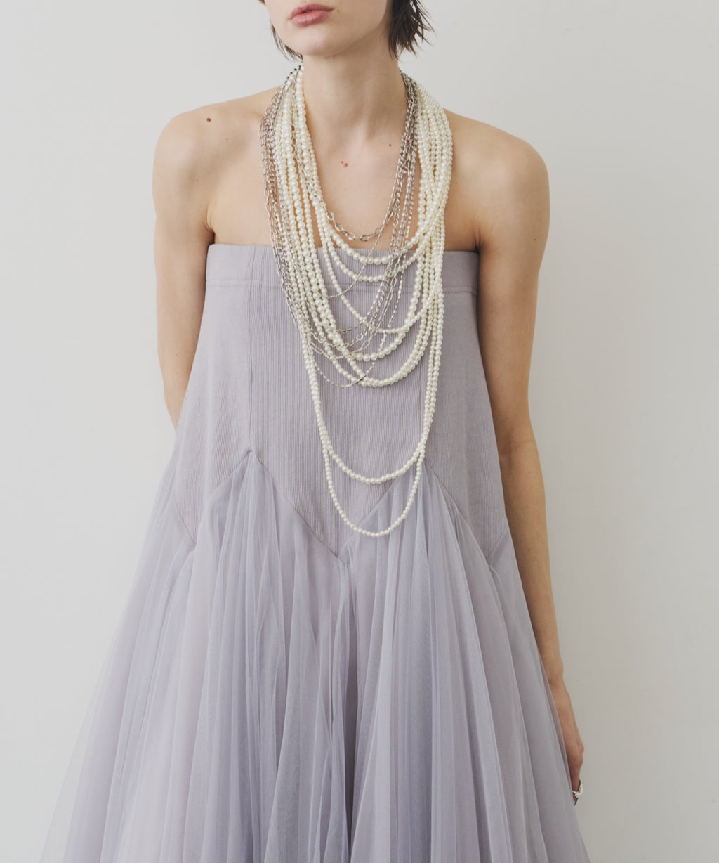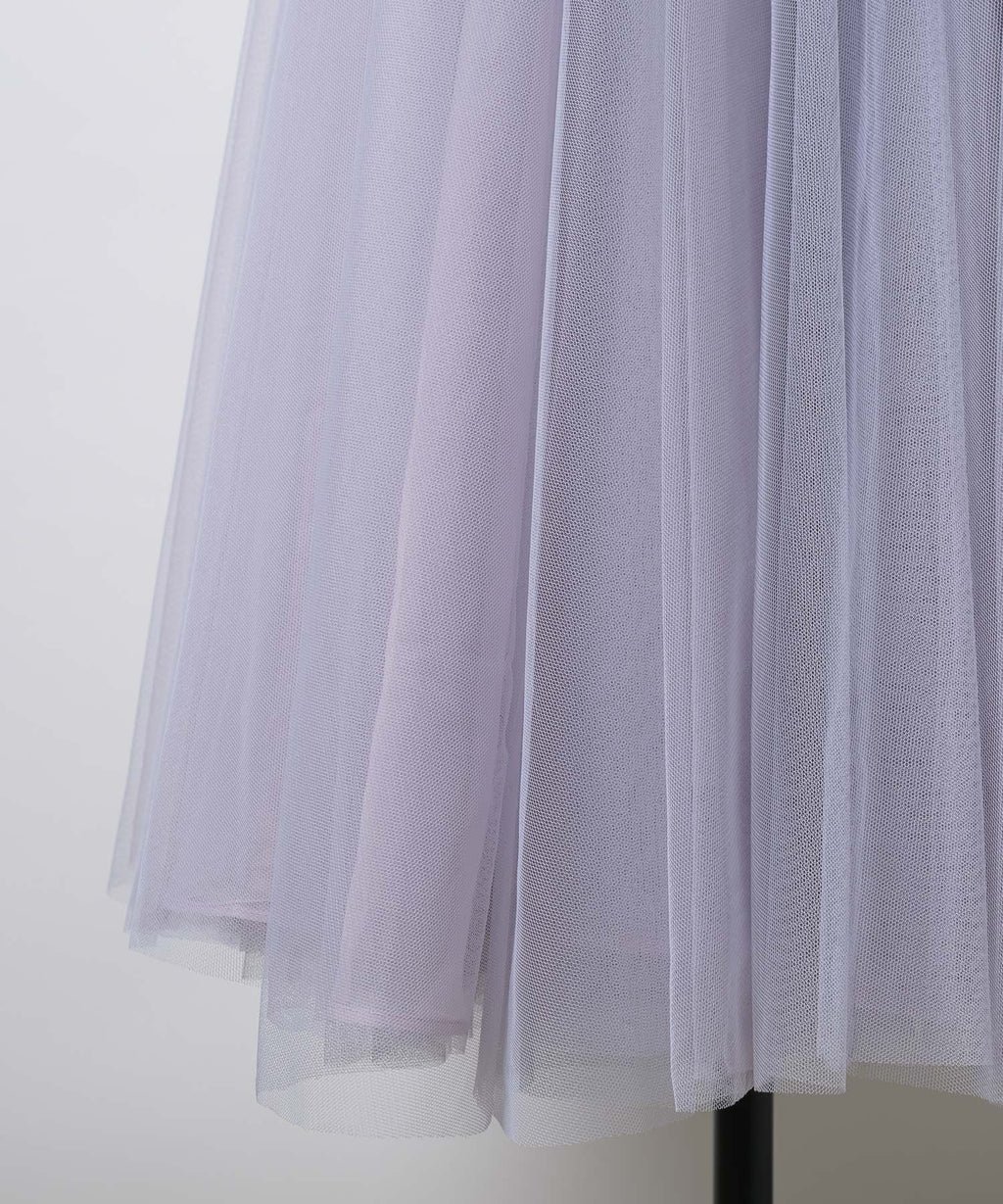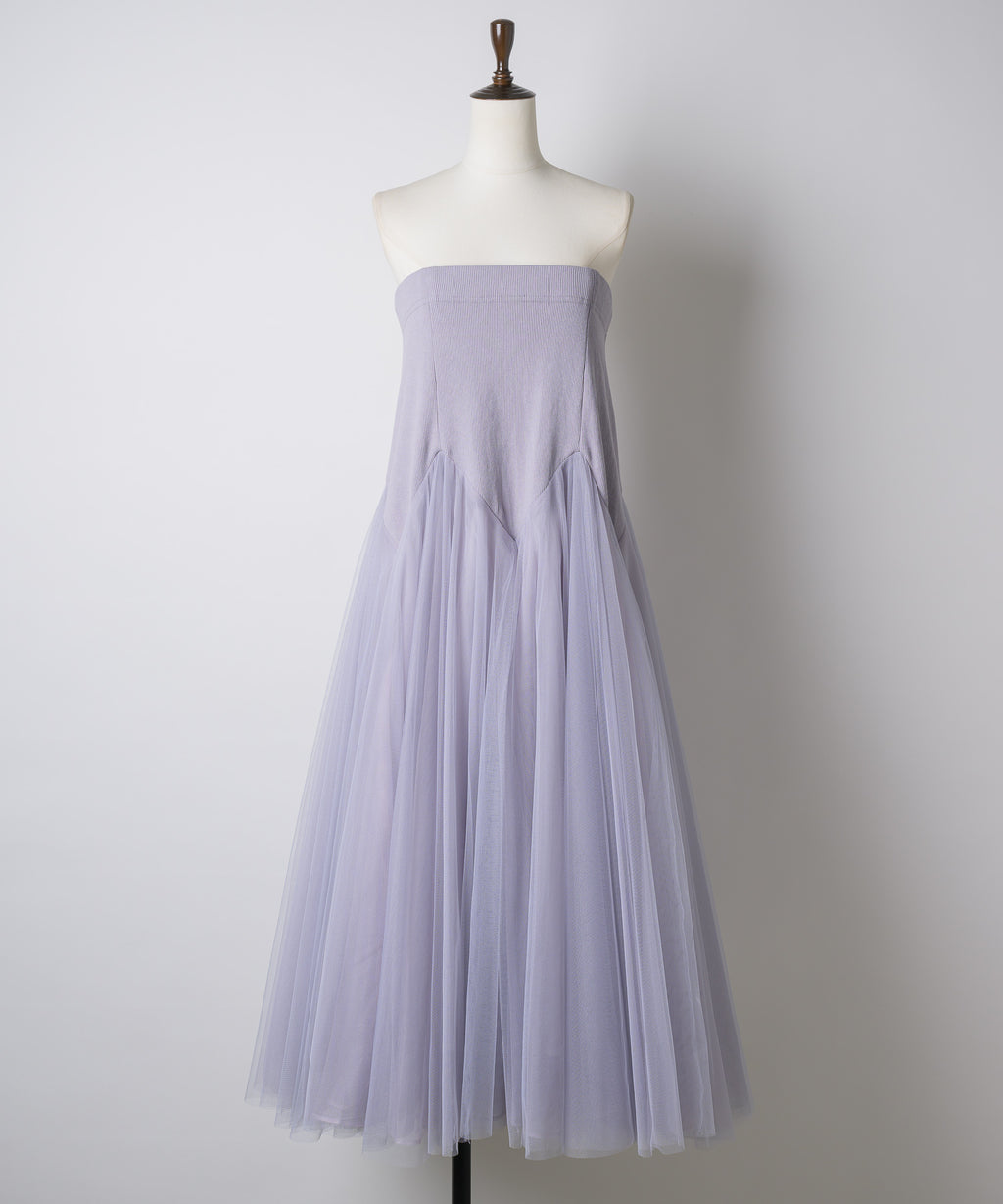 カジュアルなリブ素材とフェミニンなソフトチュールやオーガンジーを組み合わせることで
