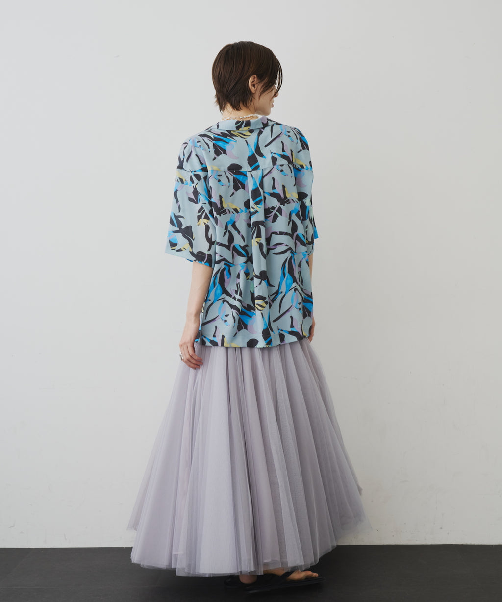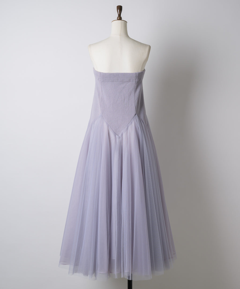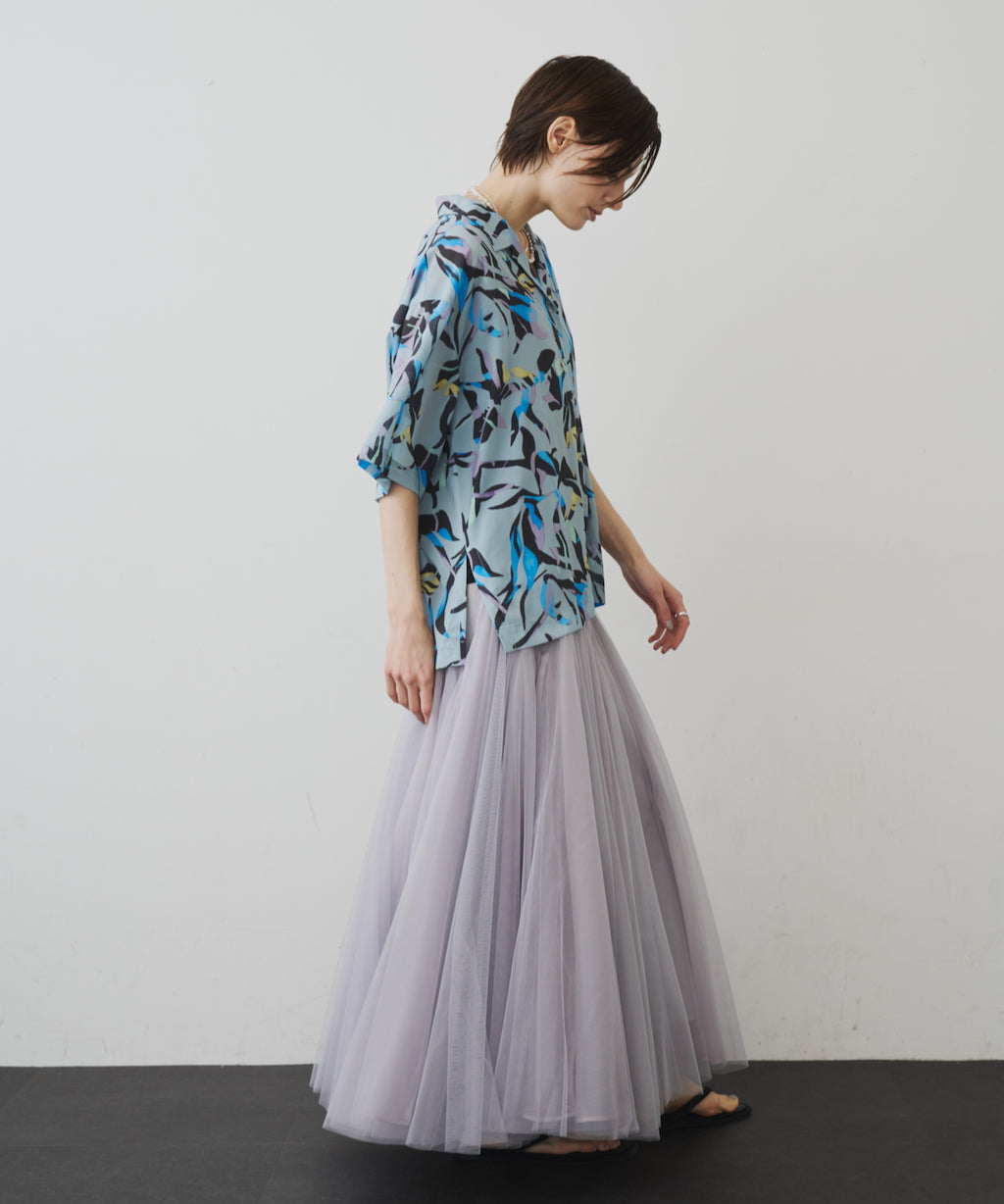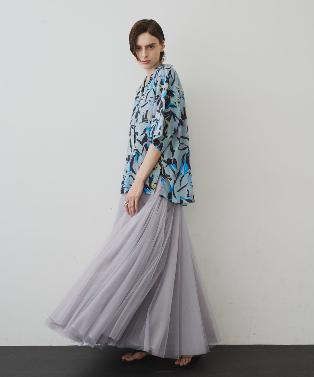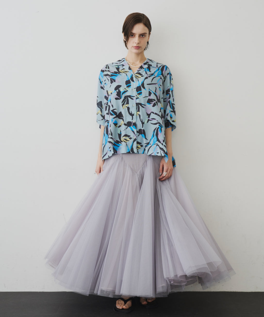 カジュアルなリブ素材とフェミニンなソフトチュールやオーガンジーを組み合わせることで