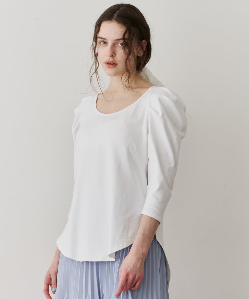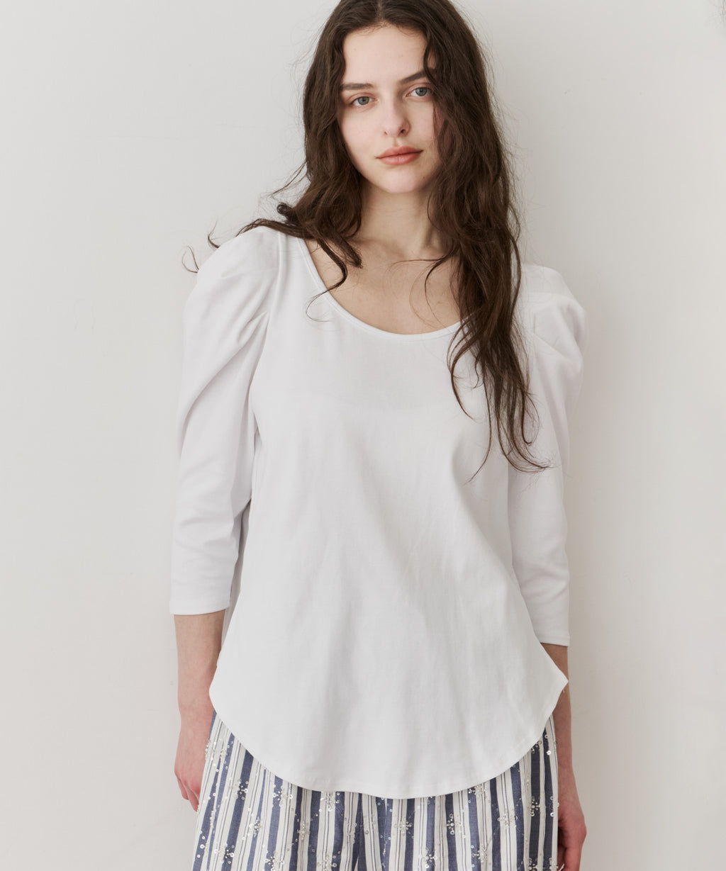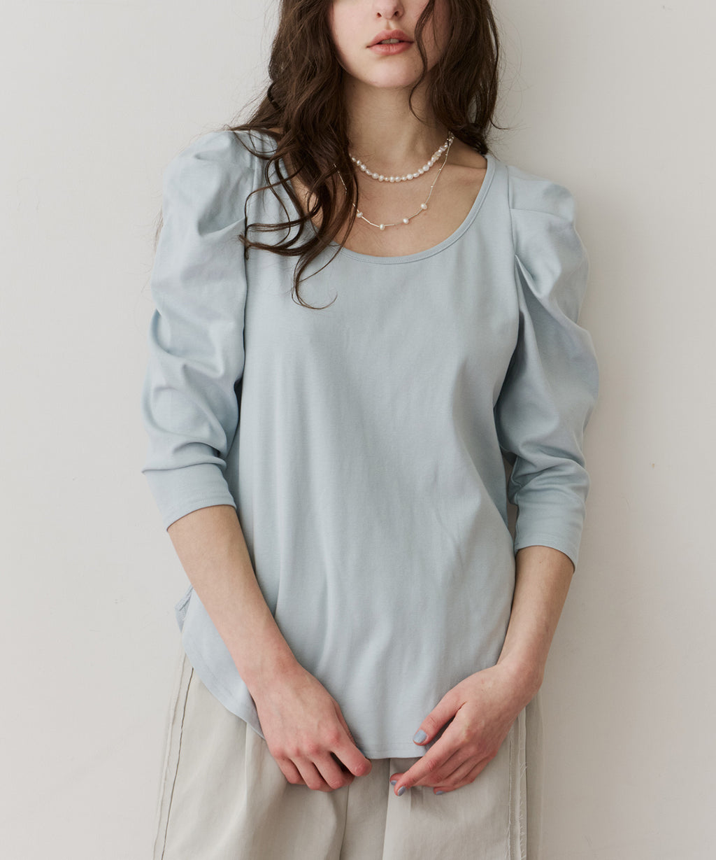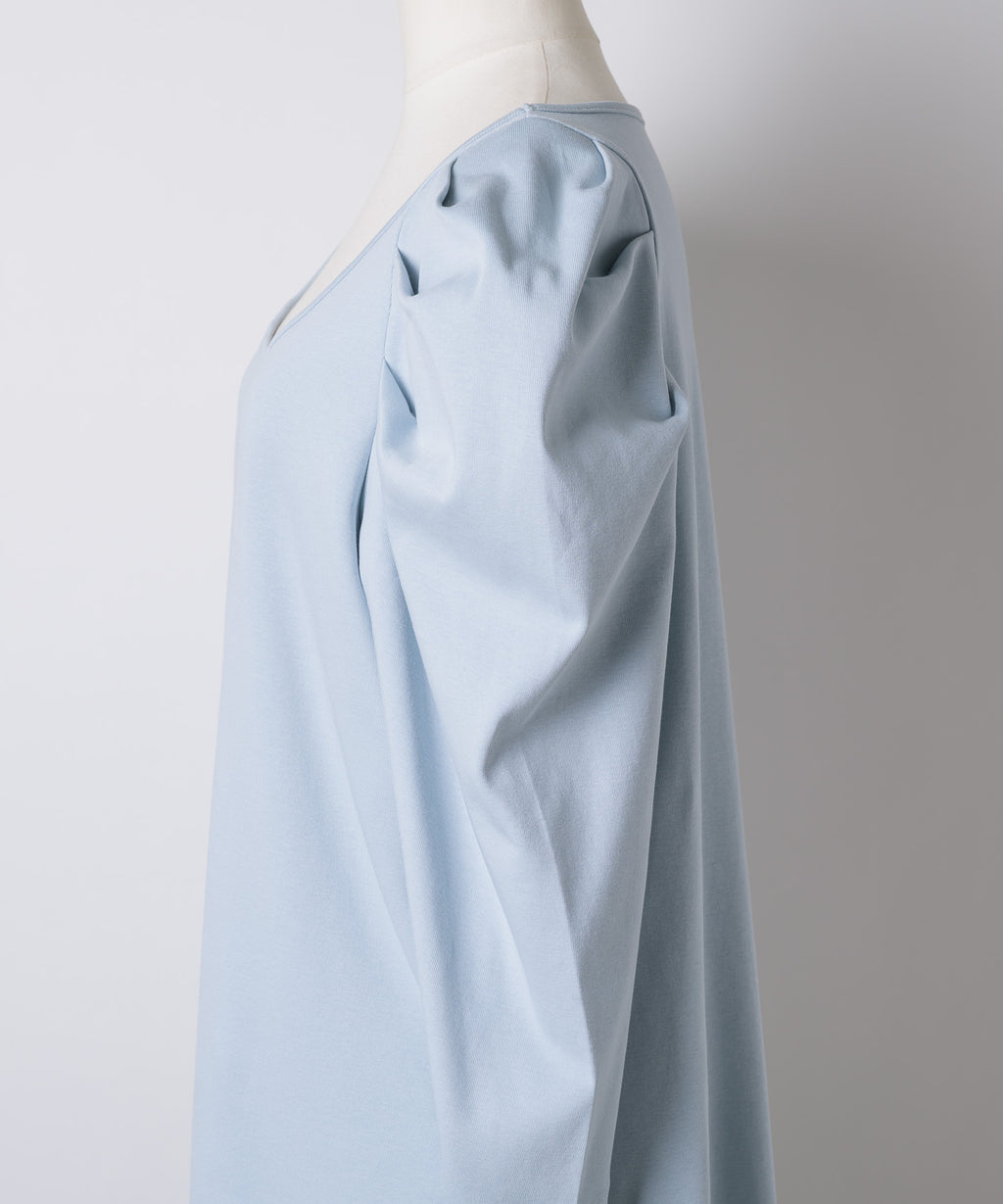 ざっくりと開けたUネックに対してギャザーを寄せた