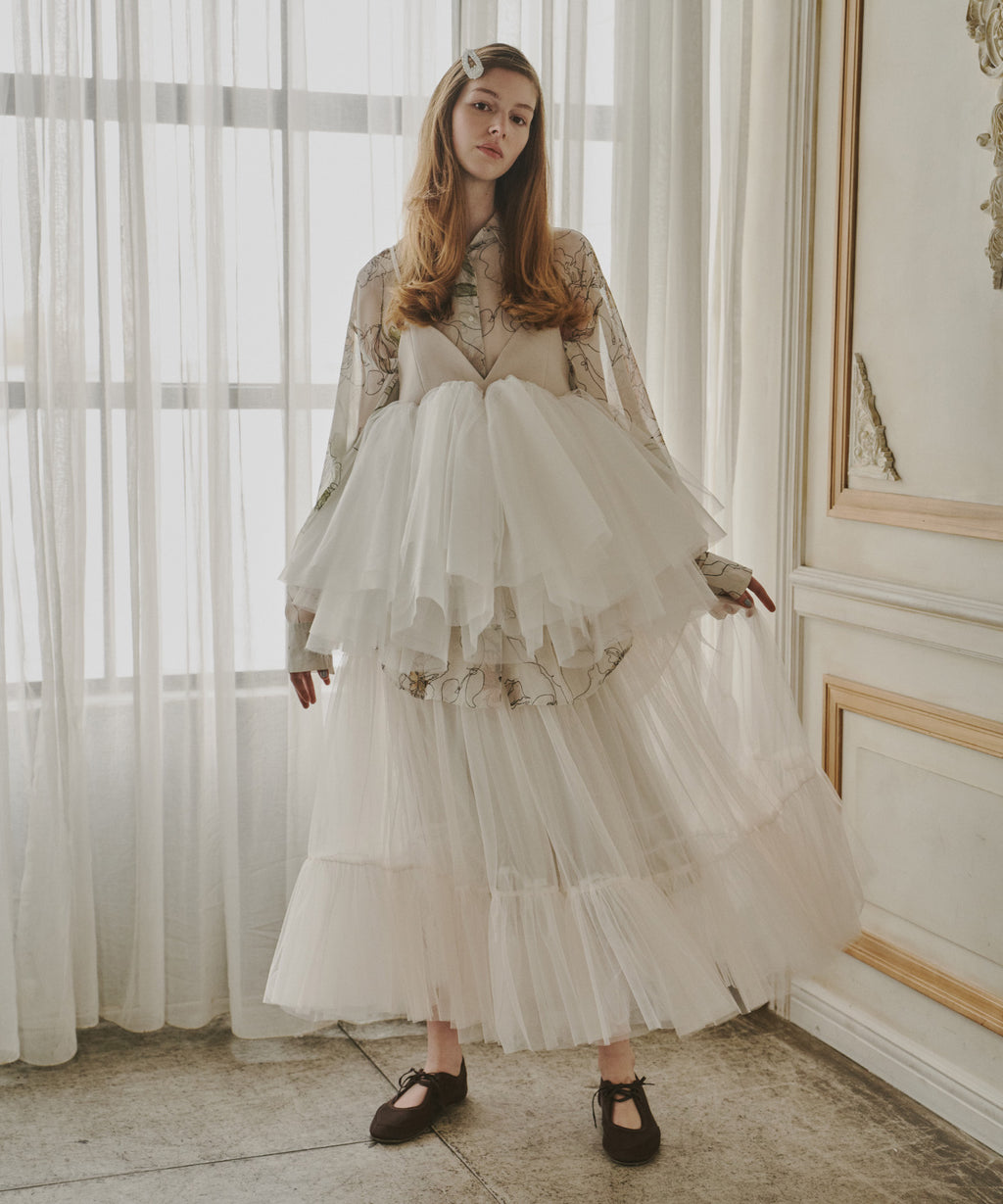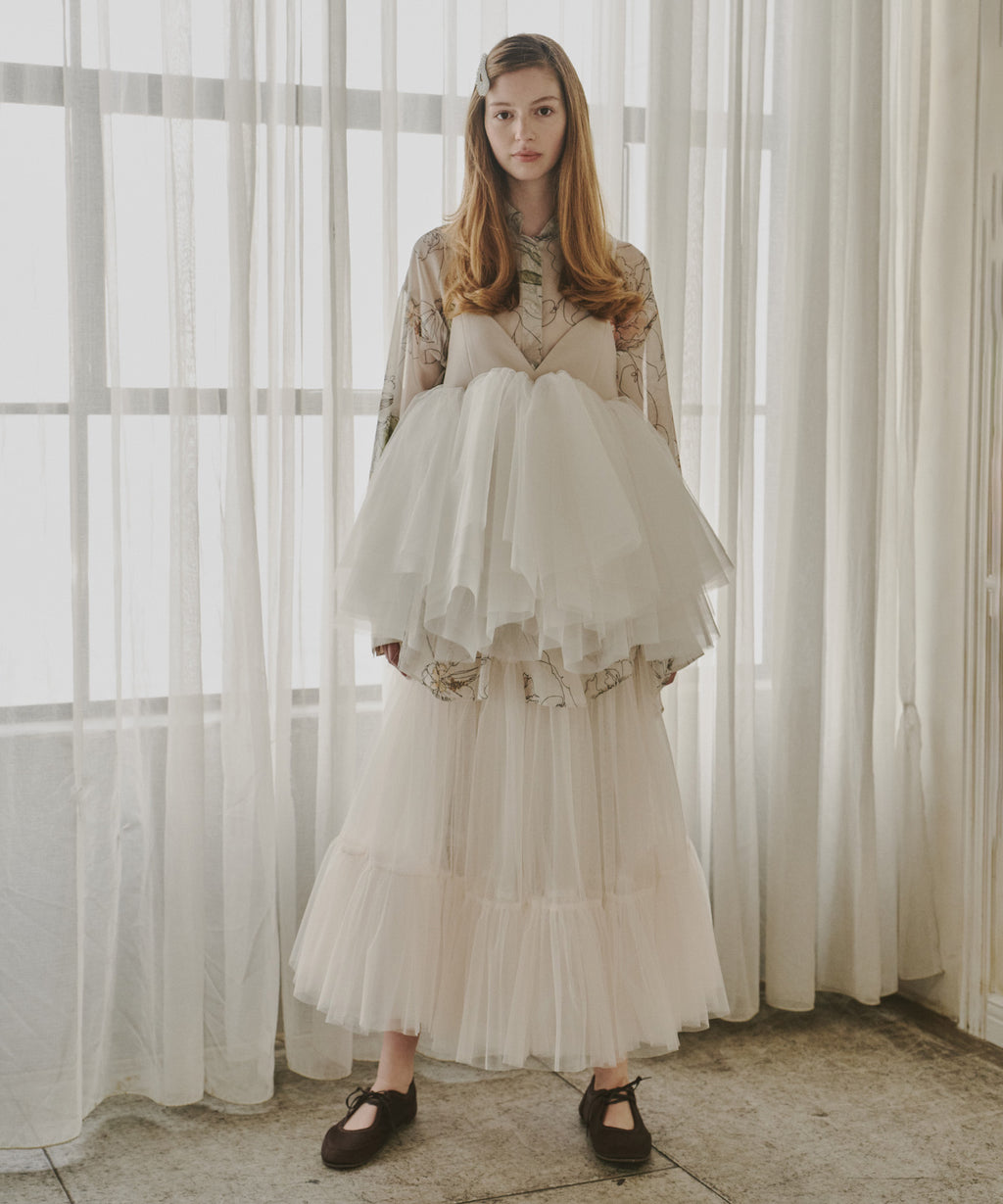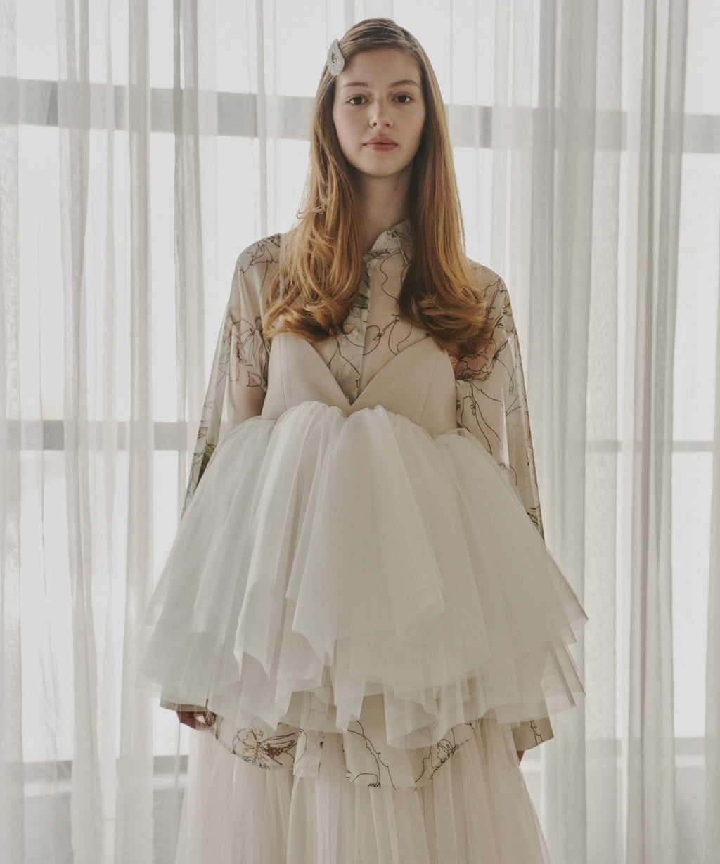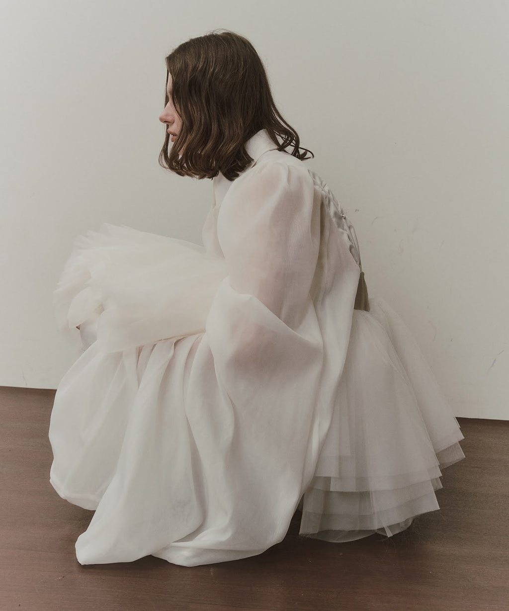 ハードチュール、オーガンジー、ソフトチュールを使ったエアリーな見え方と着心地がポイント。