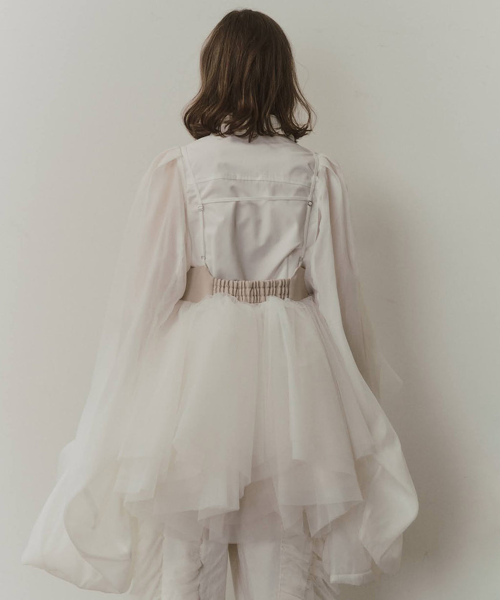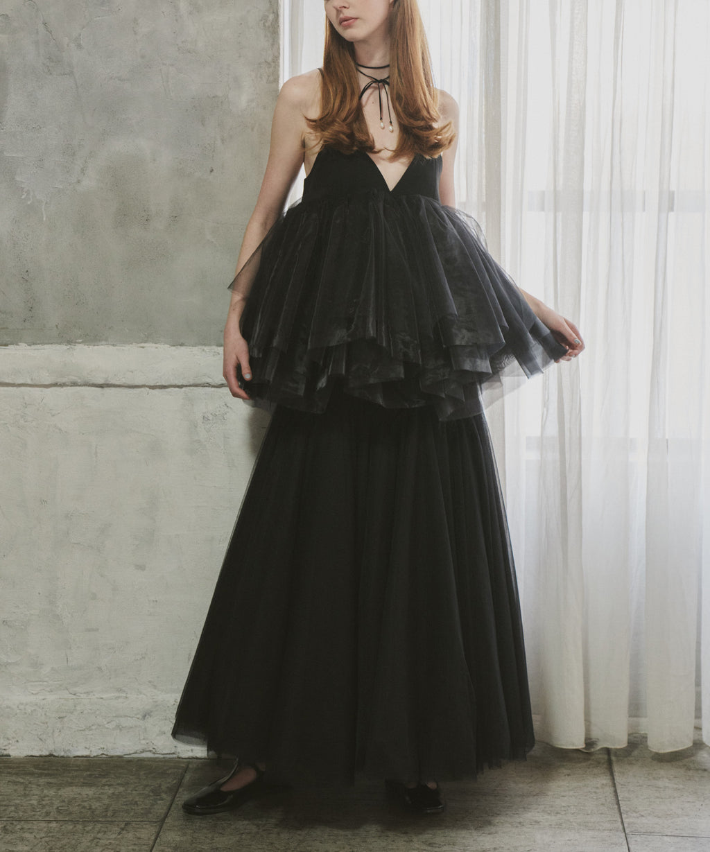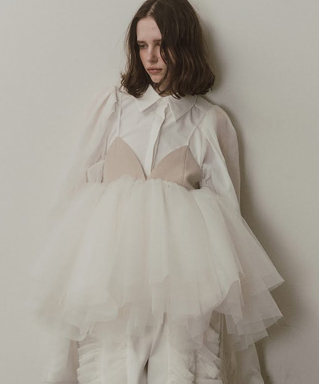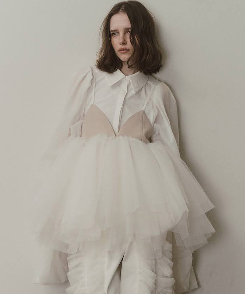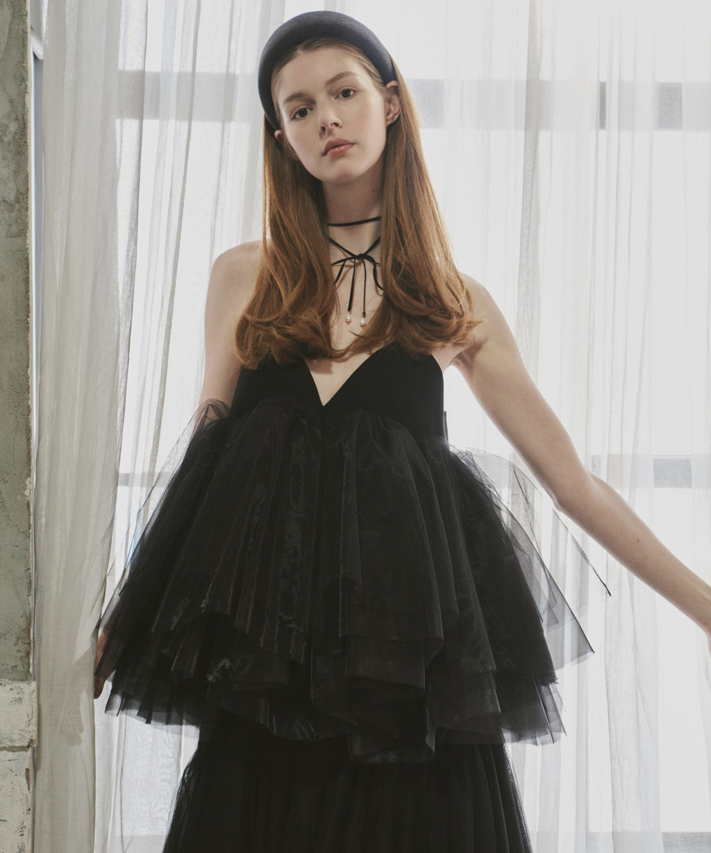 ハードチュール、オーガンジー、ソフトチュールを使ったエアリーな見え方と着心地がポイント。