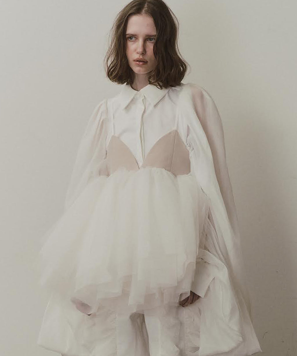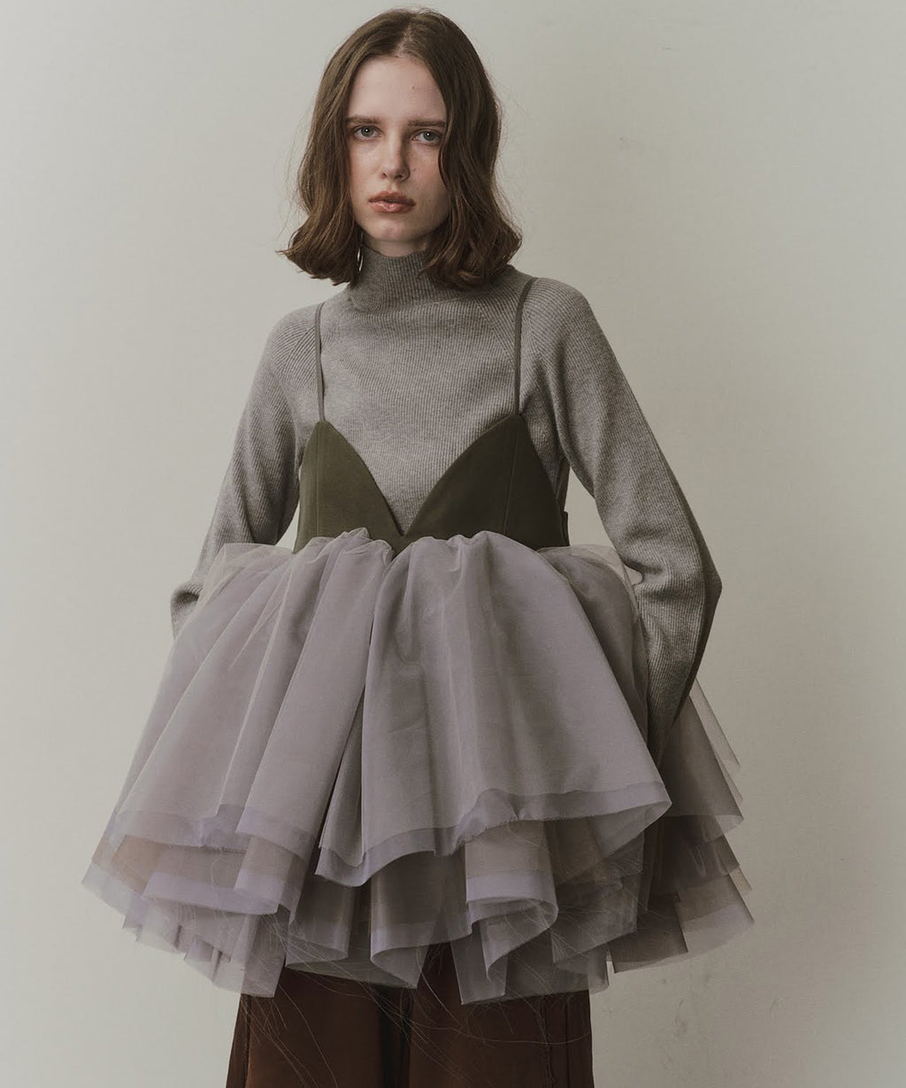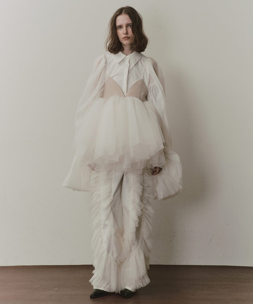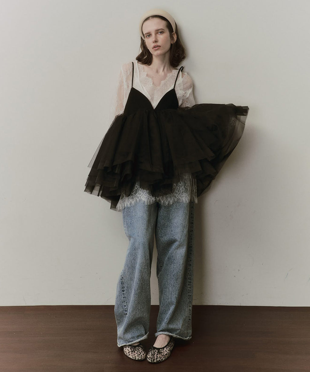 ハードチュール、オーガンジー、ソフトチュールを使ったエアリーな見え方と着心地がポイント。