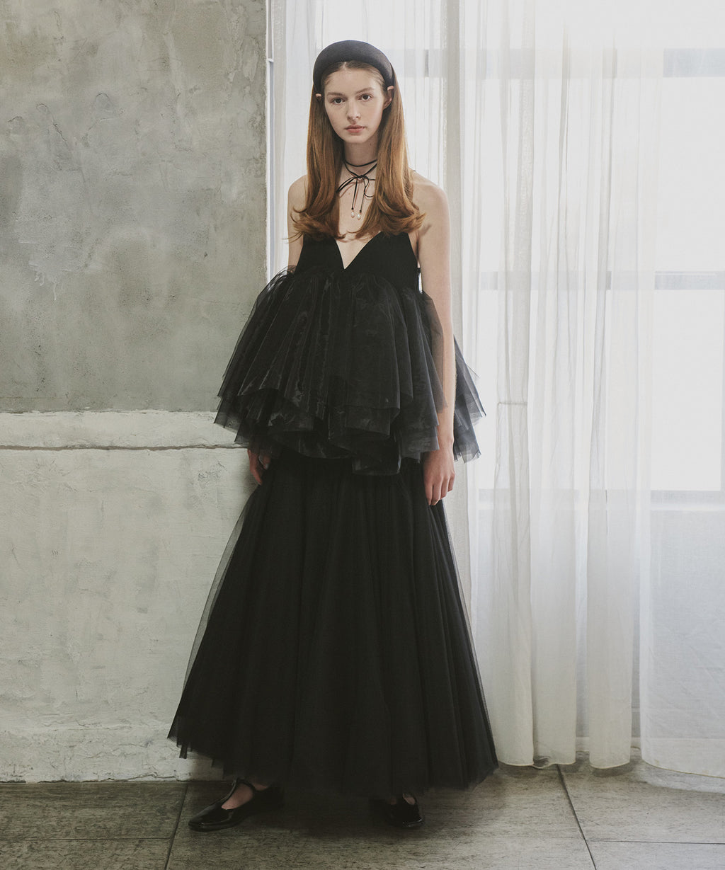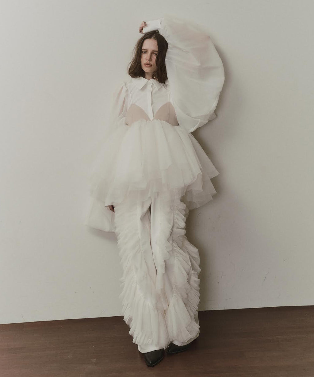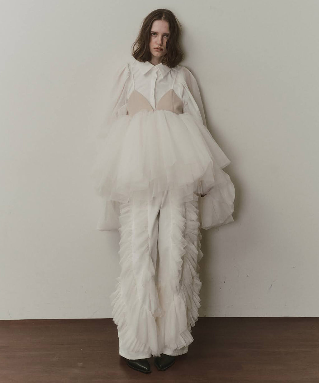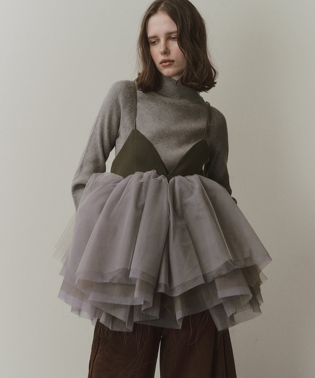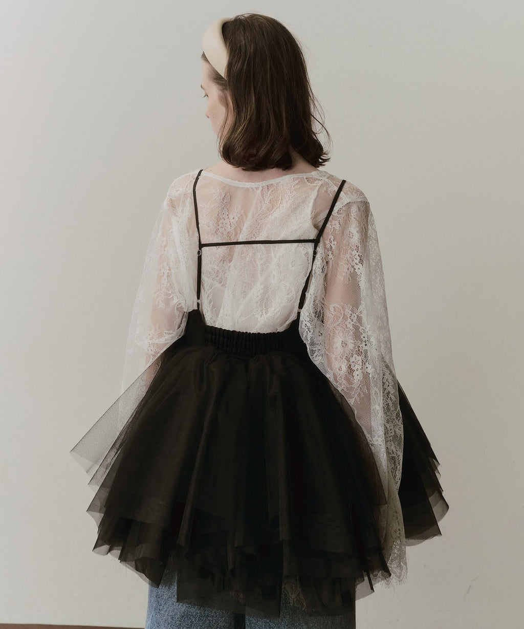 ハードチュール、オーガンジー、ソフトチュールを使ったエアリーな見え方と着心地がポイント。