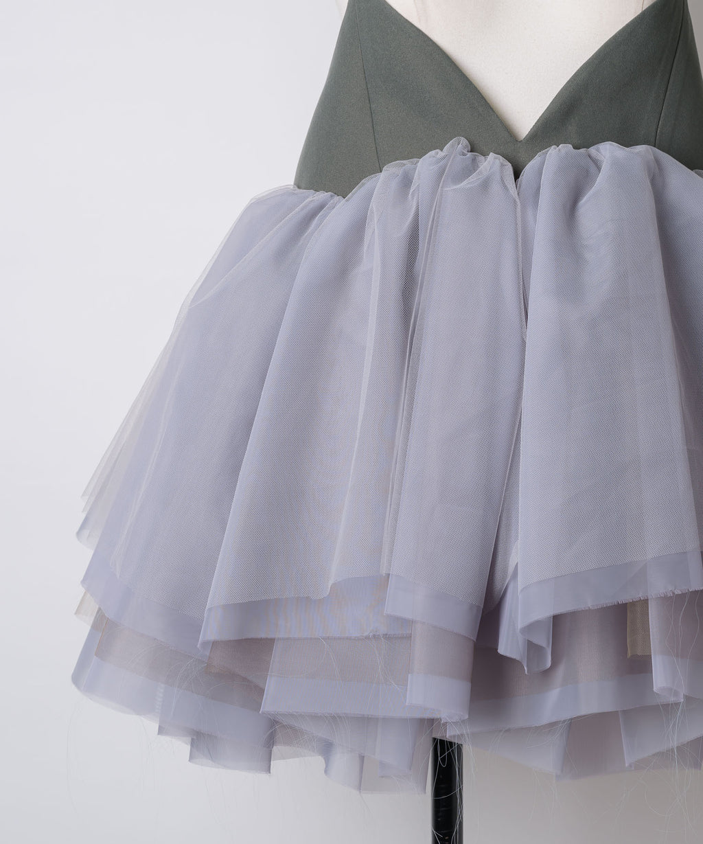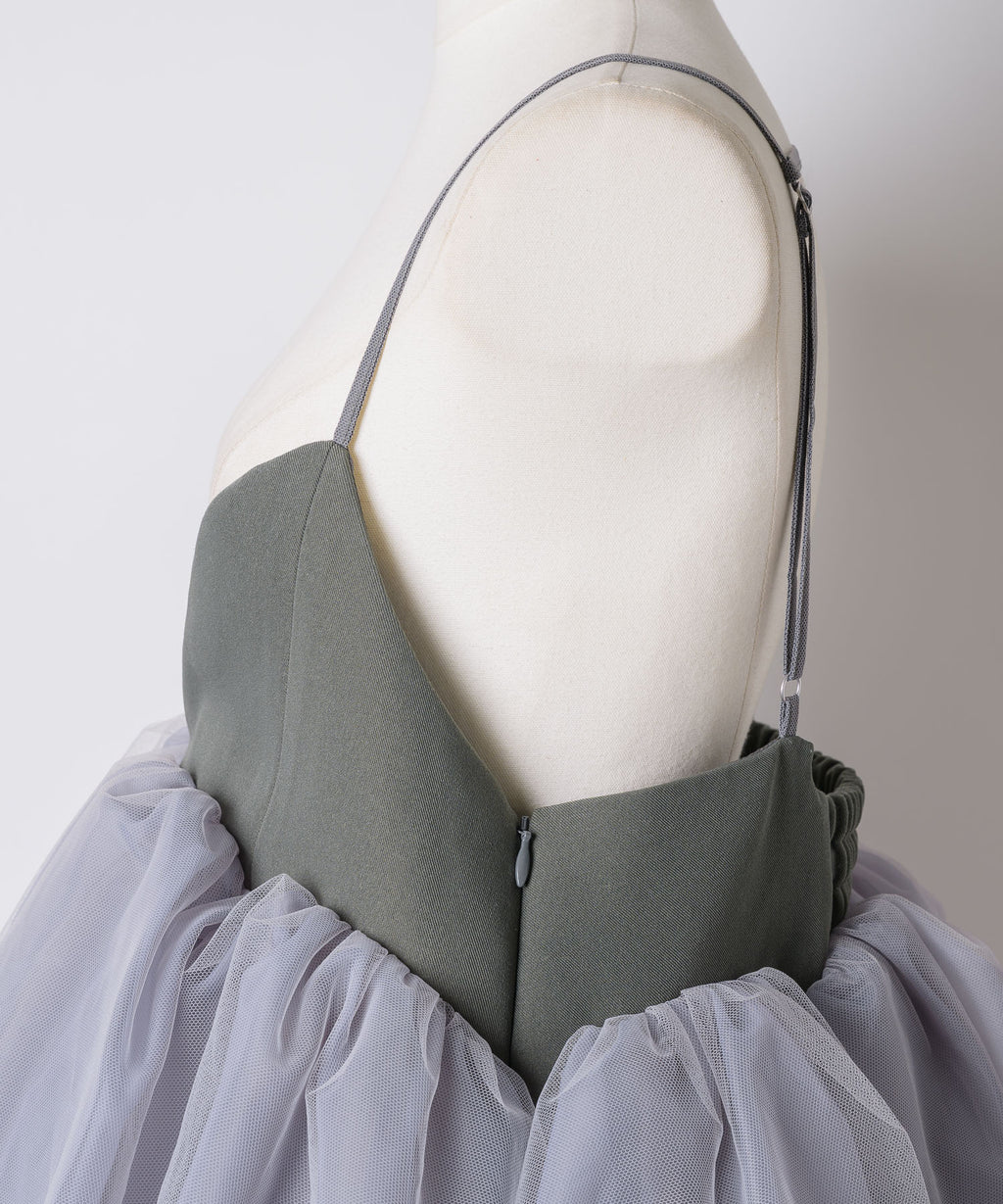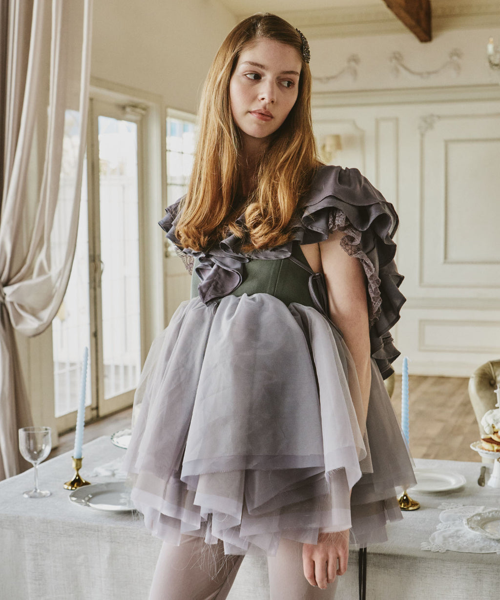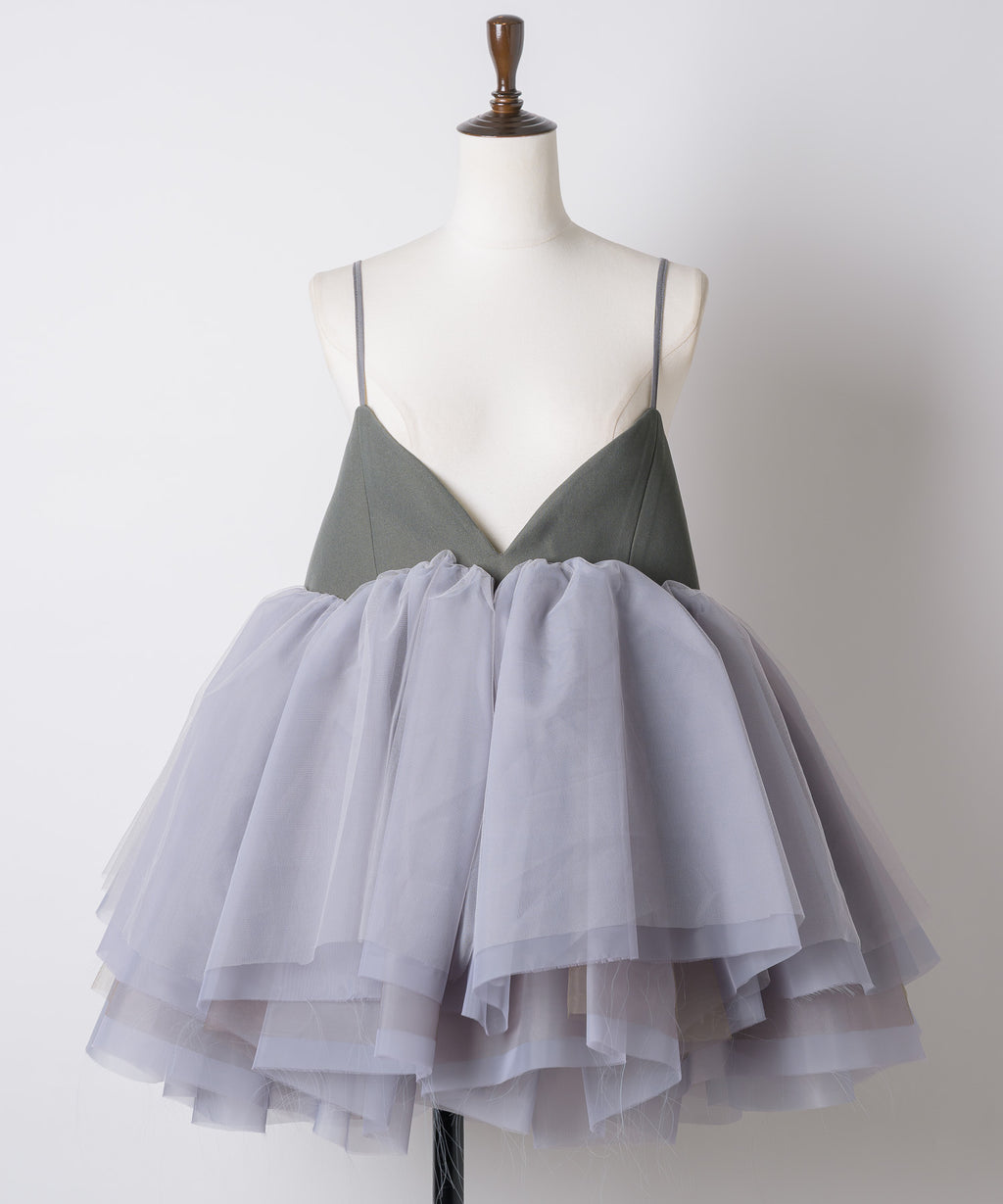 ハードチュール、オーガンジー、ソフトチュールを使ったエアリーな見え方と着心地がポイント。