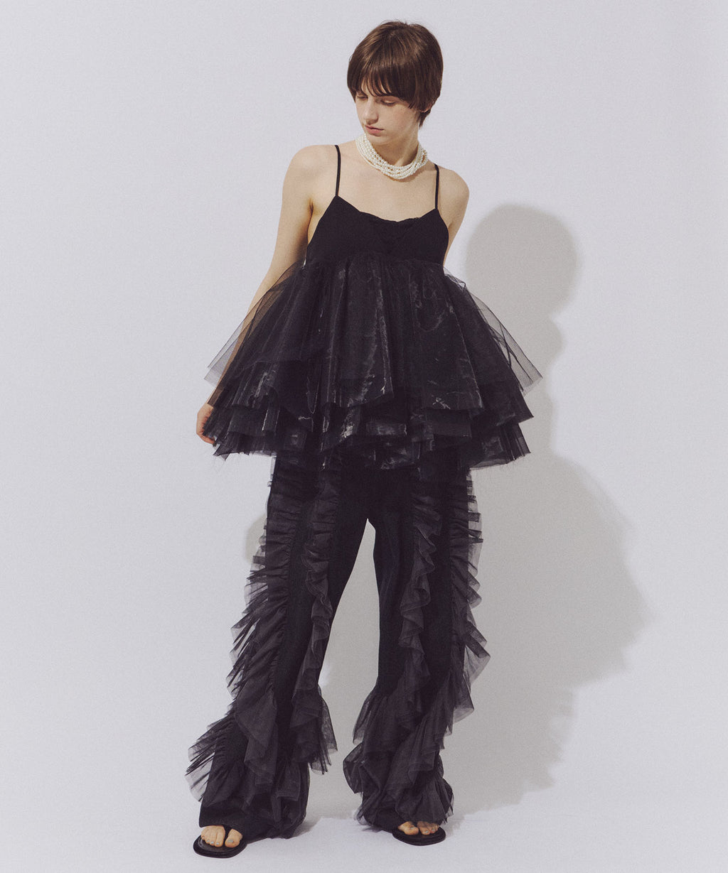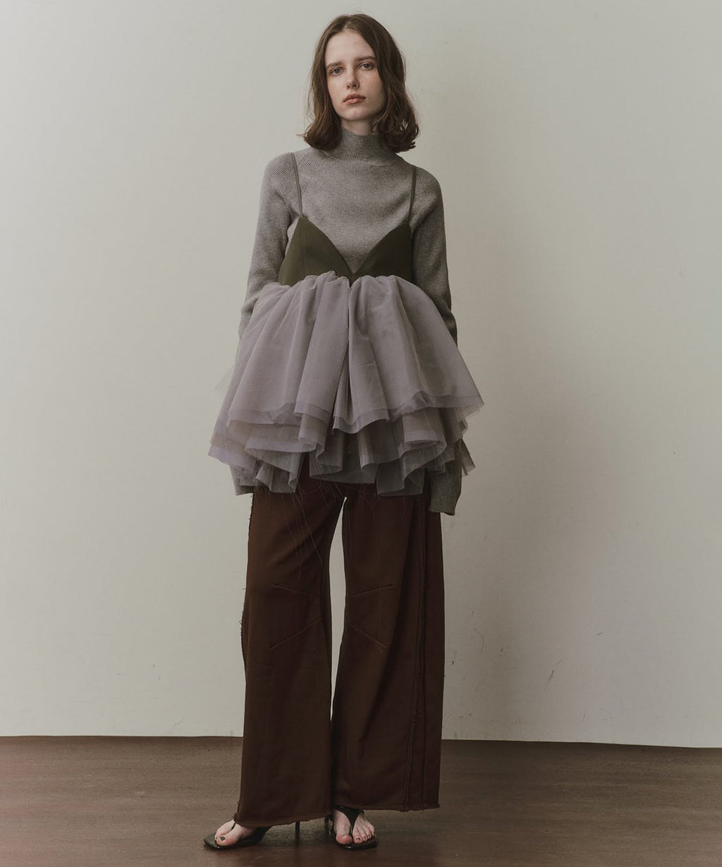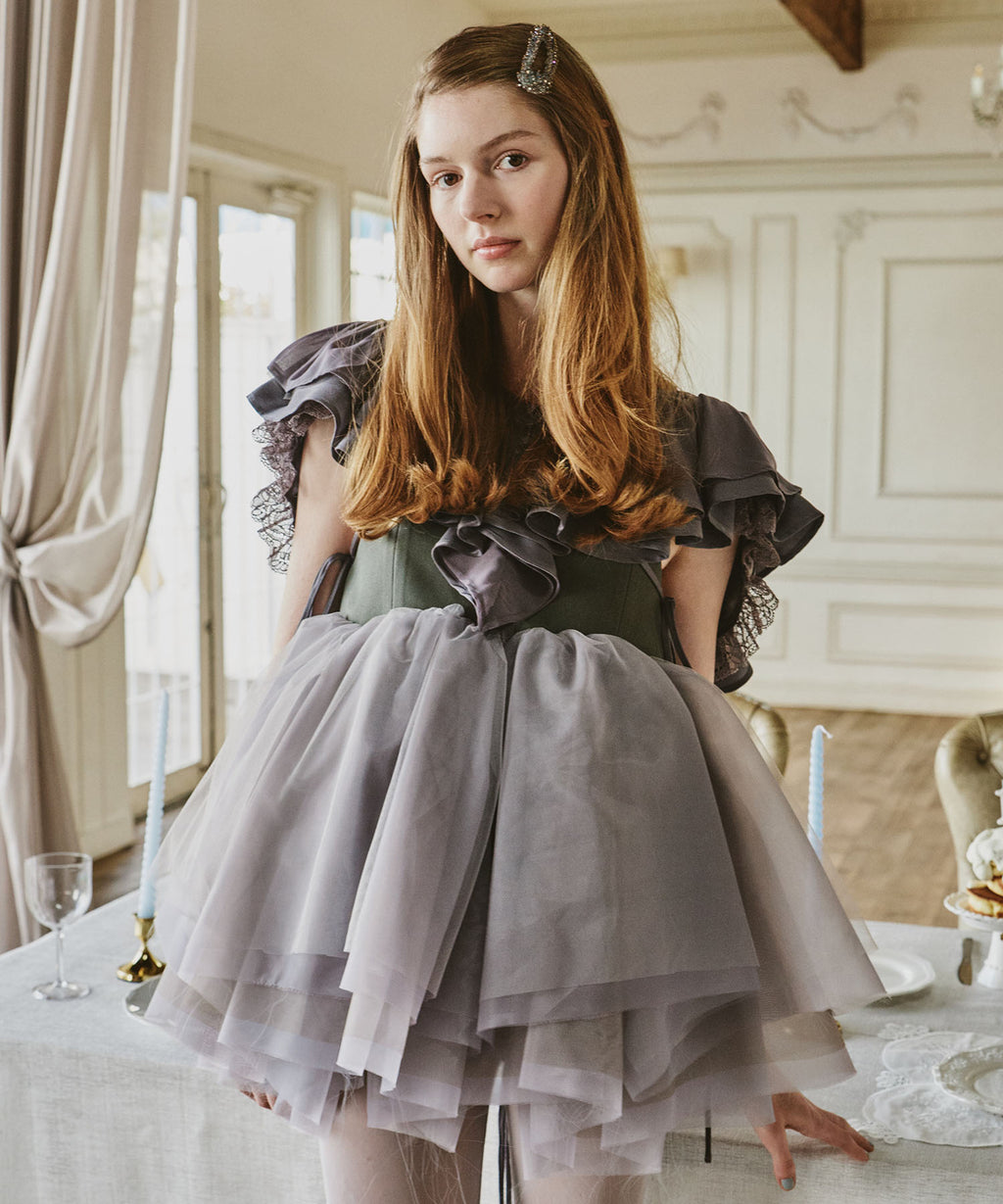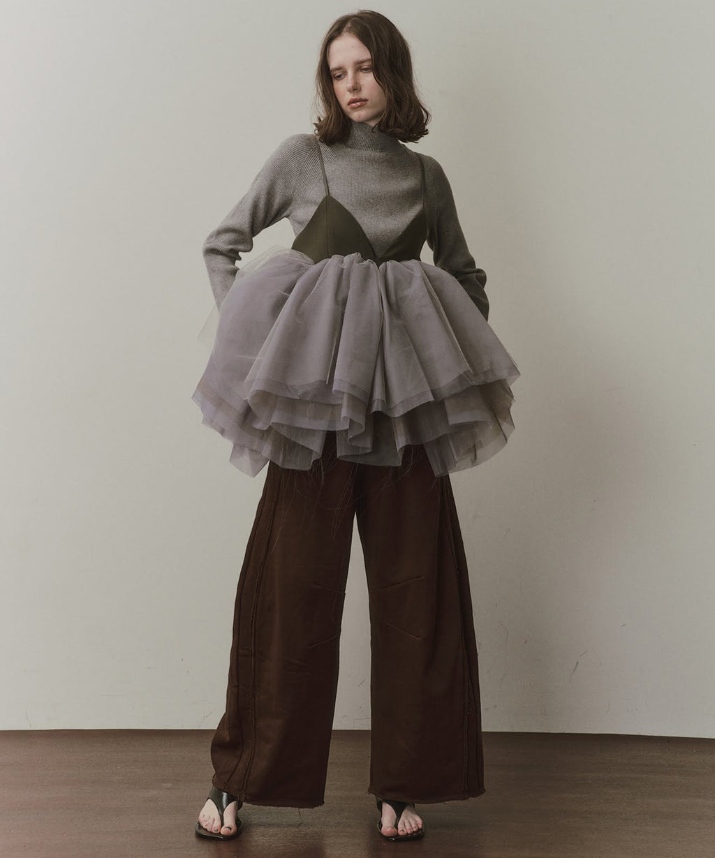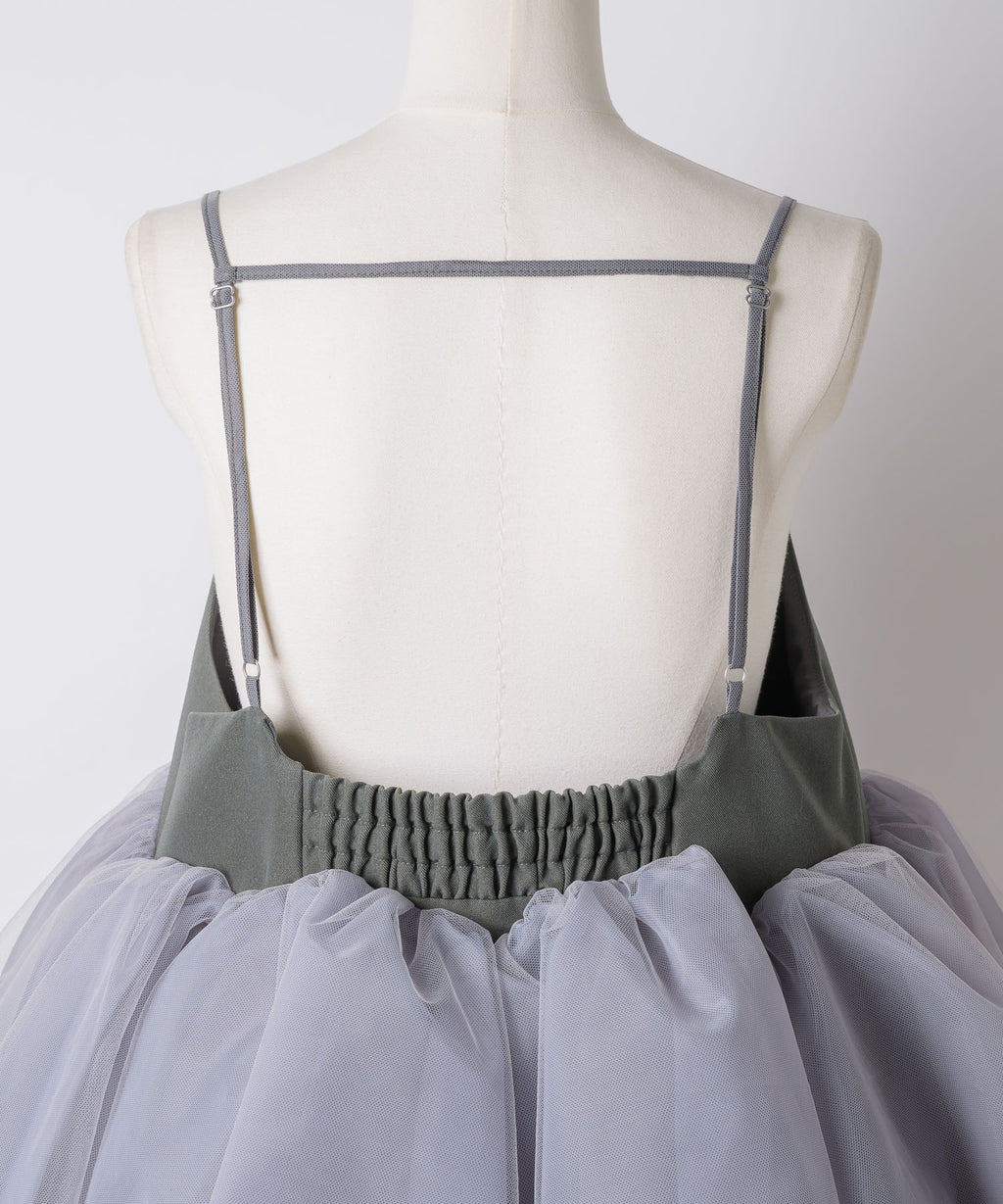 ハードチュール、オーガンジー、ソフトチュールを使ったエアリーな見え方と着心地がポイント。
